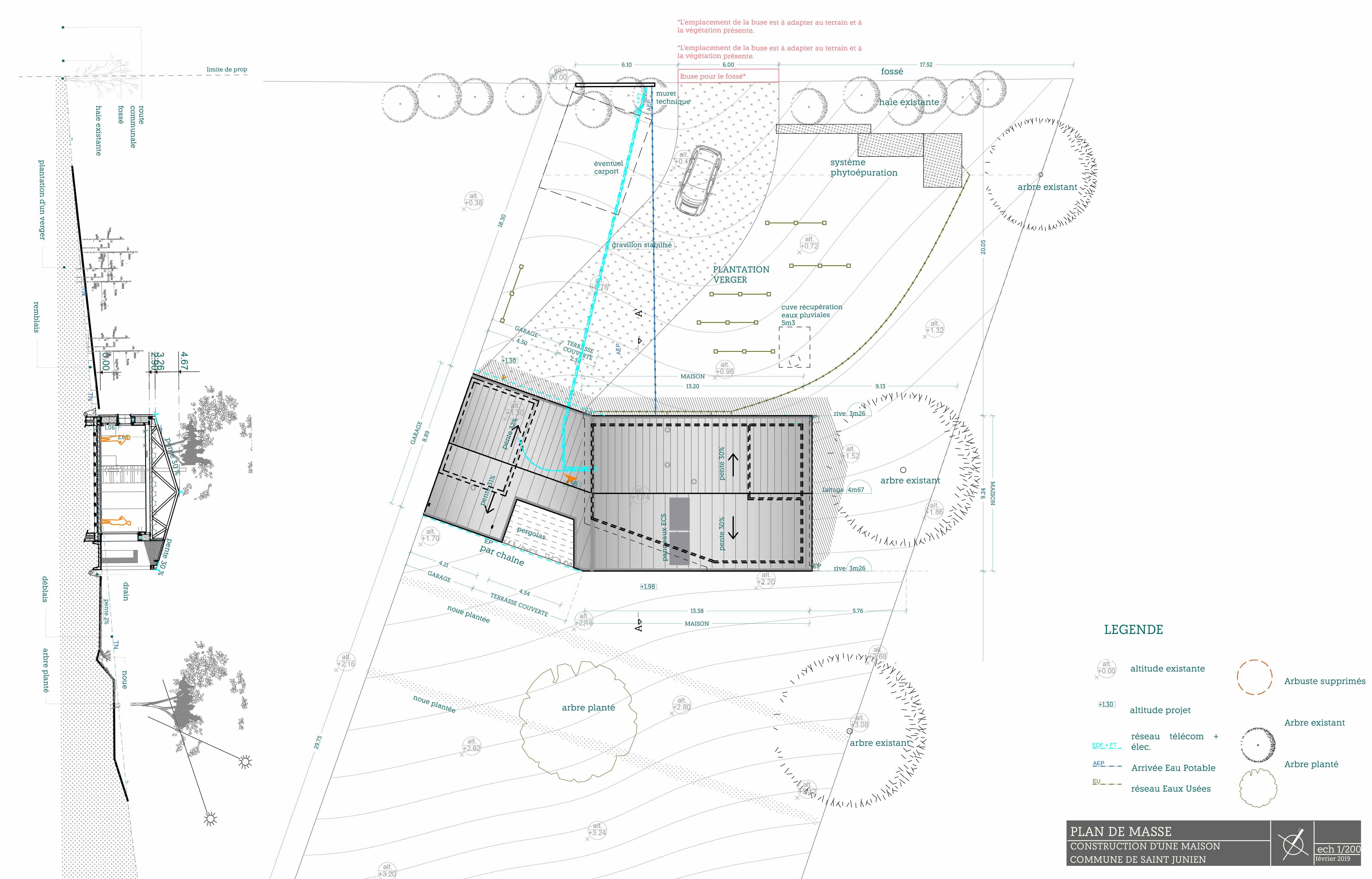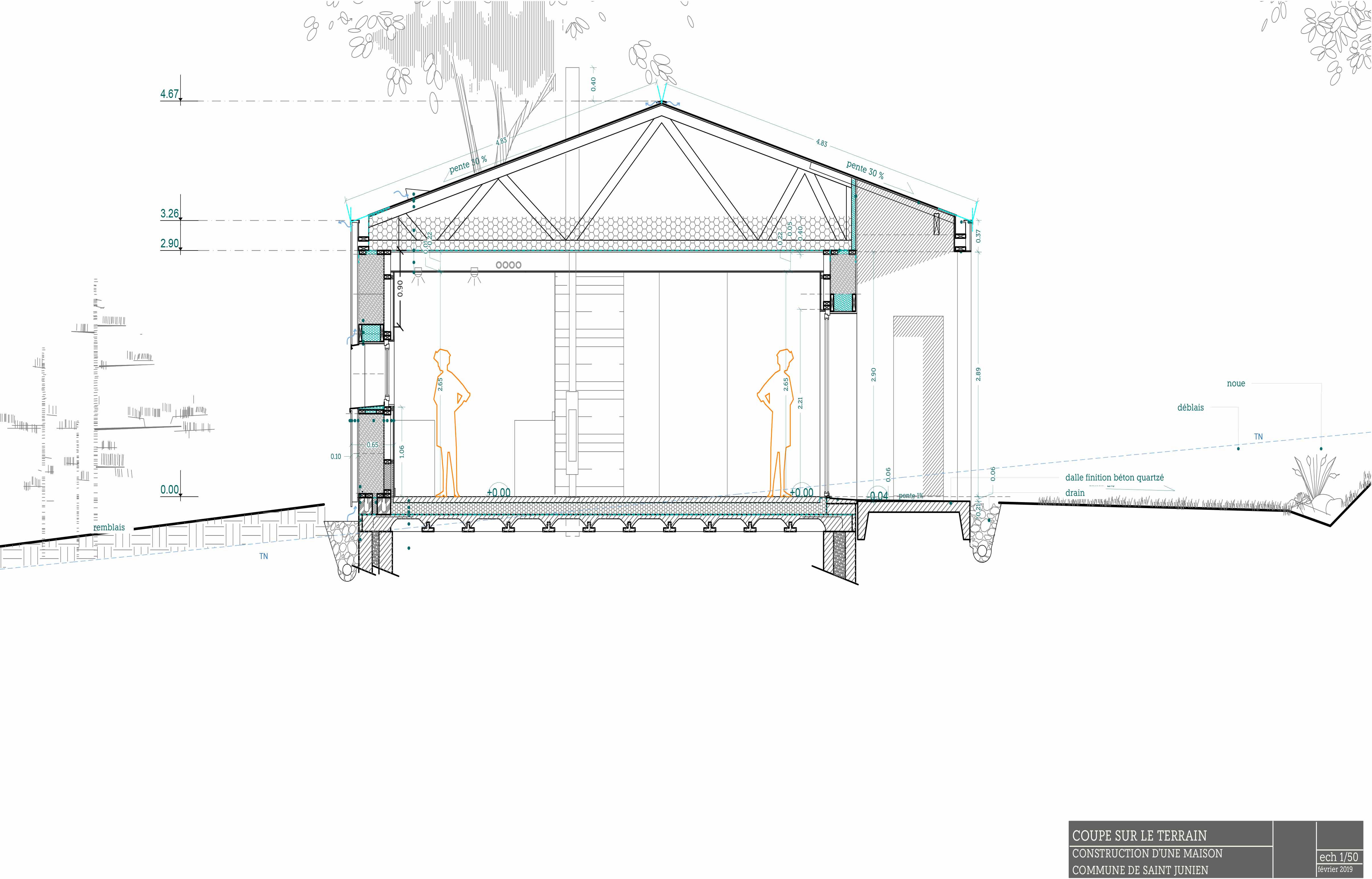 Située sur la commune de Saint-Junien, cette maison en Haute Qualité Environnementale est destinée à un jeune couple avec enfant soucieux de l'environnement et de leur cadre de vie. La typologie simple organise sur un même niveau un volume d’habitation en partie Est et une forge/atelier à l’Ouest, de part et d’autre d’un espace extérieur protégé intégrant séquence d’entrée et terrasse. Une toiture continue à deux pans, lie l’ensemble et intègre une treille végétale en partie Sud au-dessus de la terrasse. Le volume unique horizontal, s’insère dans le paysage et la pente naturelle du terrain,