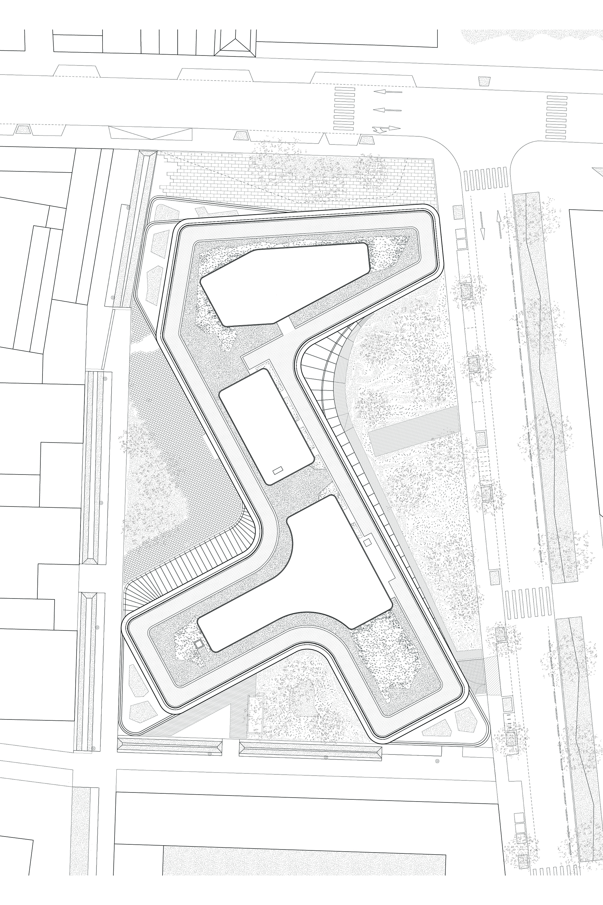 Cette opération de bureaux en blanc est conçue dans un esprit de grande compacité. Le bâtiment s’étire dans la diagonale de son terrain d’assiette, évitant tout vis-à-vis. Cette disposition dégage deux grands jardins en pleine terre qui offrent un linéaire boisé important sur la rue. L’un des deux est longé par une galerie – espace bioclimatique – qui valorise l’espace de restauration ; l’autre est un lieu de représentation. La répartition des masses bâties et des jardins est envisagée dans une relation de perméabilité : les espaces extérieurs fertilisent les espaces publics environnants.