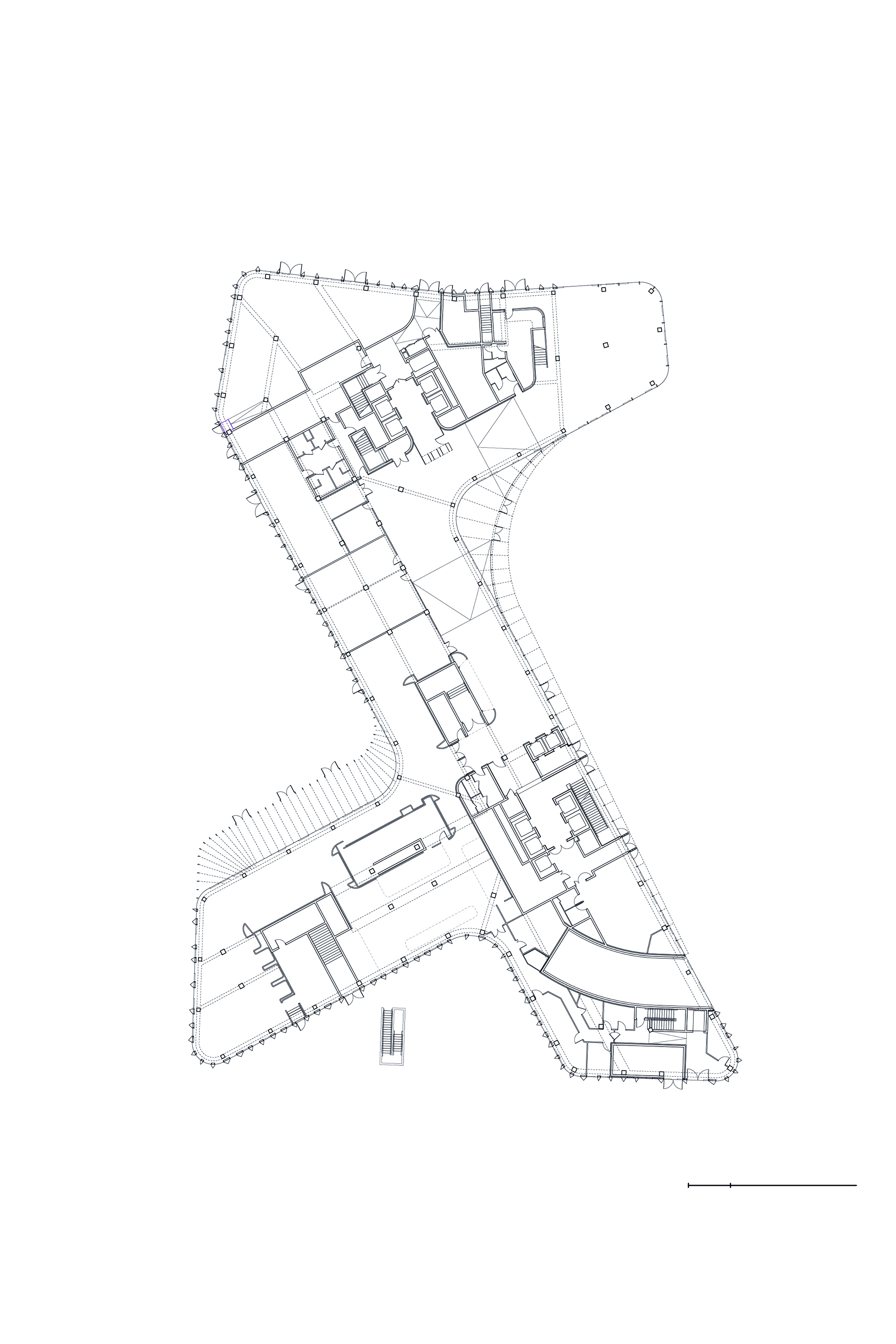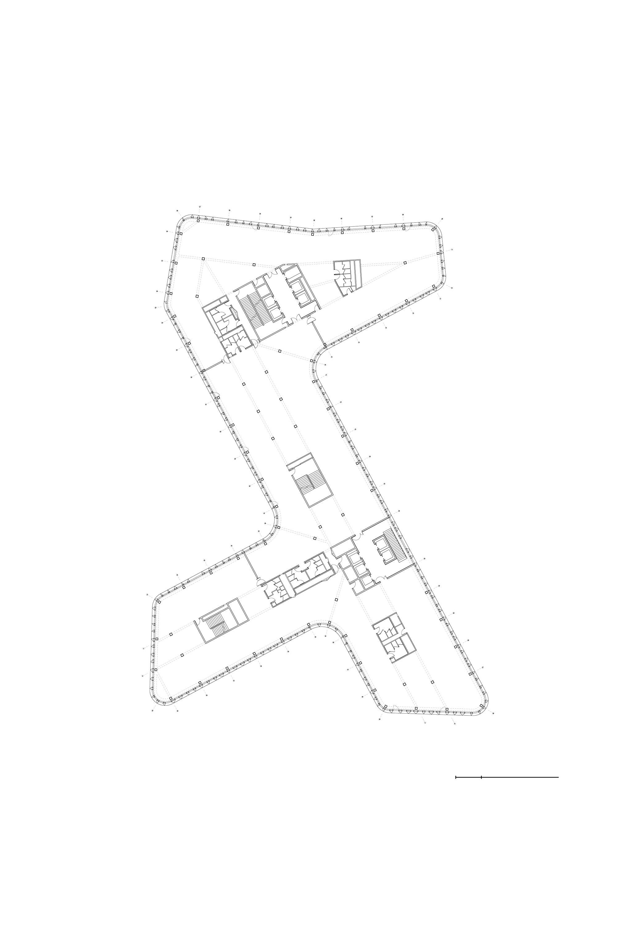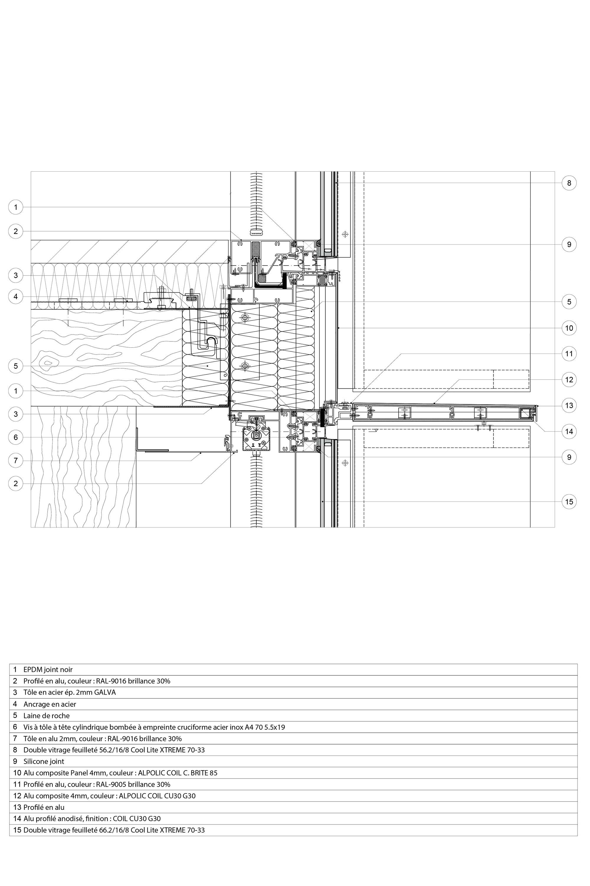 Descriptif technique : L’ensemble du projet est conçu en structure mixte, majoritairement bois, permettant une grande flexibilité des plateaux. Ils s'articulent autour de plusieurs noyaux centraux en béton qui contreventent le bâtiment, et reposent sur un squelette en poteau-poutre. Des poutres cintrées en bois lamellé-collé ont été fabriquées spécifiquement. Les matériaux sont utilisés pour ce qu’ils sont et se révèlent dans chaque espace de manière authentique. En façade, l'assemblage d'épines métalliques en aluminium anodisé conçues comme brise soleil provoque un effet cinétique dans le jeu des reflets. PEFC (Gestion forestière durable) NF Bâtiments Tertiaires Démarche HQEe