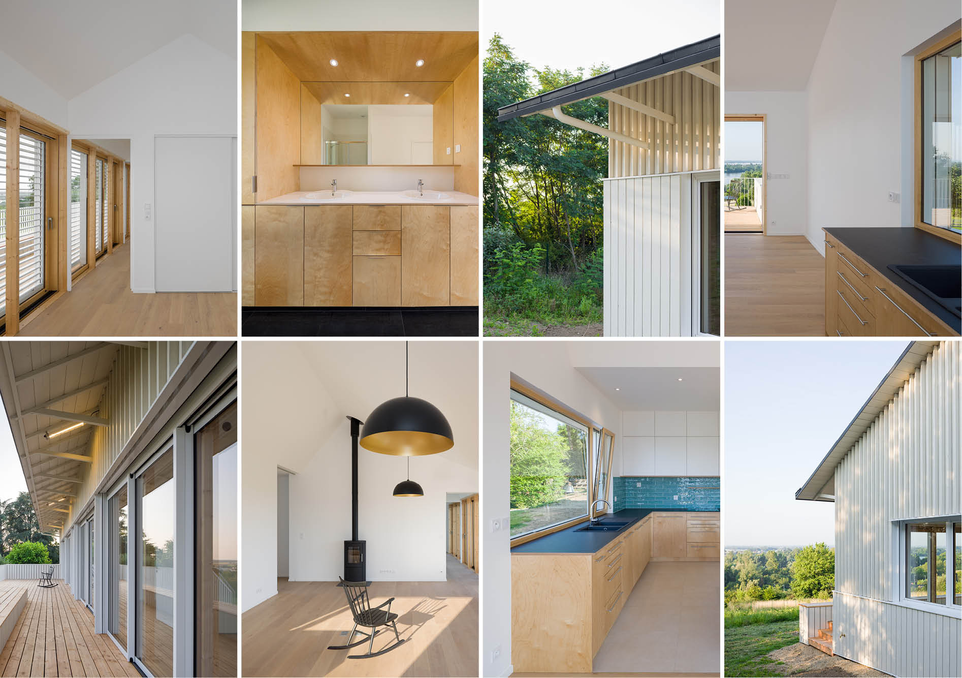 Descriptif technique : Cette maison est construite en ossature/charpente préfabriqué en bois massif sur fondations superficielles en béton, avec une inscription dans la pente au plus fine minimisant les remblais/déblais. Les détails et l’assemblage du bardage en douglas distinguent un soubassement en planches bord à bord et une pose en relief avec des planches sur la tranche pour le reste des surfaces. Les menuiseries sont mixtes bois-aluminium, elles intègrent des stores pour réguler l’apport de lumière en fonction des temporalités. Les toitures sont en zinc de teinte ardoise/anthracite avec des sous-faces en bois.