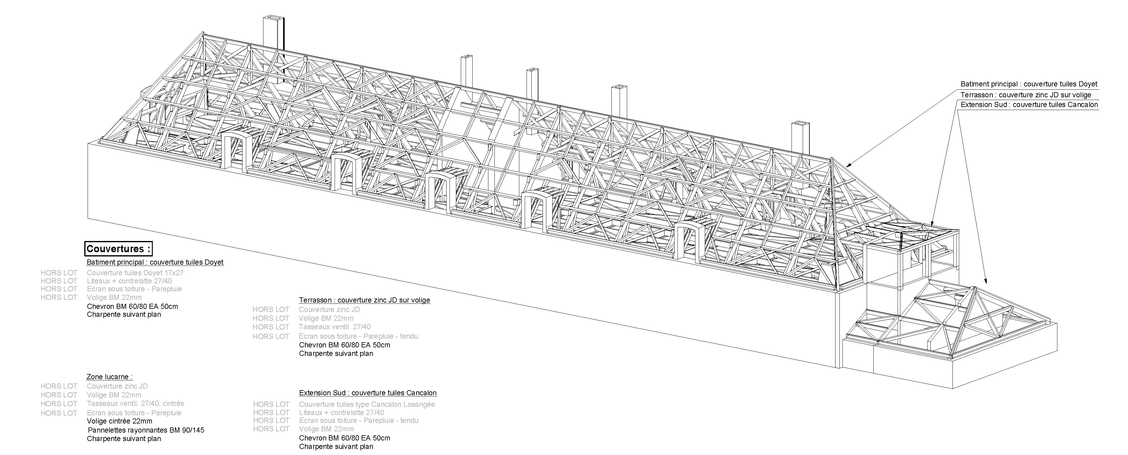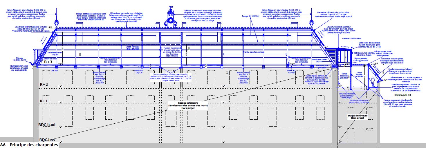 Descriptif technique : Les charpentes sont constituées de fermes en chêne. Les entraits des fermes, porteurs du plancher des combles, ont été réalisés en fers HEA 450 avec protection au feu 1H. Les solives entre fermes sont en bois lamellé collé. Les couvertures ont été refaites en tuiles plates en terre cuite de Doyet (03). Les lucarnes sont en pierre de taille et fermées par des menuiseries en bois. L'extension a été réalisée en ossature bois recouverte d'un bardage cuivre en partie basse. Les ouvrages de récupération des eaux pluviales sont également en cuivre, rappelant les ouvrages de l'abbatiale à côté. FSC (Gestion forestière responsable)