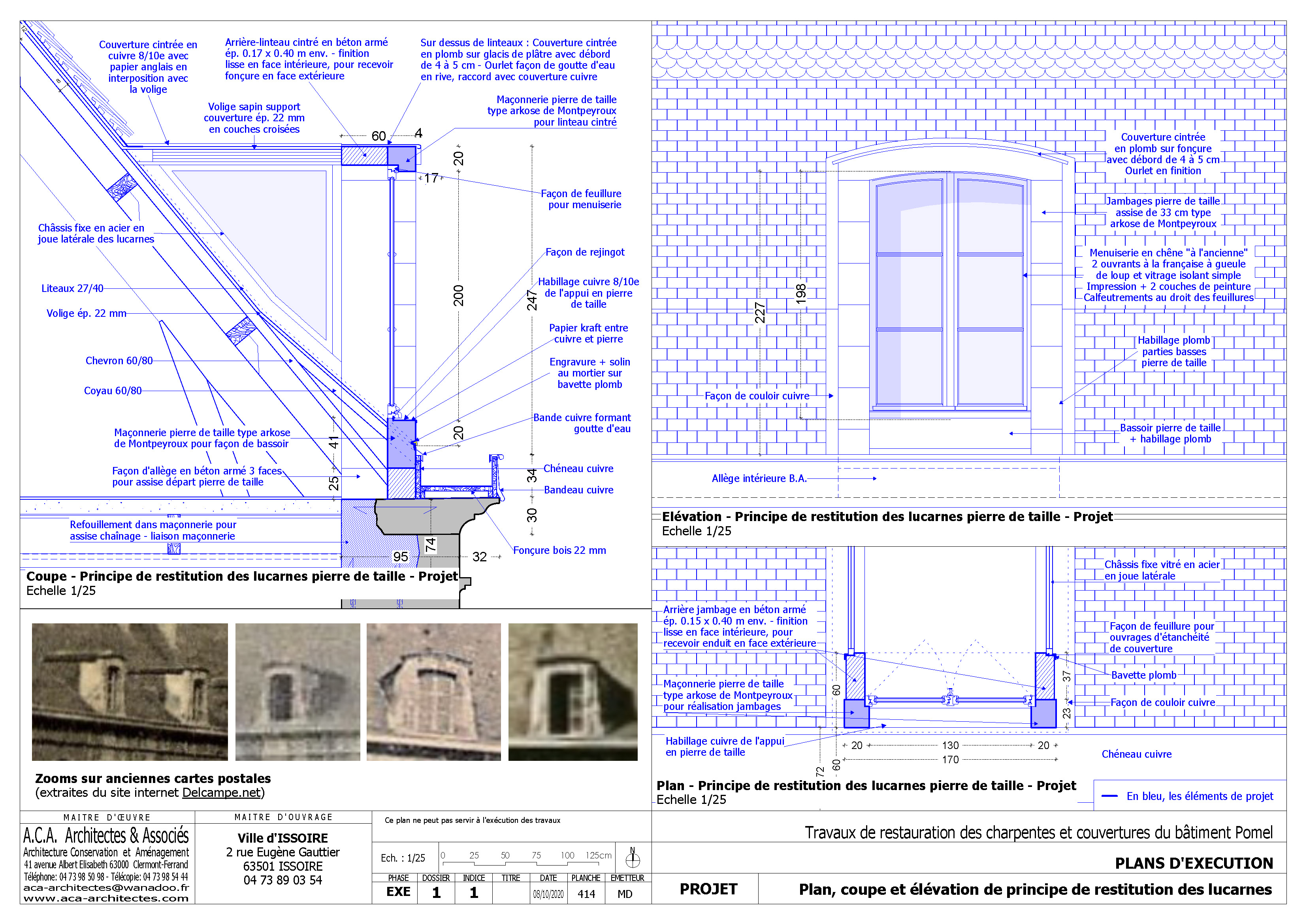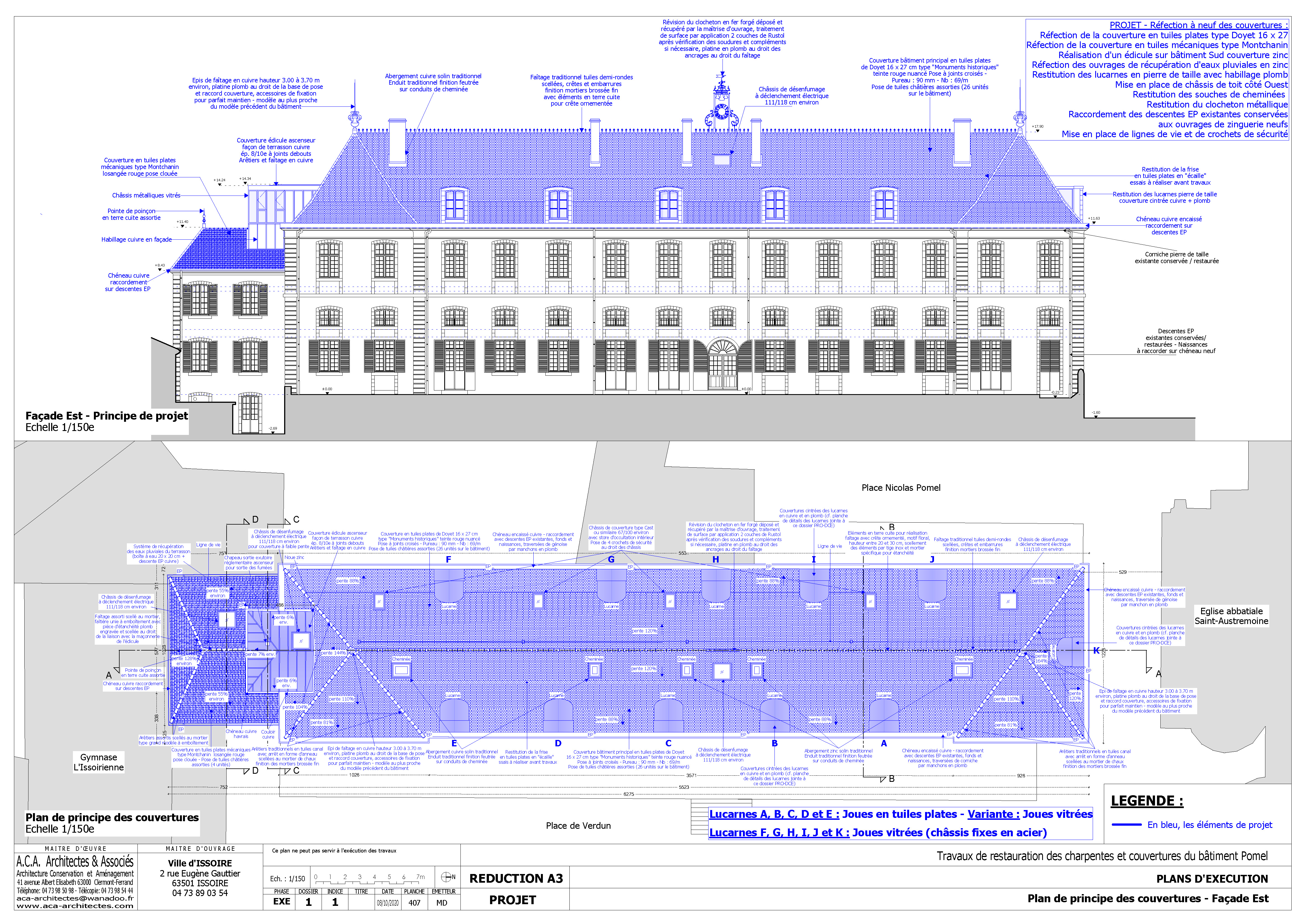 Le projet a consisté à la réfection à neuf des couvertures et charpentes du centre Nicolas Pomel, situé à Issoire (63500), qui ont été détruites suite à un incendie survenu en janvier 2019. Les travaux comprenaient également la restitution des lucarnes, disparues avant l'incendie, et à la réalisation d'un plancher au niveau des combles, qui seront accessibles au public dans le cadre d'un futur projet de réaménagement du bâtiment en centre culturel. Un édicule, émergeant en toiture, a été réalisé pour la liaison du niveau des combles du bâtiment Pomel et avec son bâtiment annexe.