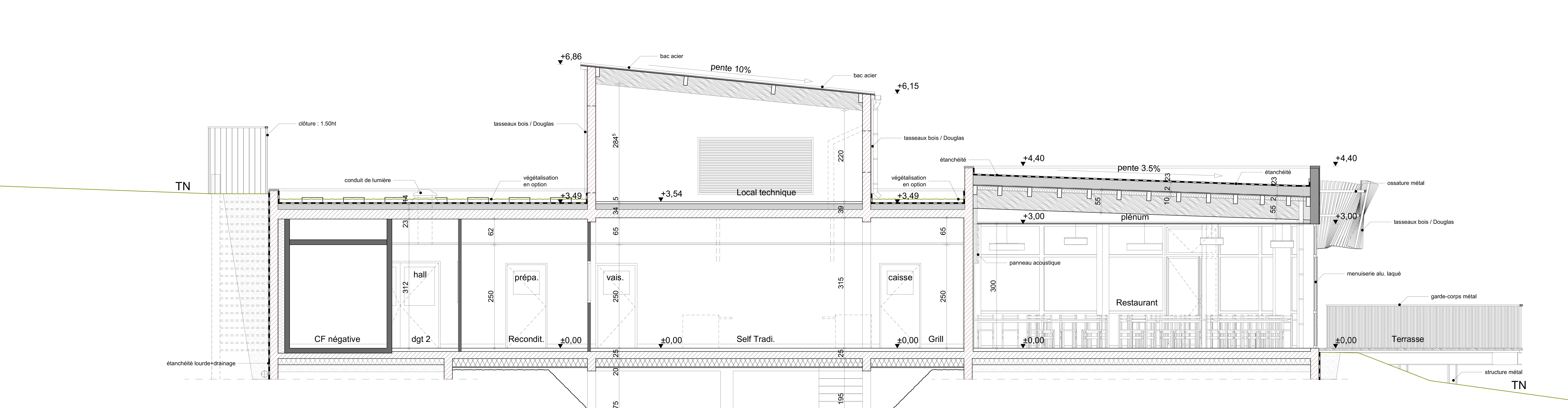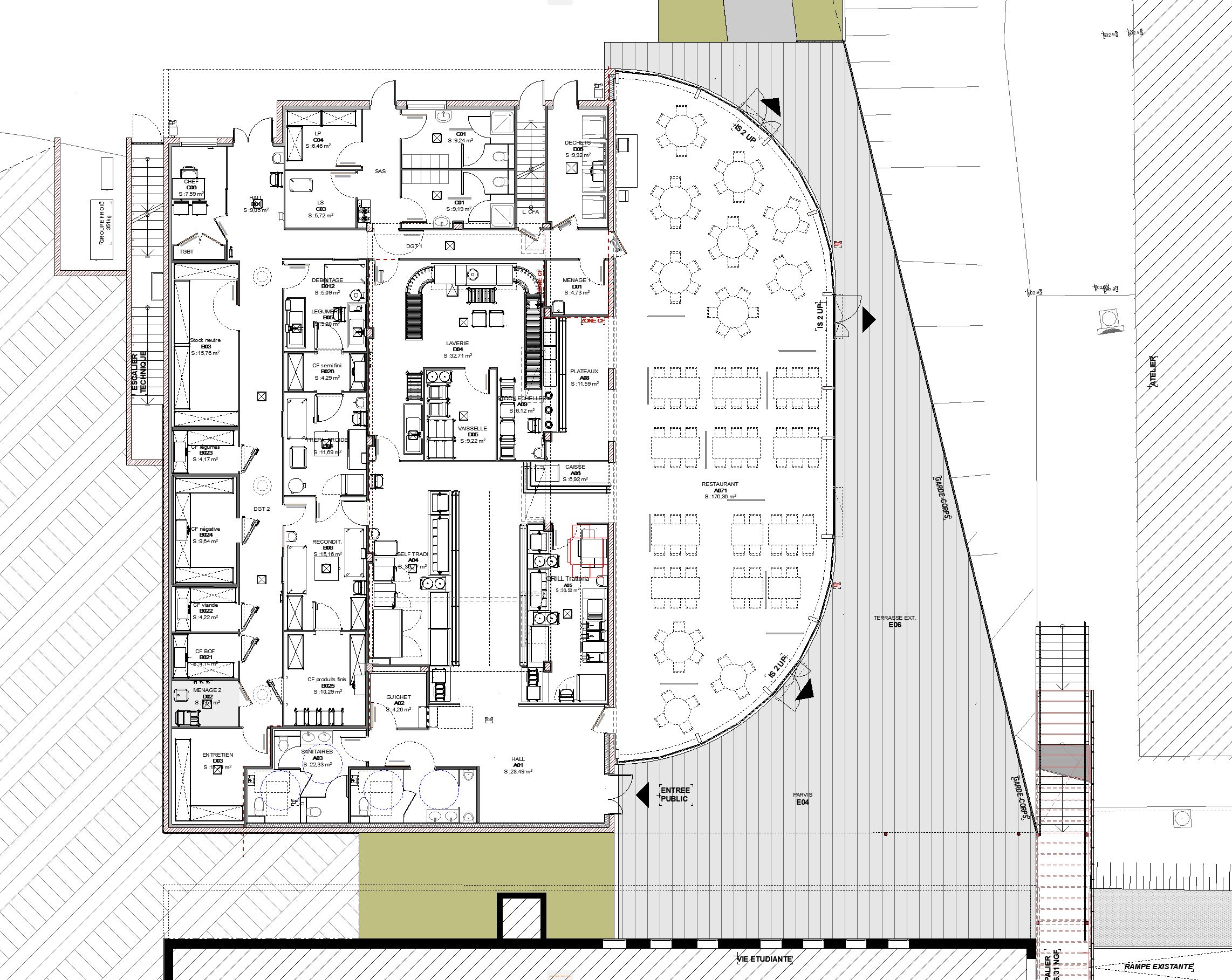Il s’agit de construire un restaurant universitaire pour les étudiants de l’IUT mais aussi pour les BTS se trouvant au lycée P. Caraminot d’Egletons. Les volumétries sont simples. Un travail important sur la façade du restaurant est fait afin qu’il soit facilement identifiable dans le site. Le bâtiment vient s’encastrer dans le talus existant, la toiture terrasse des cuisines venant en prolongement du terrain existant afin de minimiser l’impact du bâti. Un escalier permet l’accès aux locaux techniques se trouvant dans un édicule habillé de tasseaux bois (douglas). Un grand mur vitré permet d’identifier la salle de restaurant. La structure de la salle de restaurant est réalisée en ossature bois. Les menuiseries sont soulignées par un brise soleil. Celui-ci forme une sorte de voile de bois reliant l’entrée du bâtiment à la salle de restaurant. La toiture du restaurant est à faible pente, avec une étanchéité, afin de ne pas avoir un volume trop imposant.