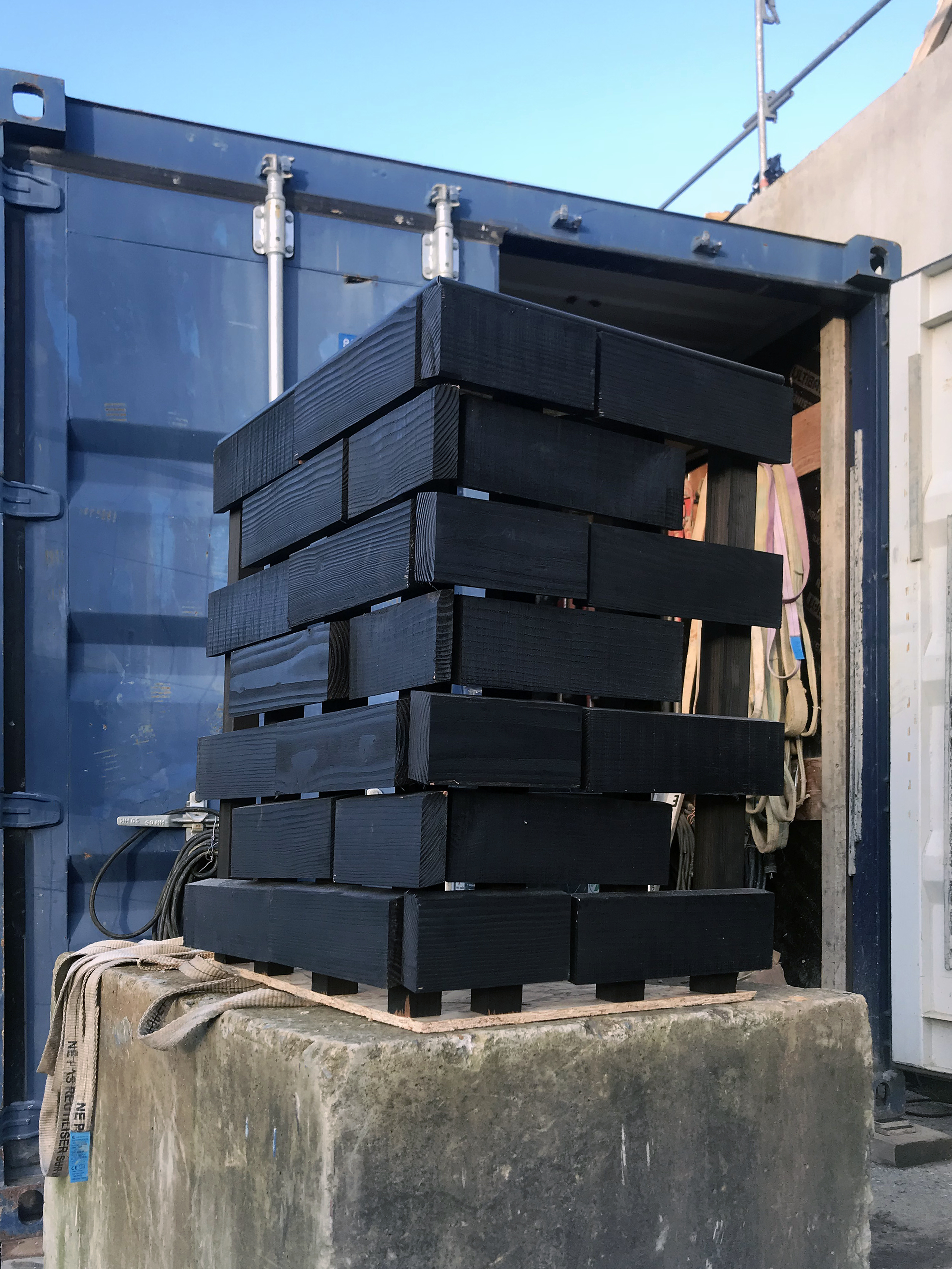 Mais de près, l'évident amoncèlement minéral ne l'est plus du tout. Des nœuds, des veines, des reflets apparaissent et révèlent la vraie nature de la construction, le bois!