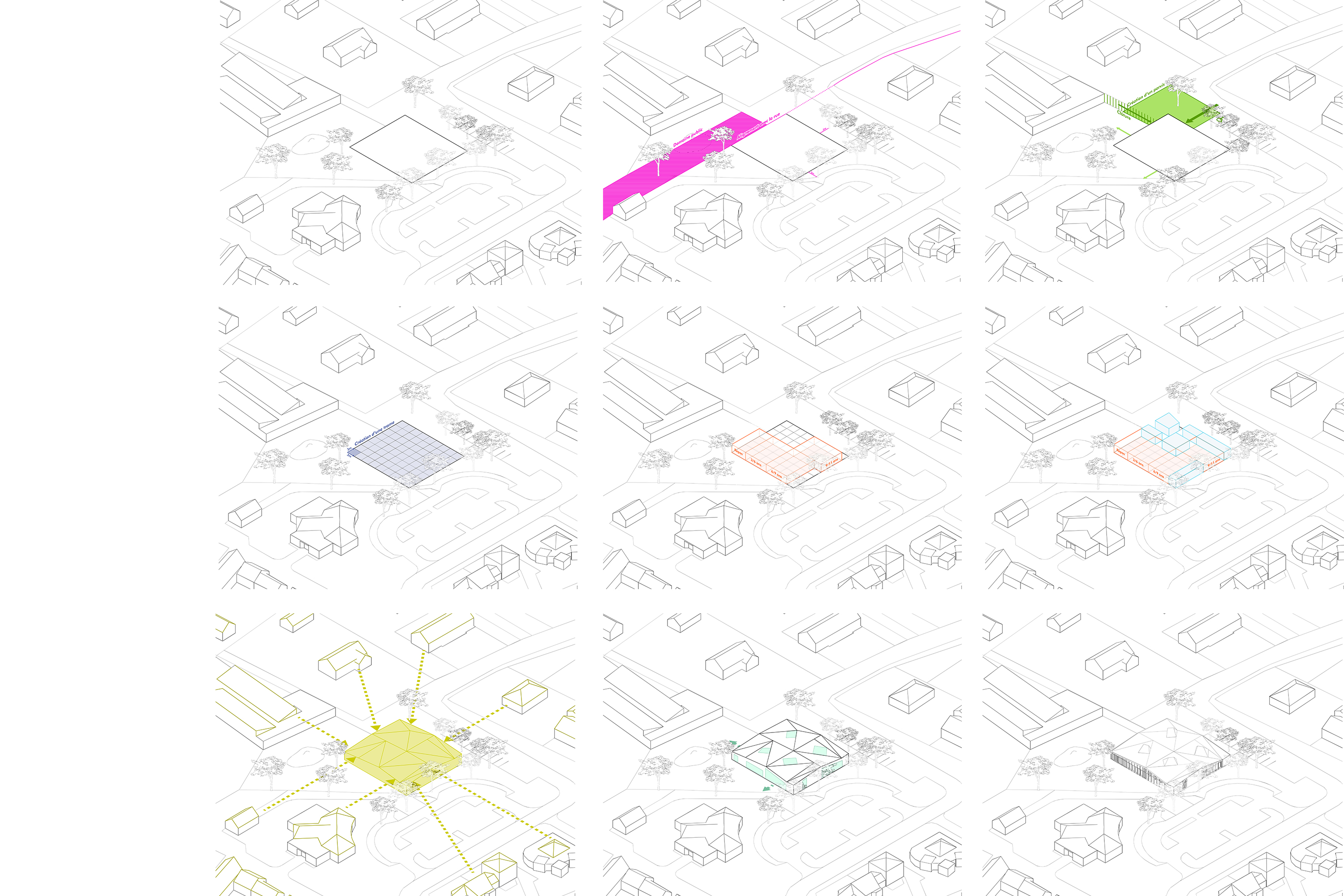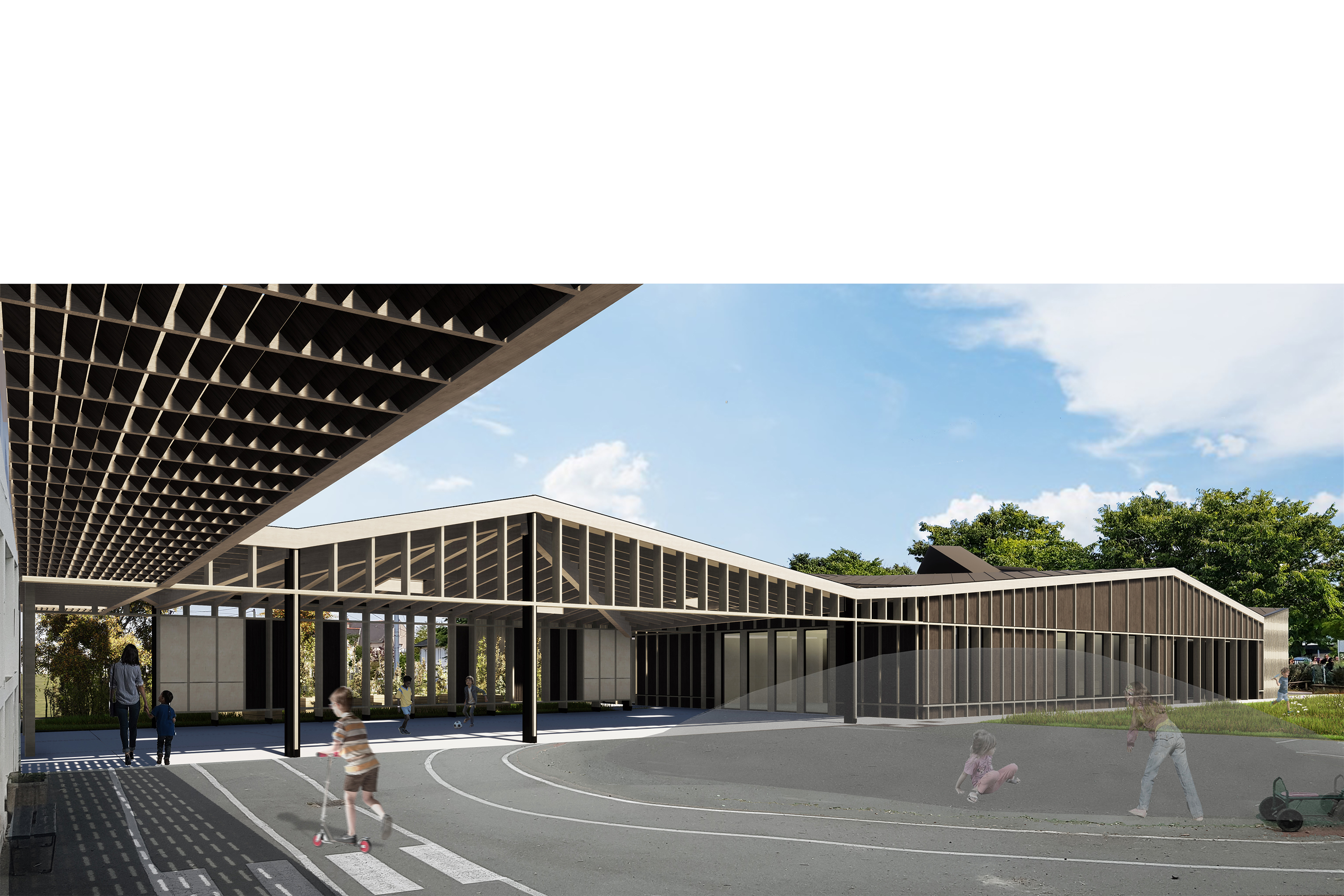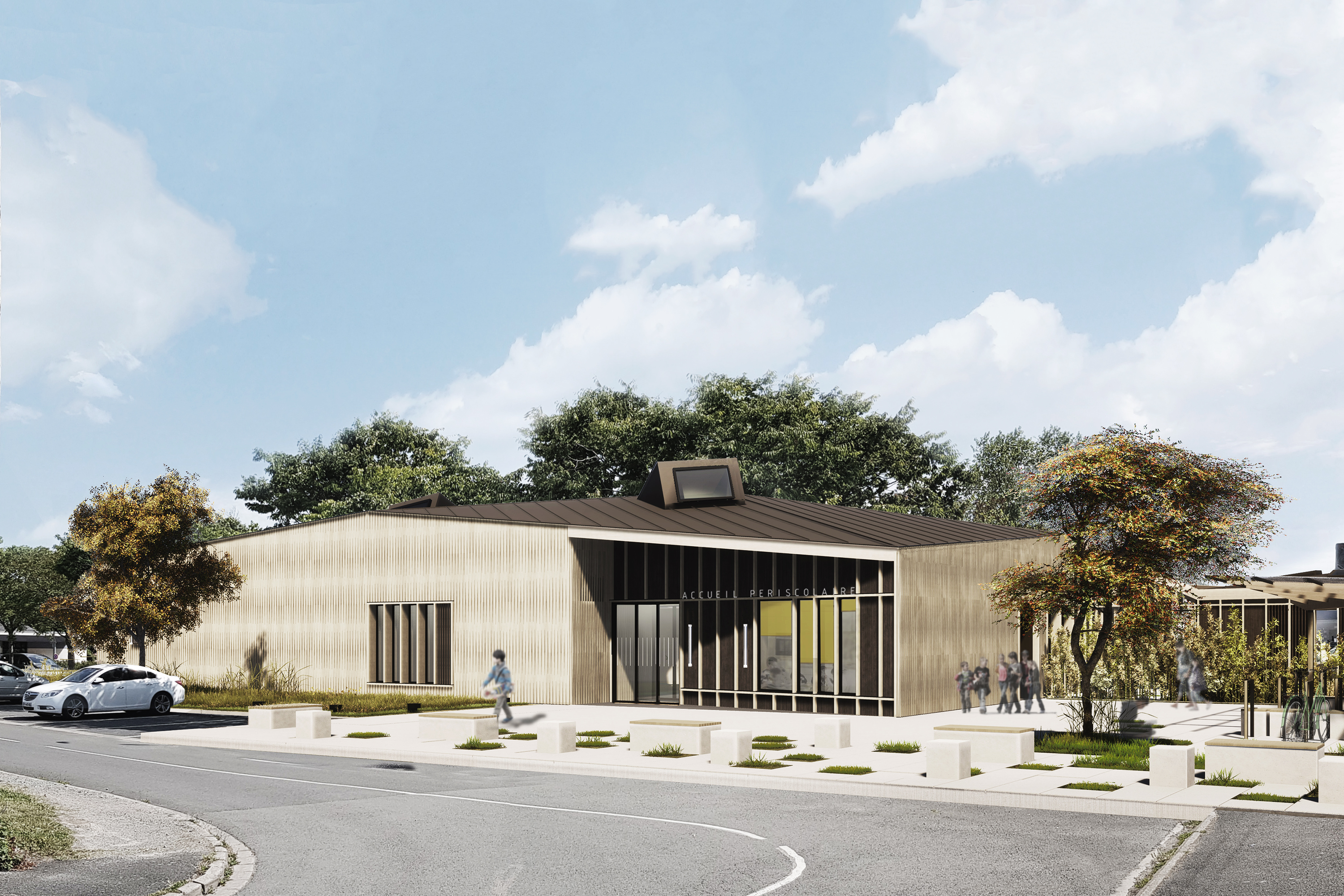 Situé au cœur du pôle scolaire du Plessis Grammoire en frange d’un quartier pavillonnaire diffus, la nouvelle construction doit s’inscrire dans un parcellaire contraint. Empreint de l’étymologie du nom de la commune « Plessis » qui se traduit du latin « plectare » , tresser, entrelacer de branches, le périmètre du bâtiment reconstitue la clôture de la cour initiale, son bardage est ainsi traité en tasseaux de bois verticaux alternés reprenant l’esthétique des haies de bois d’osiers plessés. Cette nouvelle enveloppe dévoile sa structure primaire et s’ouvre au droit de l’entrée principal et des espaces d’activités sur la cour. De part la compacité du bâti de plein pied, un jeu de toiture en origami reprend la diversité confuse des toitures environnantes, il contribue à la variété des volumes intérieurs et anime les élévations en rapport avec le plan fonctionnel.