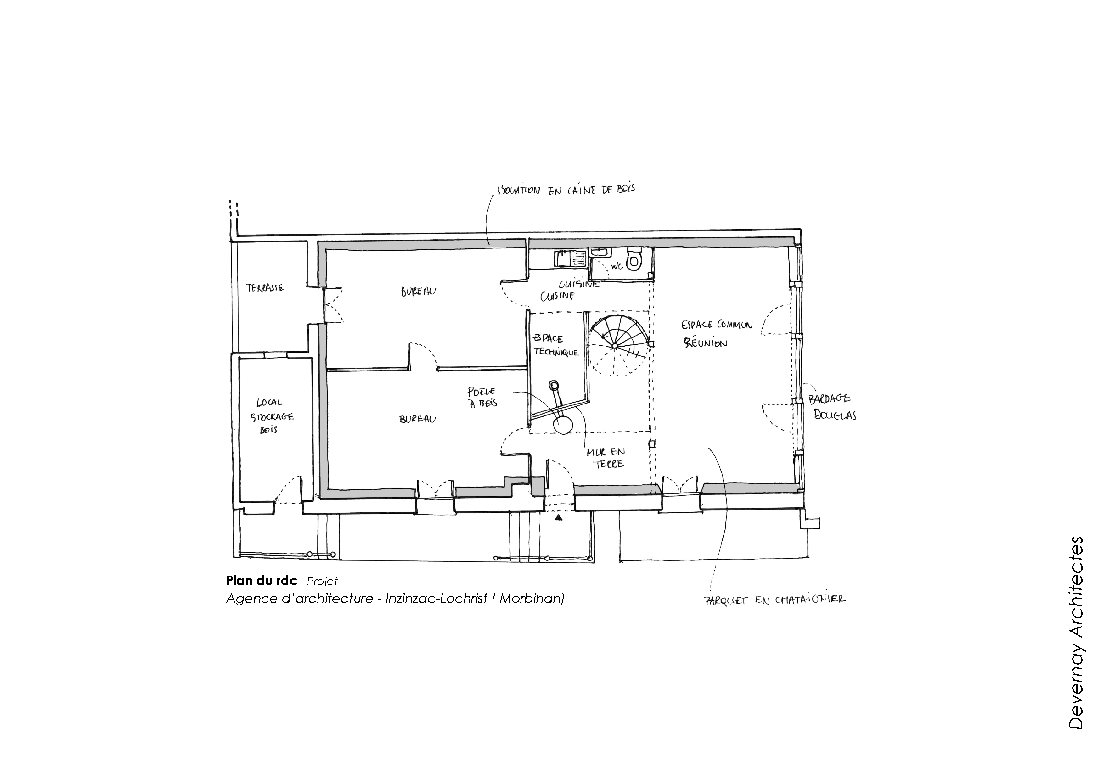 Réhabilitation d'un bâtiment issu d'un hangar industriel en agence d'architecture. Ce projet s'inscrit dans la continuité de l'architecture de site des forges d'Inzinzac-Lochrist. La toiture a été modifiée pour concevoir un espace très ouvert vers le sud et permettre un aménagement sur deux niveaux. Au rdc deux bureaux, sanitaire, cuisine et une salle de réunion; au R+1 un espace de co-working profitant de la volumétrie de la charpente. Le tout est aménagé avec du mobilier privilégiant le bois.