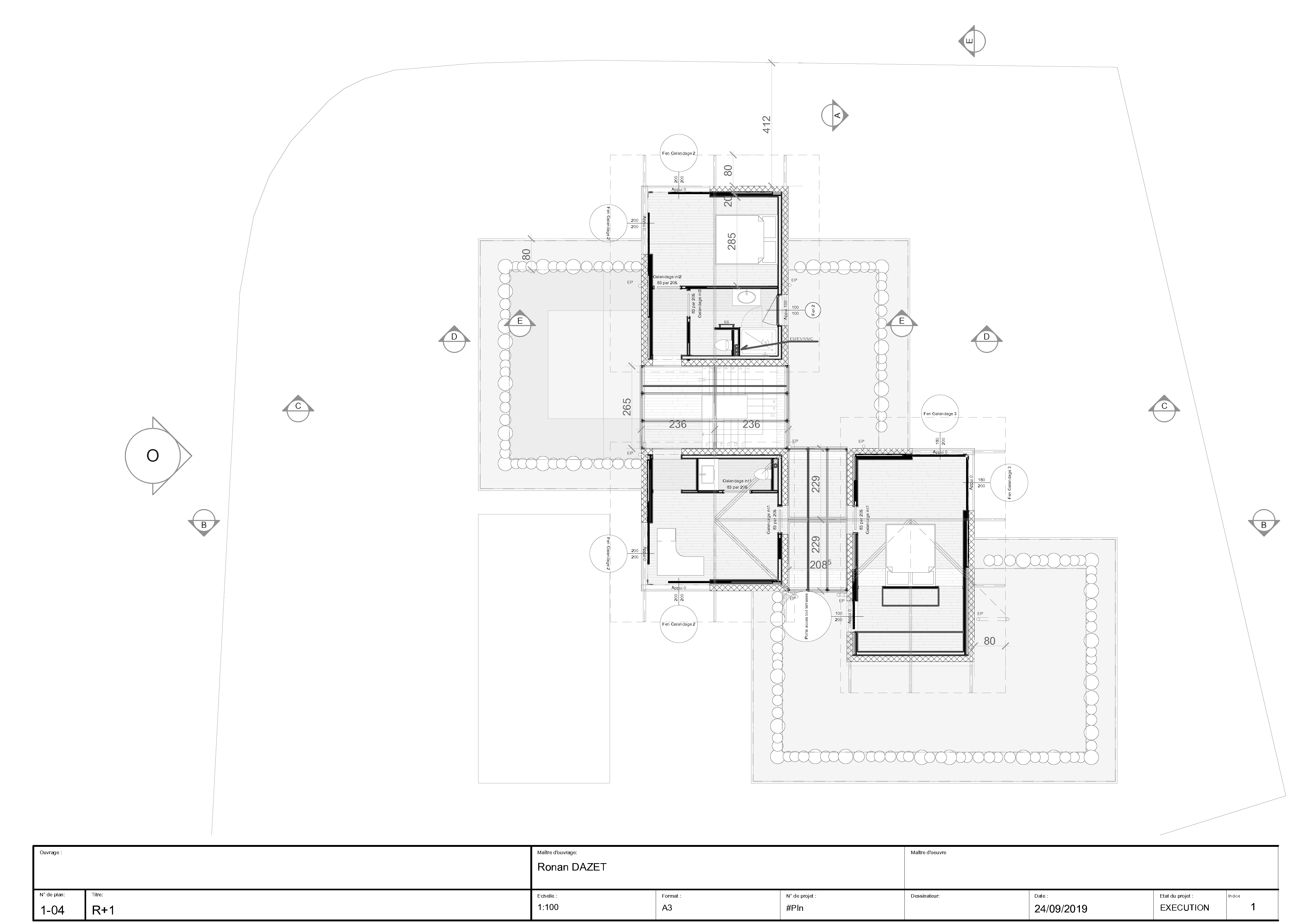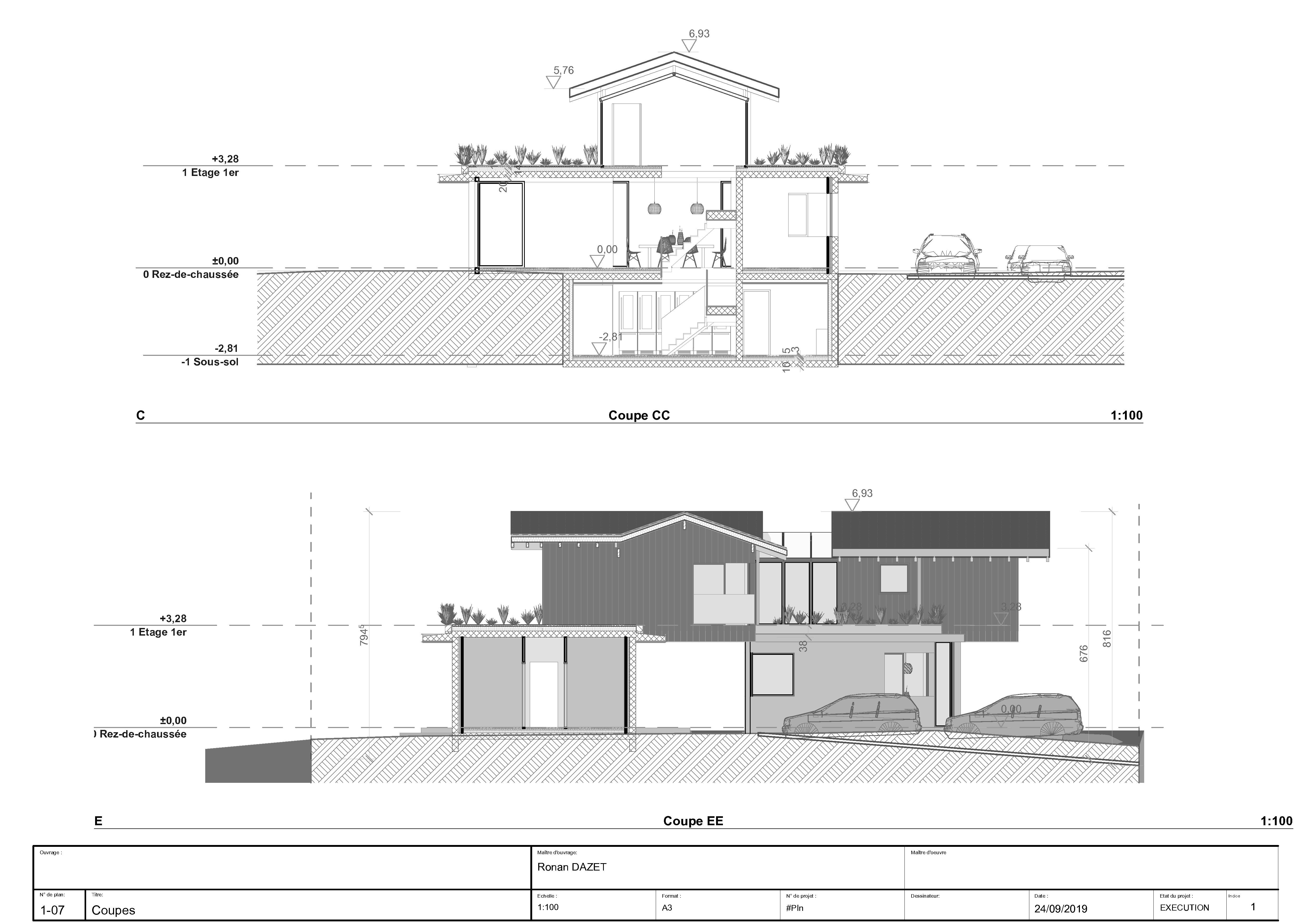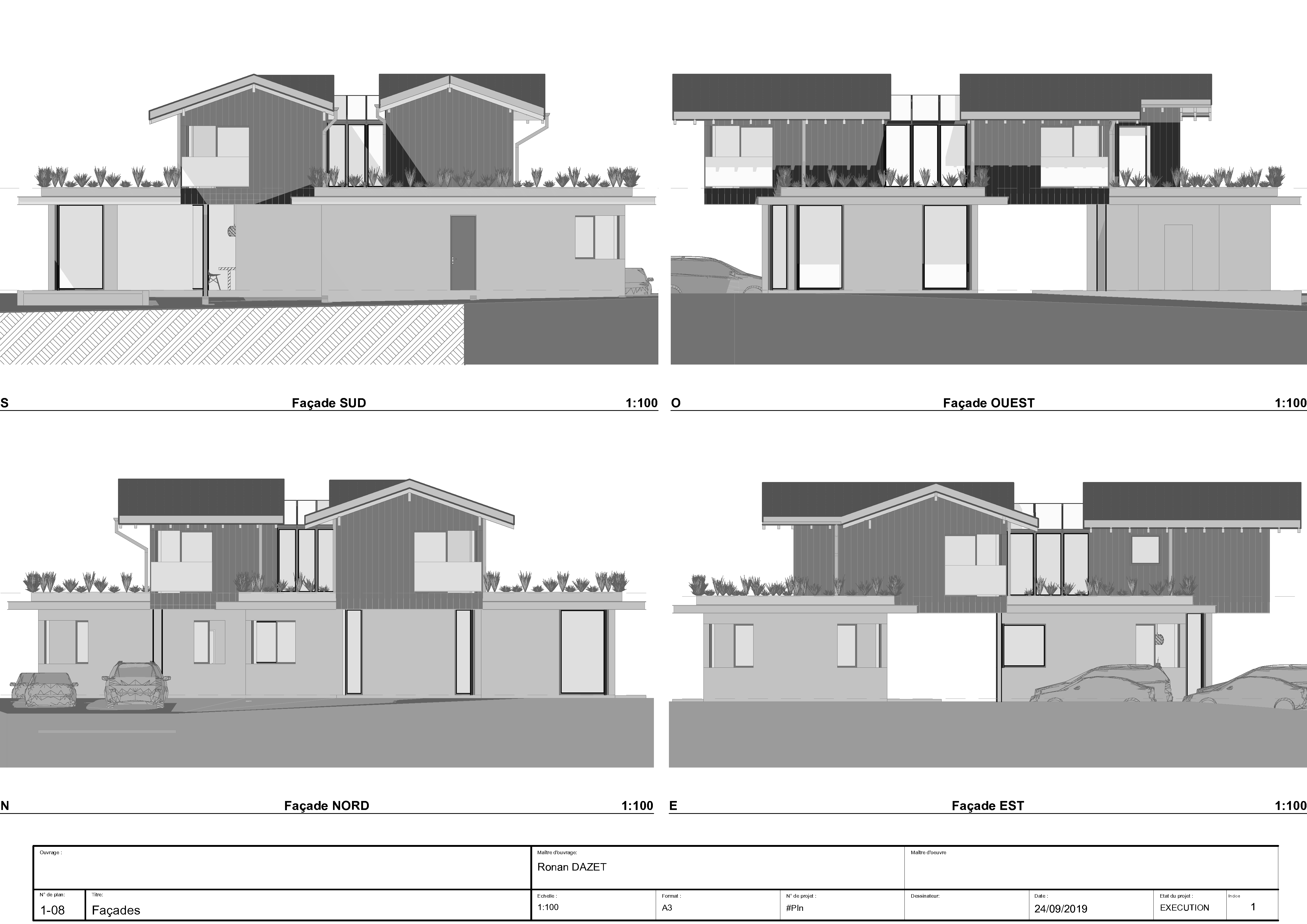 Le projet est une maison pour un jeune chef d'entreprise accueillant sa mère. Il a fallu, dans un contexte règlementaire local contraignant, imaginer un lieu liant des espaces à la fois d’intimité, de développement personnel mais également des lieux du vivre ensemble. Outre le fort enjeu d'insertion paysagère, nous avons dû imaginer une maison permettant la cohabitation intergénérationnelle, aux espaces flexibles et adaptables. Le rez de chaussée est un socle contemporain, surmonté de 3 volumes comme des cabanes perchées, articulés par des verrières permettant respirations et cadrages de vue