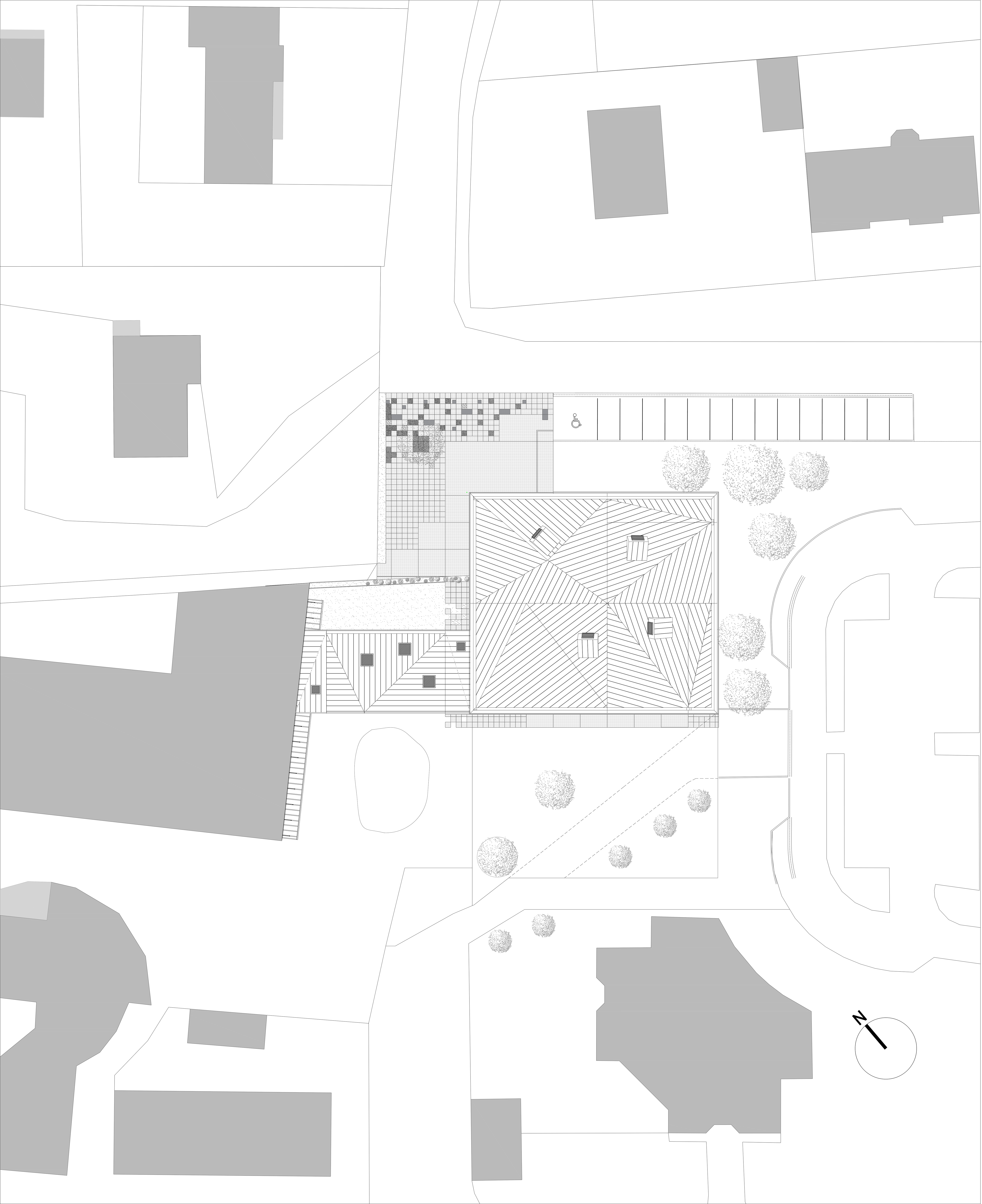 Situé au cœur du pôle scolaire du Plessis Grammoire en frange d'un quartier pavillonnaire diffus, la nouvelle construction doit s'inscrire dans un parcellaire contraint. Empreint de l'étymologie du nom de la commune « Plessis » qui se traduit du latin « plectare » , tresser, entrelacer de branches, le périmètre du bâtiment reconstitue la clôture de la cour initiale, son bardage est ainsi traité en tasseaux de bois verticaux alternés reprenant l'esthétique des haies de bois d'osiers plessés. Cette nouvelle enveloppe dévoile sa structure primaire et s'ouvre au droit de l'entrée principal et des espaces d'activités sur la cour. De part la compacité du bâti de plein pied, un jeu de toiture en origami reprend la diversité confuse des toitures environnantes, il contribue à la variété des volumes intérieurs et anime les élévations en rapport avec le plan fonctionnel.