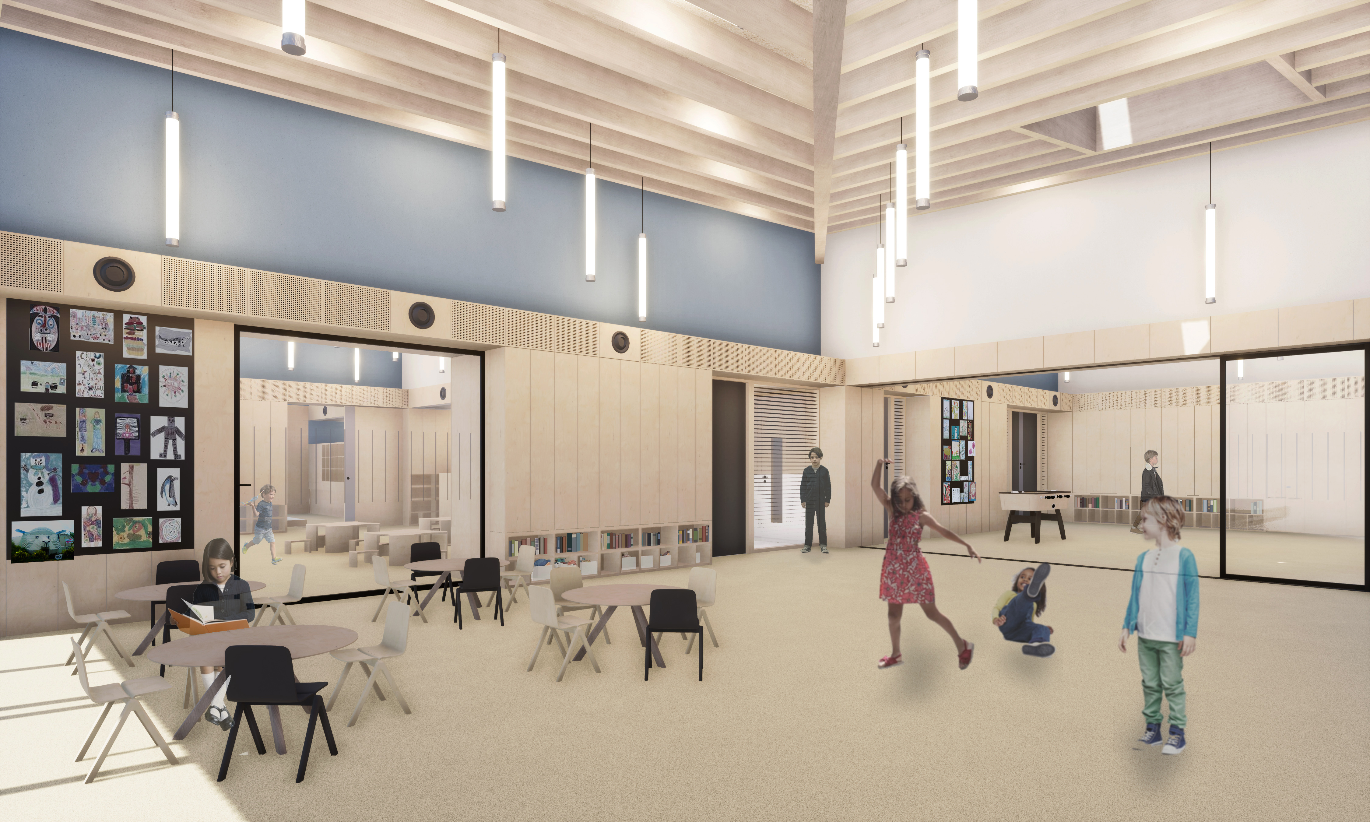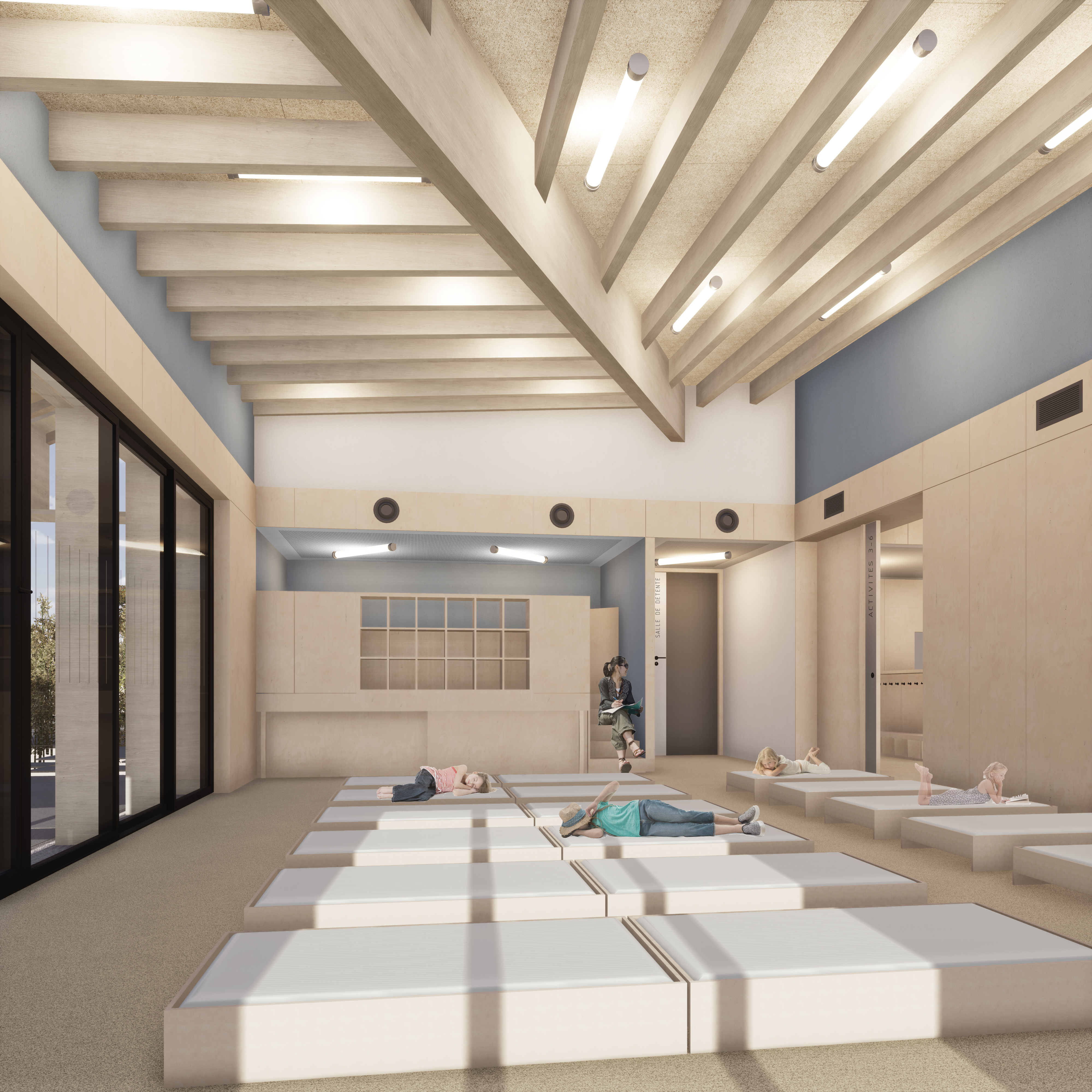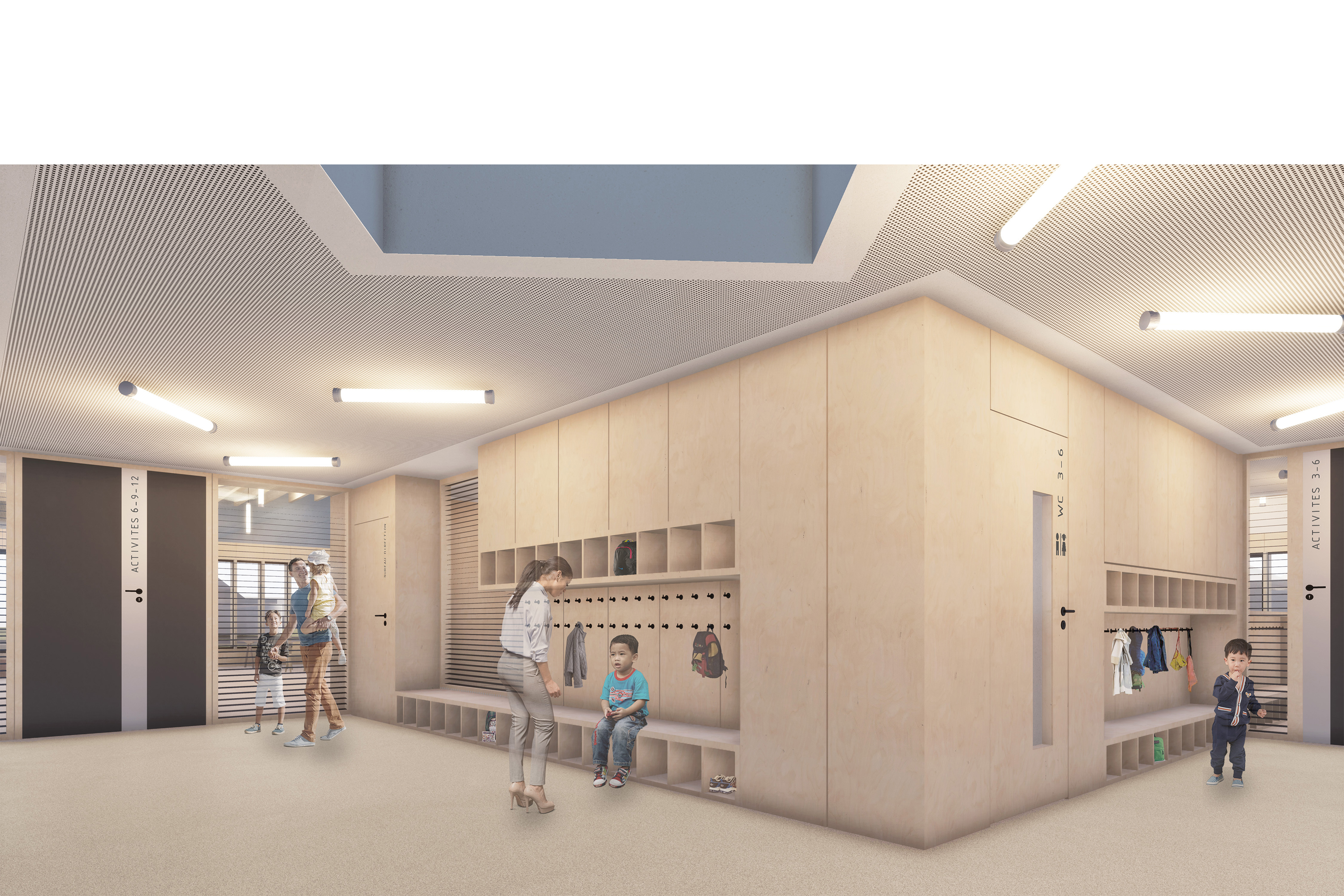 Approche environnementale : Largement ouvert sur l'extérieur et sur la cour, les salles sont également éclairées zénithalement par des canons de lumières orientés Nord pour un meilleur confort visuel et permettre une "surventilation" l'été, les locaux de services, vestiaires et sanitaires plus fermés se répartissent fonctionnellement autour ou au centre des espaces d'activités et peuvent être mutualisés. Le traitements de revêtements de sols en caoutchouc naturel, les parements et agencement en bois naturel de peuplier et l'utilisation parcimonieuse de peintures minérales assure la qualité de l'air intérieur.