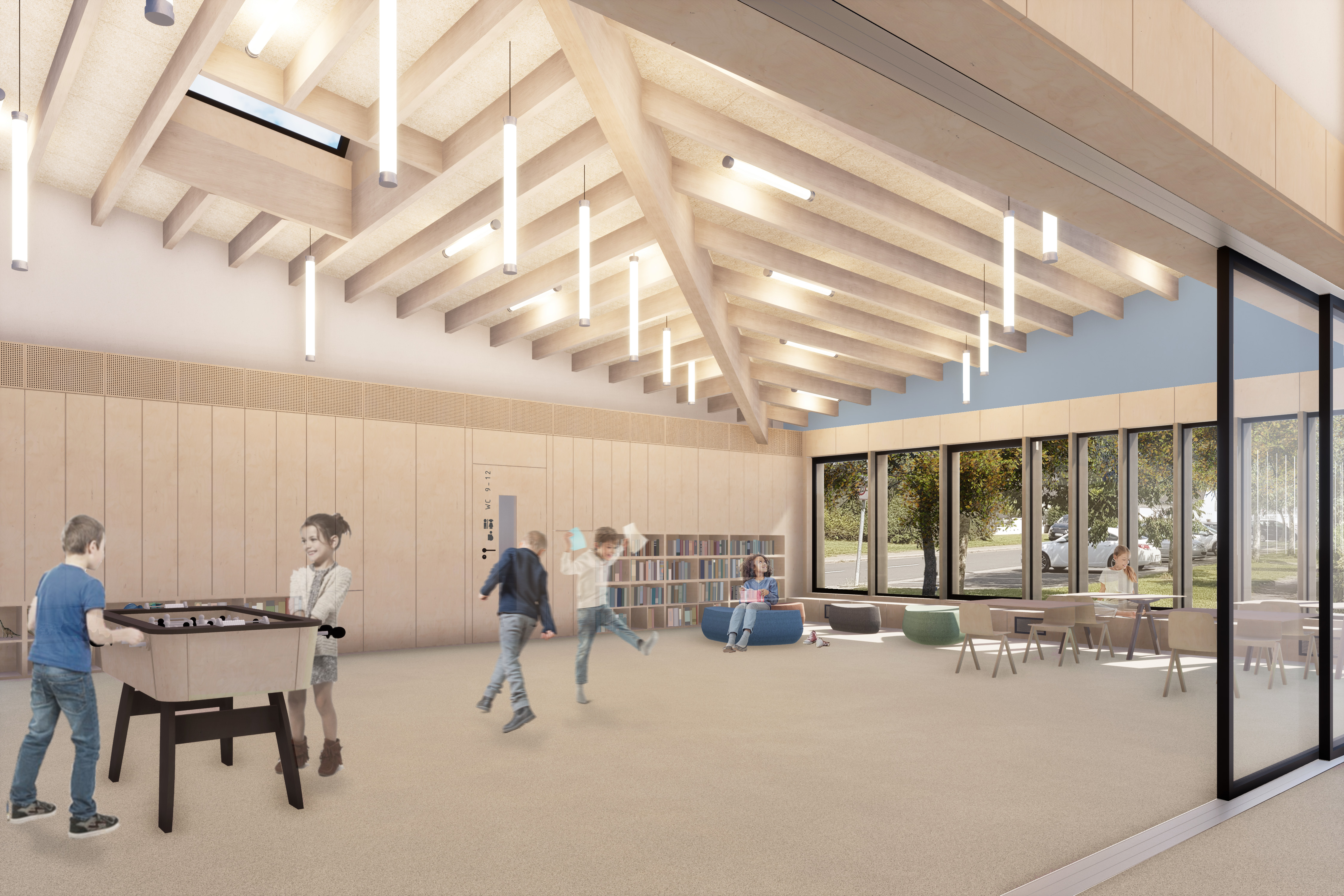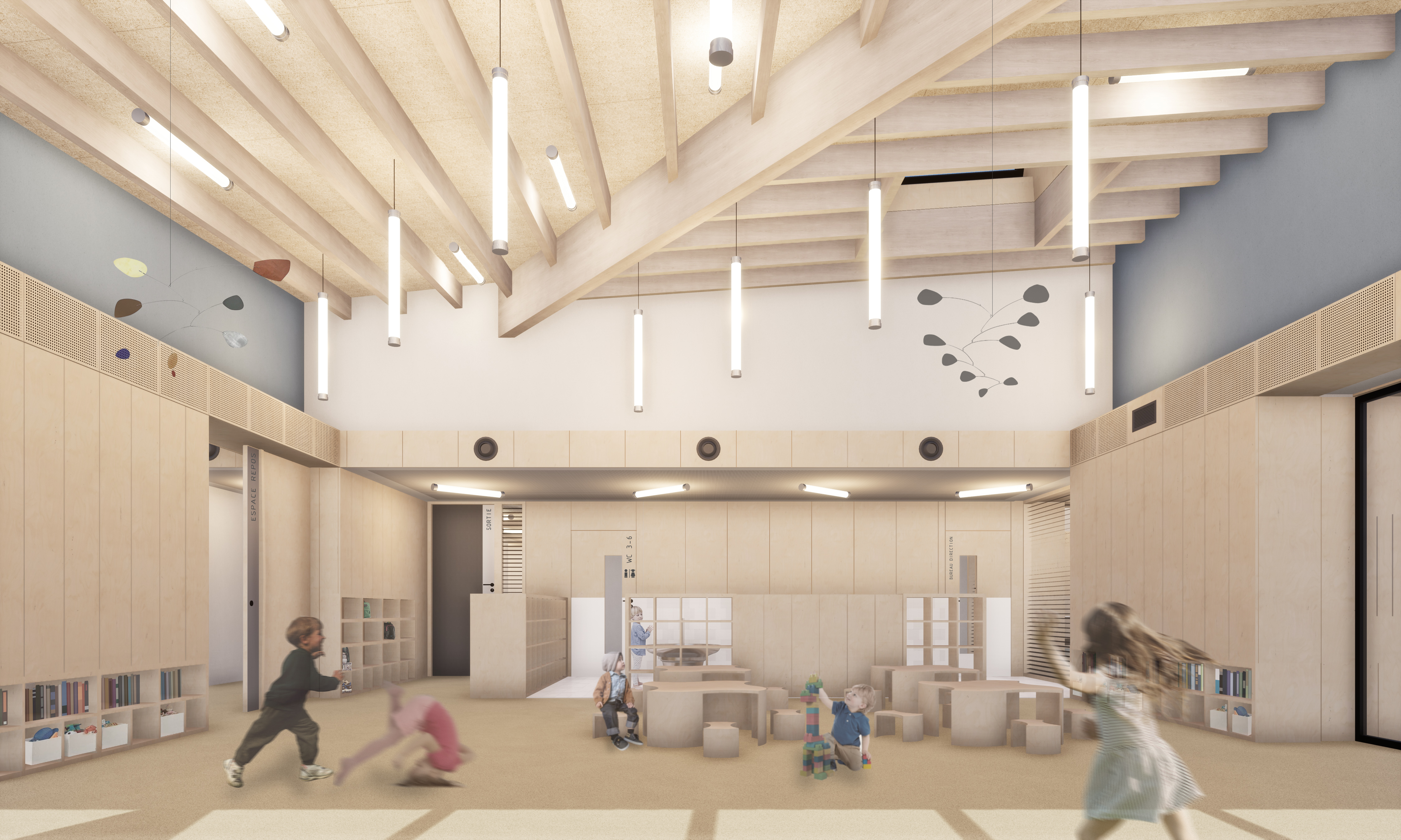 Descriptif technique de l'aménagement : Construction réalisée en murs ossature bois isolé surmonté d'une charpente bois lamellé collé apparente assemblée à queue d'aronde. La mise en valeur de la structure bois à l'intérieur des espaces d'activités participe d'autant aux ambiances chaleureuses par la présence du bois et de par la diversité volumétrique qu'au traitement acoustique par le biais des caissons inhérents remplis en dalles en fibres de bois Organic.