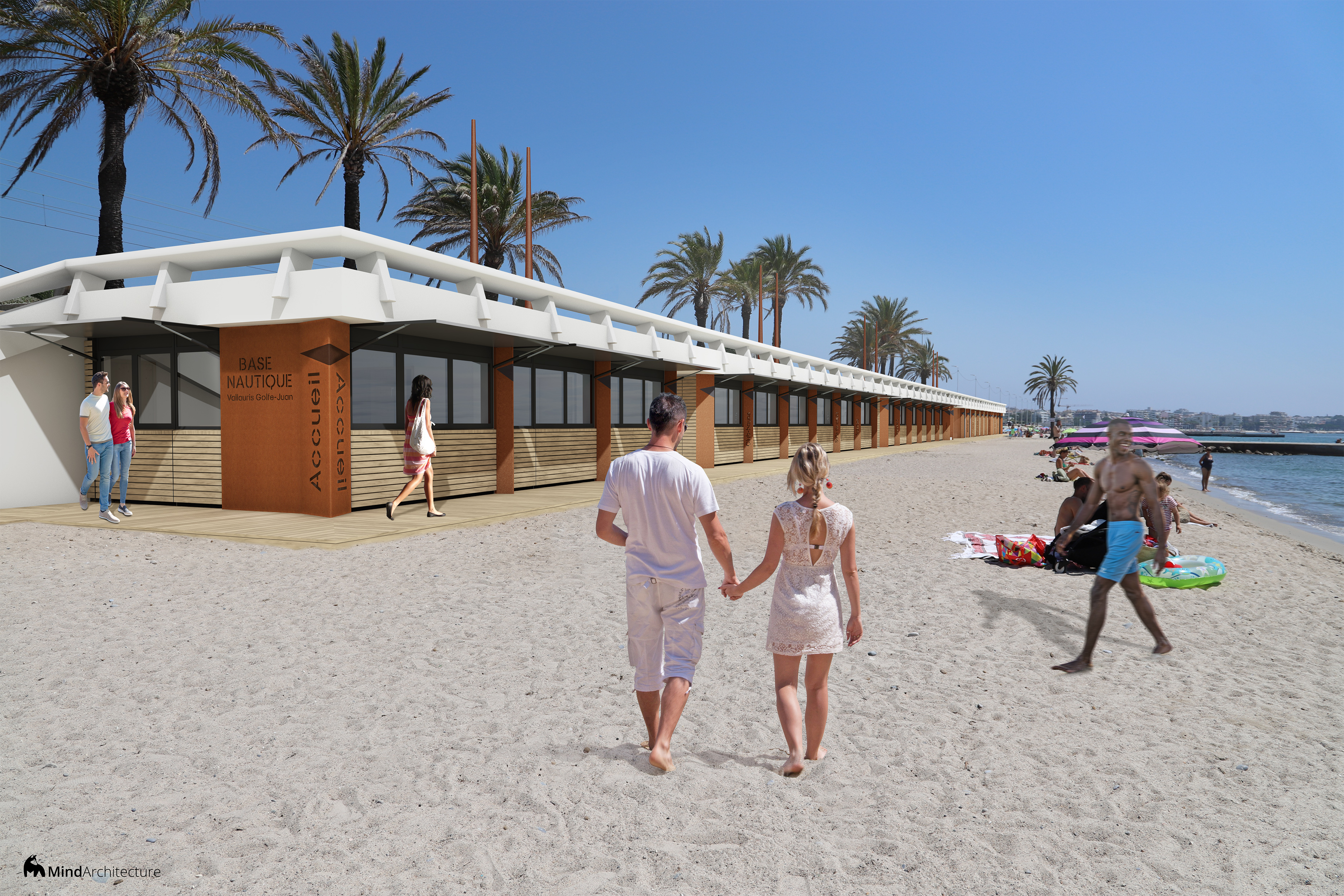 Le projet s'inscrit dans une structure alvéolaire en béton existante. Les façades sont entièrement retravaillées avec trois matériaux : les menuiseries en aluminium, un bardage bois en robinier faux-acacia à claire voie, d'origine française et sans traitement, et de l'acier Cor-Ten plié et découpé pour la signalétique et l'insertion de luminaires. Un cheminement PMR extérieur en platelage bois (en robinier faux-acacia sur structure azobé et longrines en béton), créé le long de la façade et depuis la rue, rend la plage, l'ensemble des locaux, et les activités nautiques accessibles à tous.