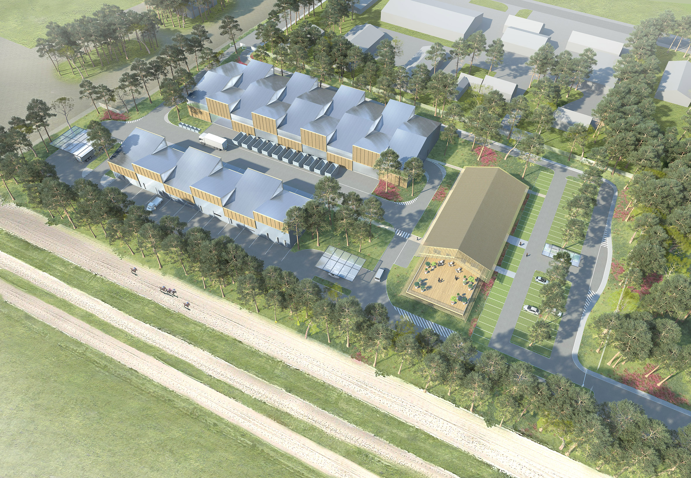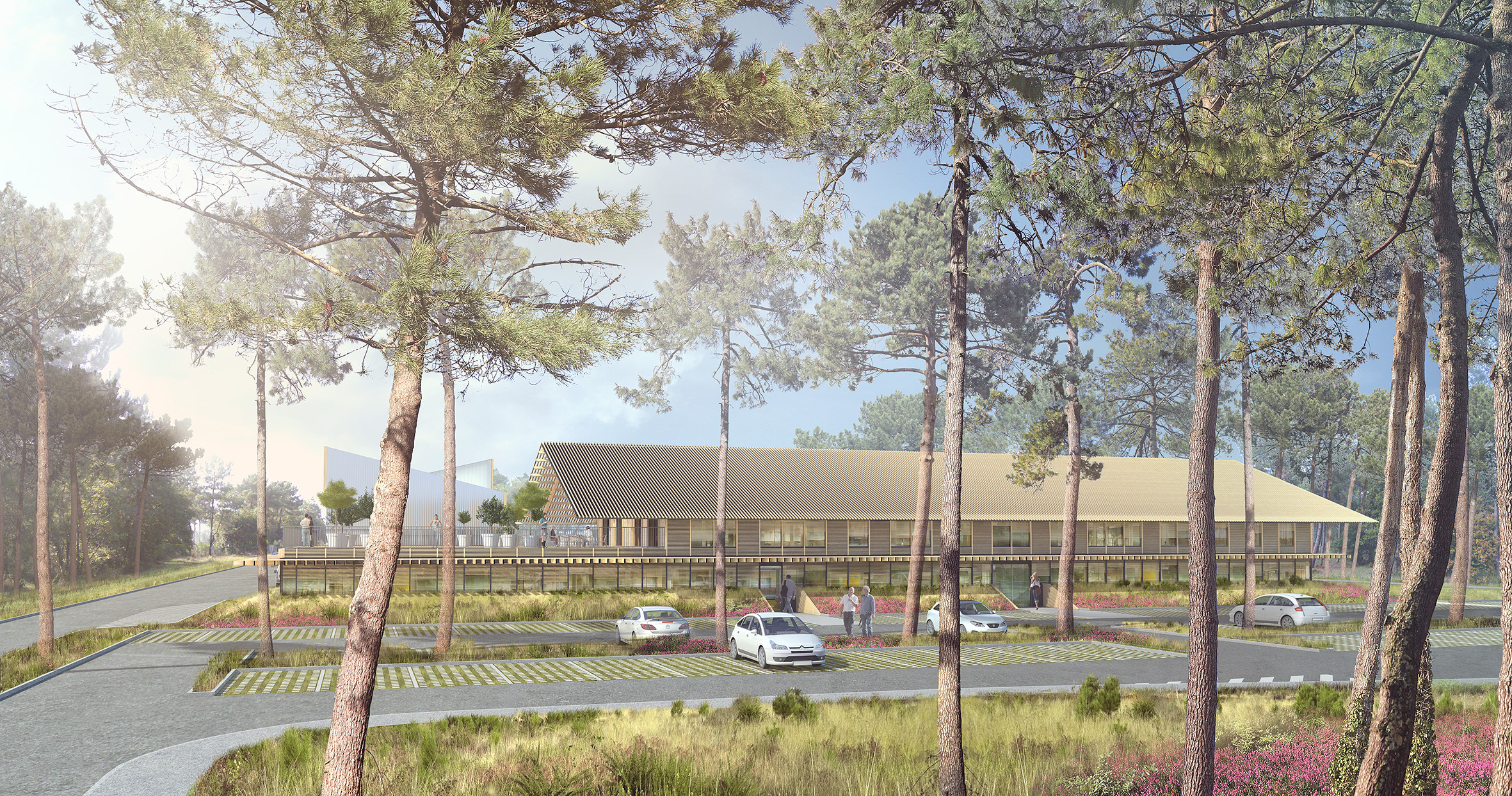 Approche environnementale : Afin d’intégrer le projet dans l’environnement paysager du Canal des Grandes Landes, le bois a été utilisé majoritairement en structure comme en façade. L'impact physique des bâtiments a été minimisé pour ne pas dénaturer le site, maintenir les lisières végétales et conserver au maximum les arbres existants. Soucieux de raccourcir la chaine de production/distribution et attentifs à l'acte de construire, nous avons utilisé du pin des Landes pour l'ensemble des vêtures et bardages. Notre démarche environnementale se calque sur le référentiel CERTIVEA "NF Bâtiments Tertiaires-Démarche HQE".