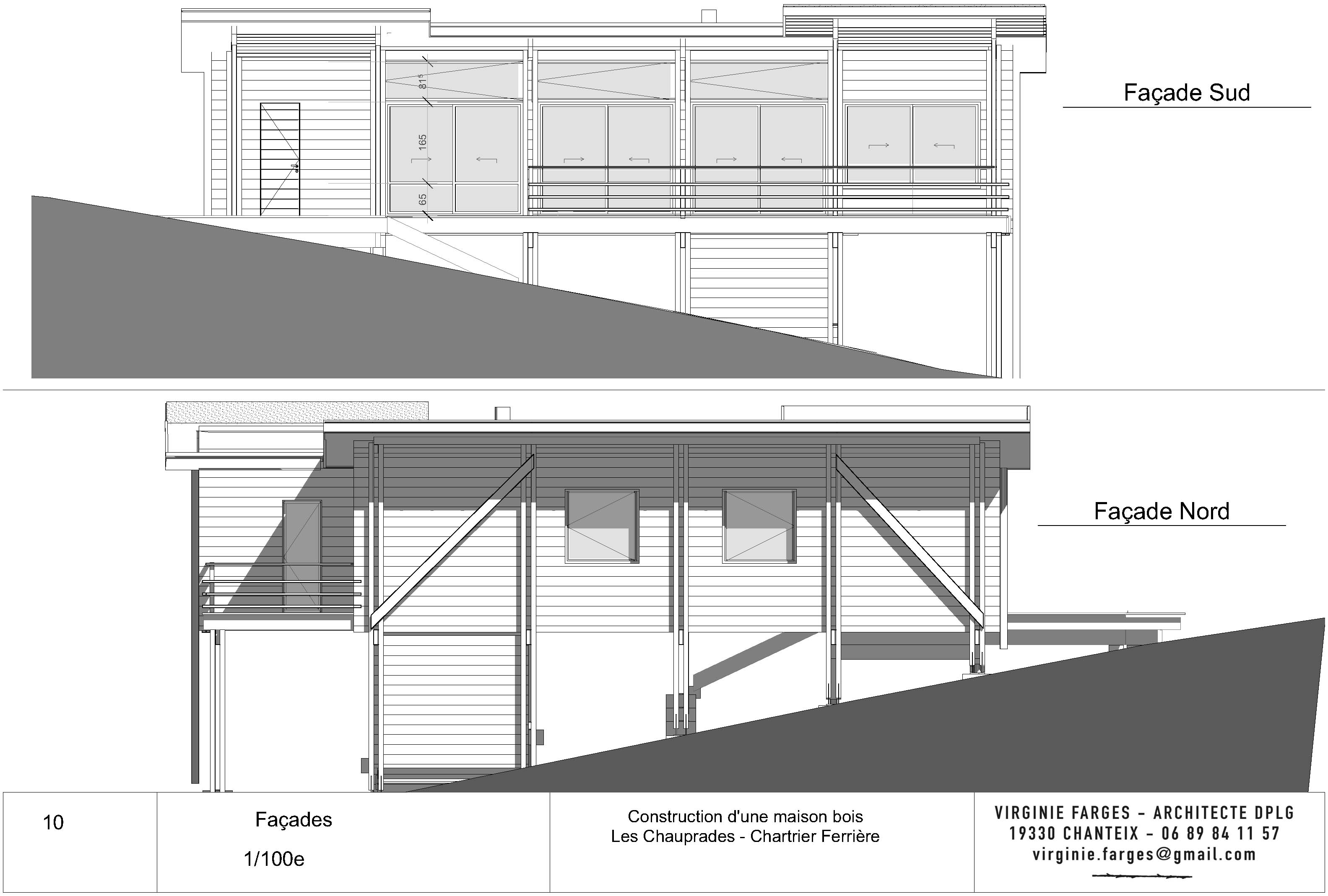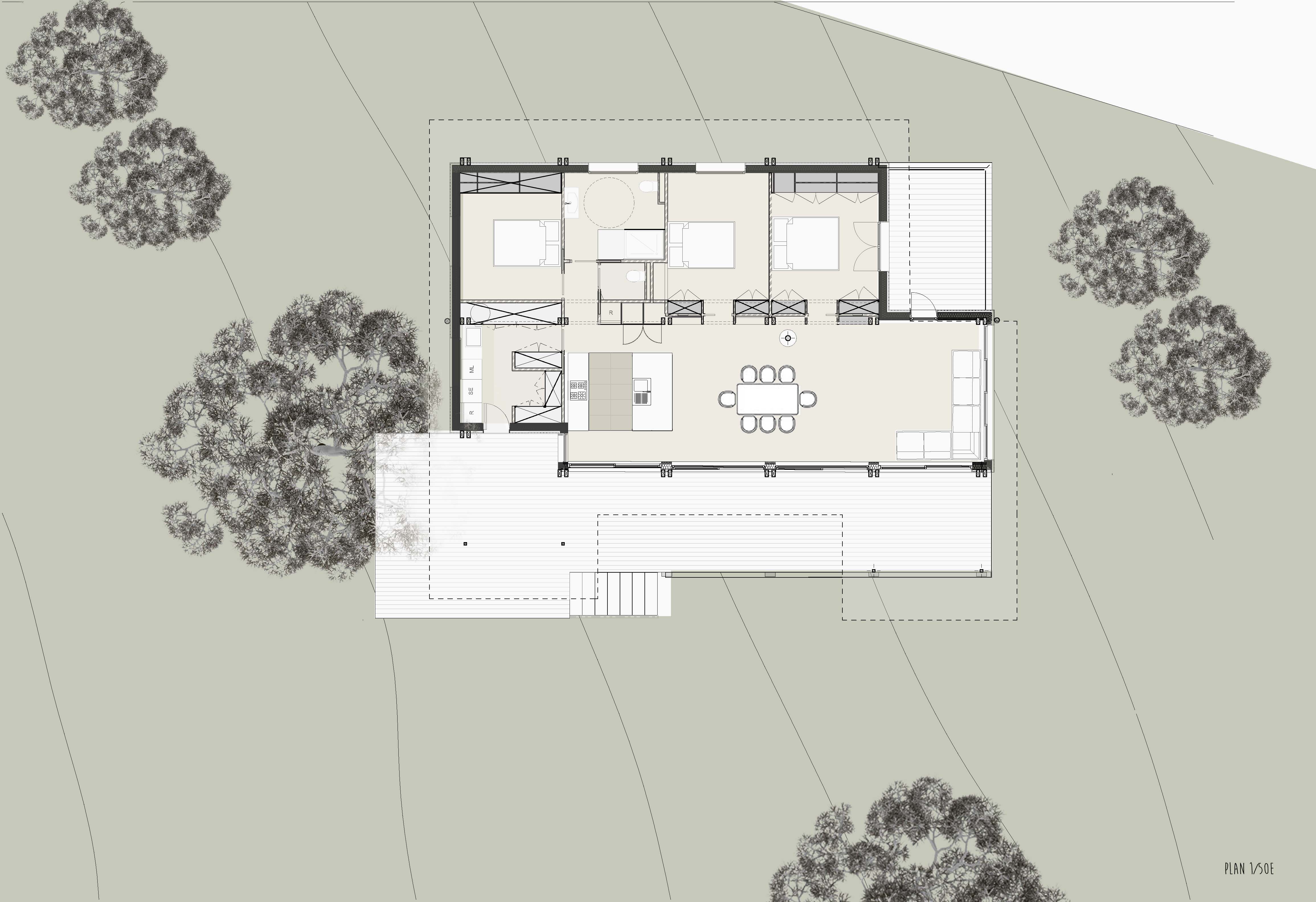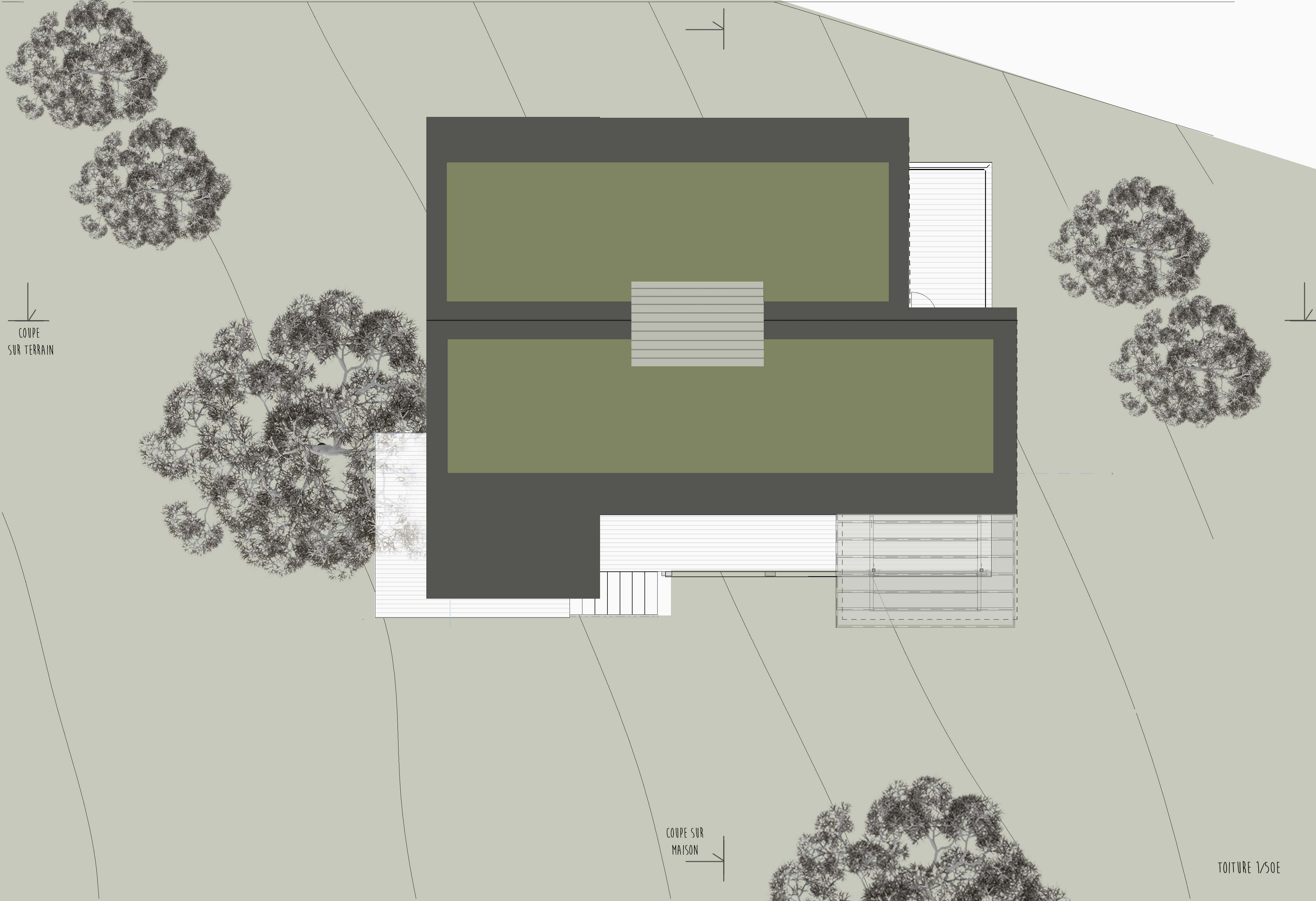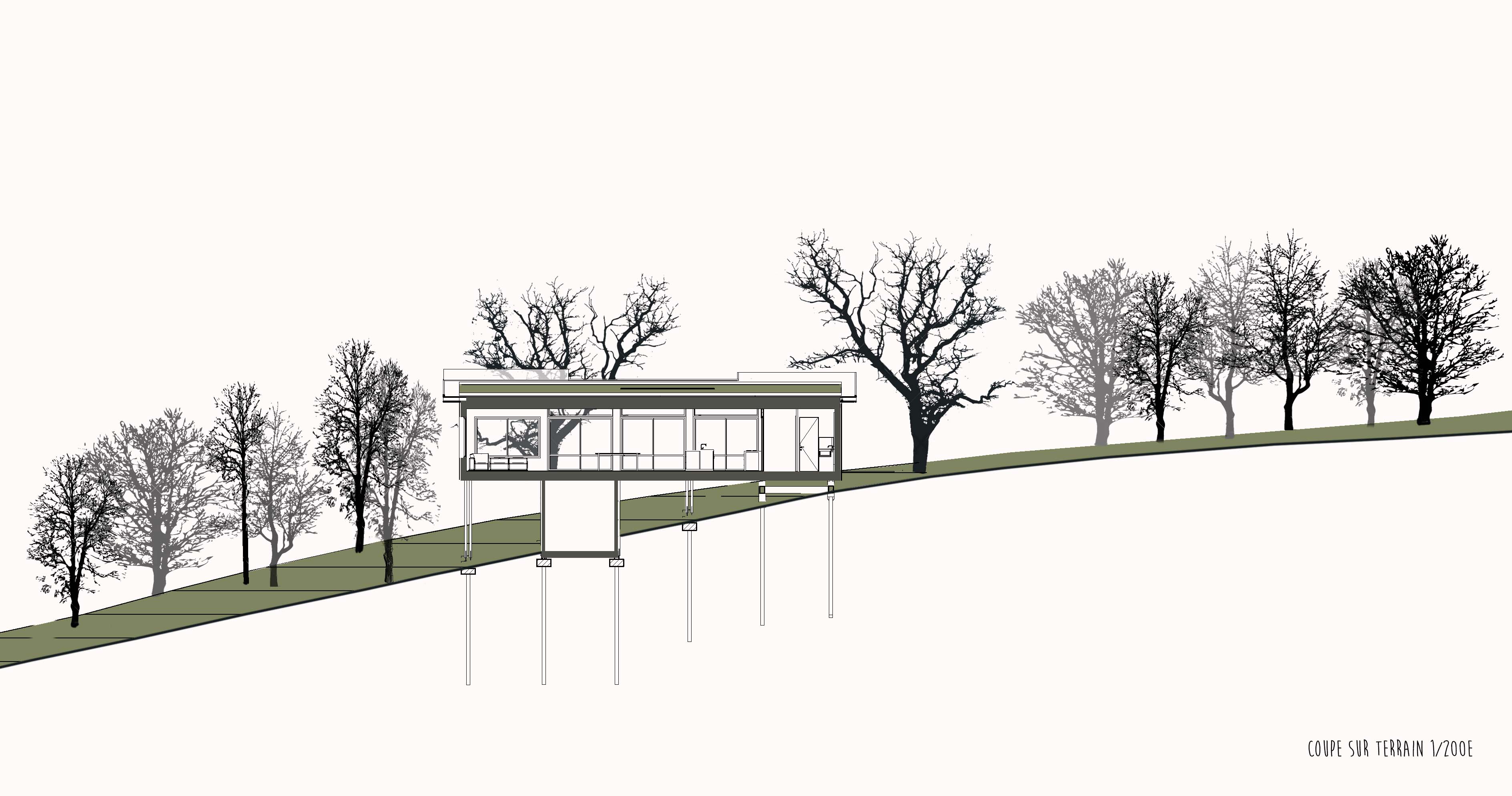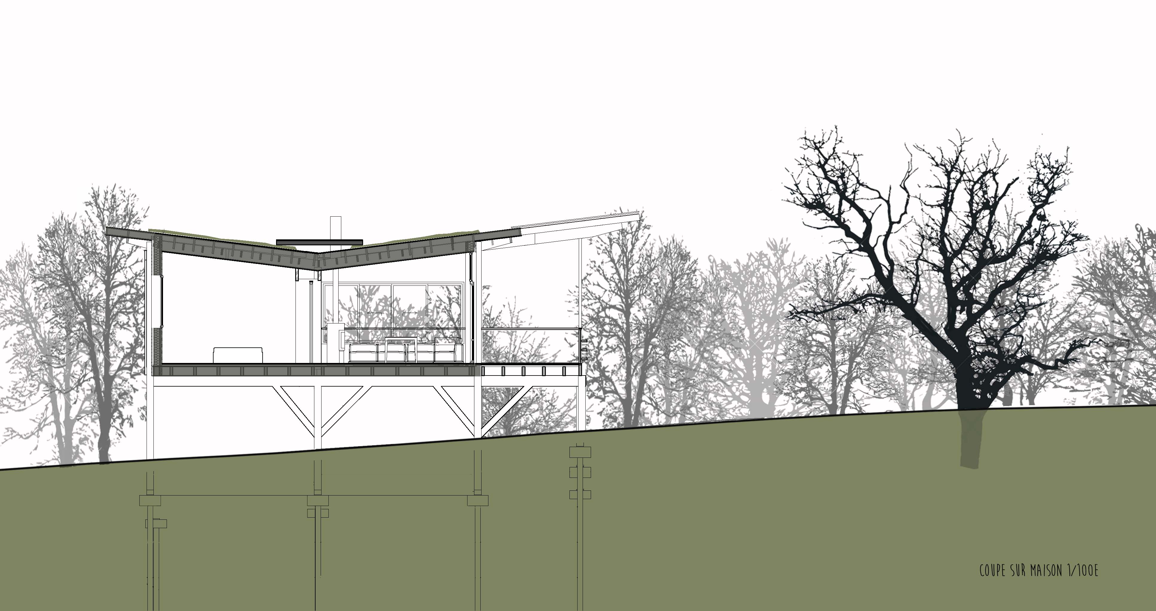 Sur le causse corrézien, la maison vient s'ancrer dans une forte pente au milieu de chênes centenaires. La pièce à vivre se prolonge par de grandes terrasses abritées par les débords de toiture. De grandes baies vitrées s'ouvrent sur la terrasse, augmentant l'espace à vivre par une continuité du dedans vers le dehors. La terrasse en partie abritée du soleil et de la pluie offre une vue la forêt en toutes saisons. Les auvents débordants donnent un allure aérienne à la maison et protègent de la surchauffe estivale, tout en laissant passer largement le soleil en hiver.