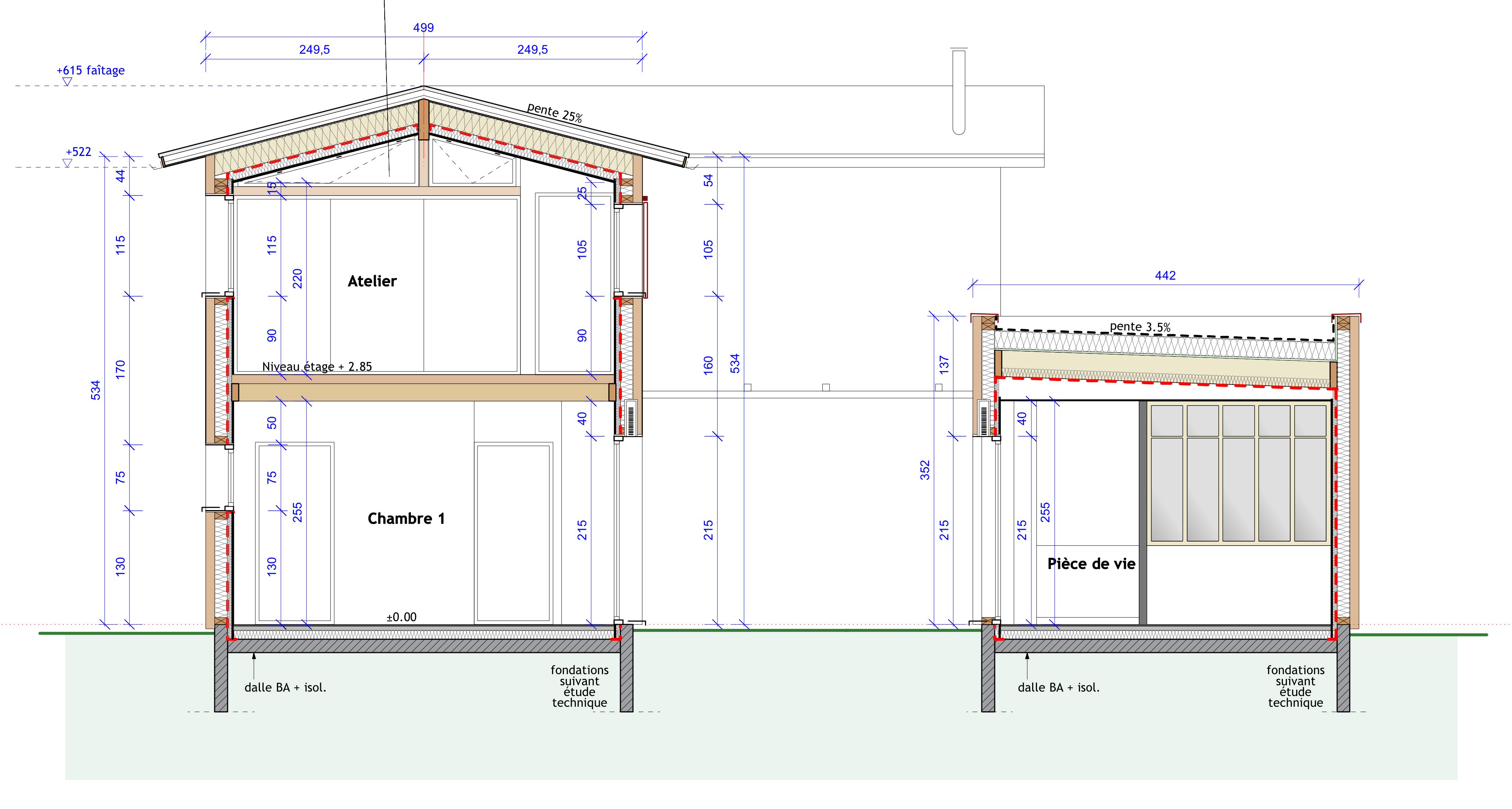 Descriptif technique : Dalle béton et carrelage au rdc pour améliorer l'inertie thermique. Murs en ossature 145/45 avec laine de bois (déphasage), et complément 50 mm de laine de bois en contre cloison. Charpente par panne en lamellé collé centrale et chevrons planches 340/45 formant des caissons d'injection de ouate de cellulose (déphasage). Présence du bois aussi pour l'entresol rdc/r+1, avec solives sapin apparentes en sous face, et traitement acoustique par OSB, puis fibre de bois et fermasol, le tout en pose flottante. Le fermacell est présent aussi en murs / plafonds, en plaque de 18mm (inertie thermique).