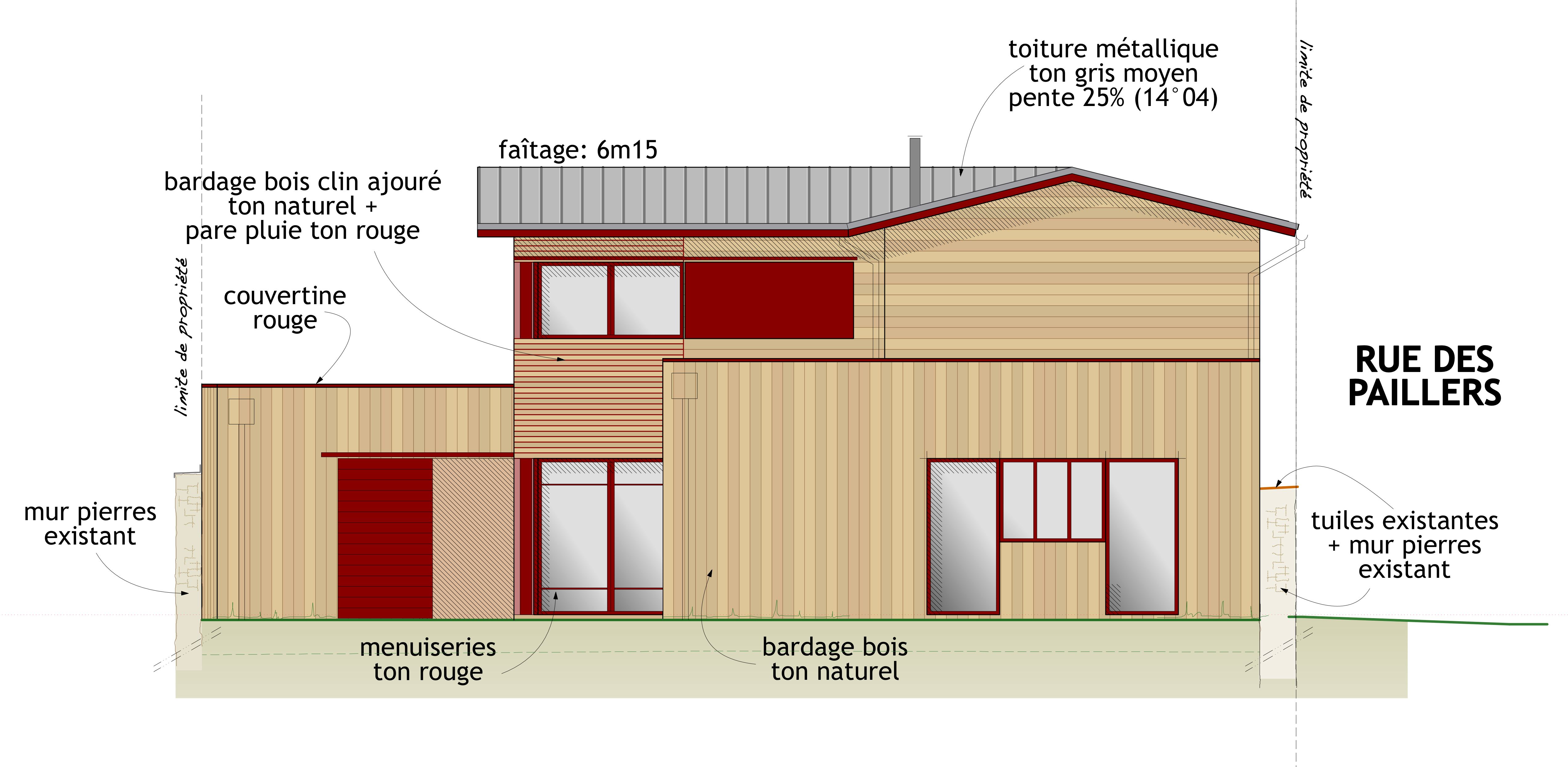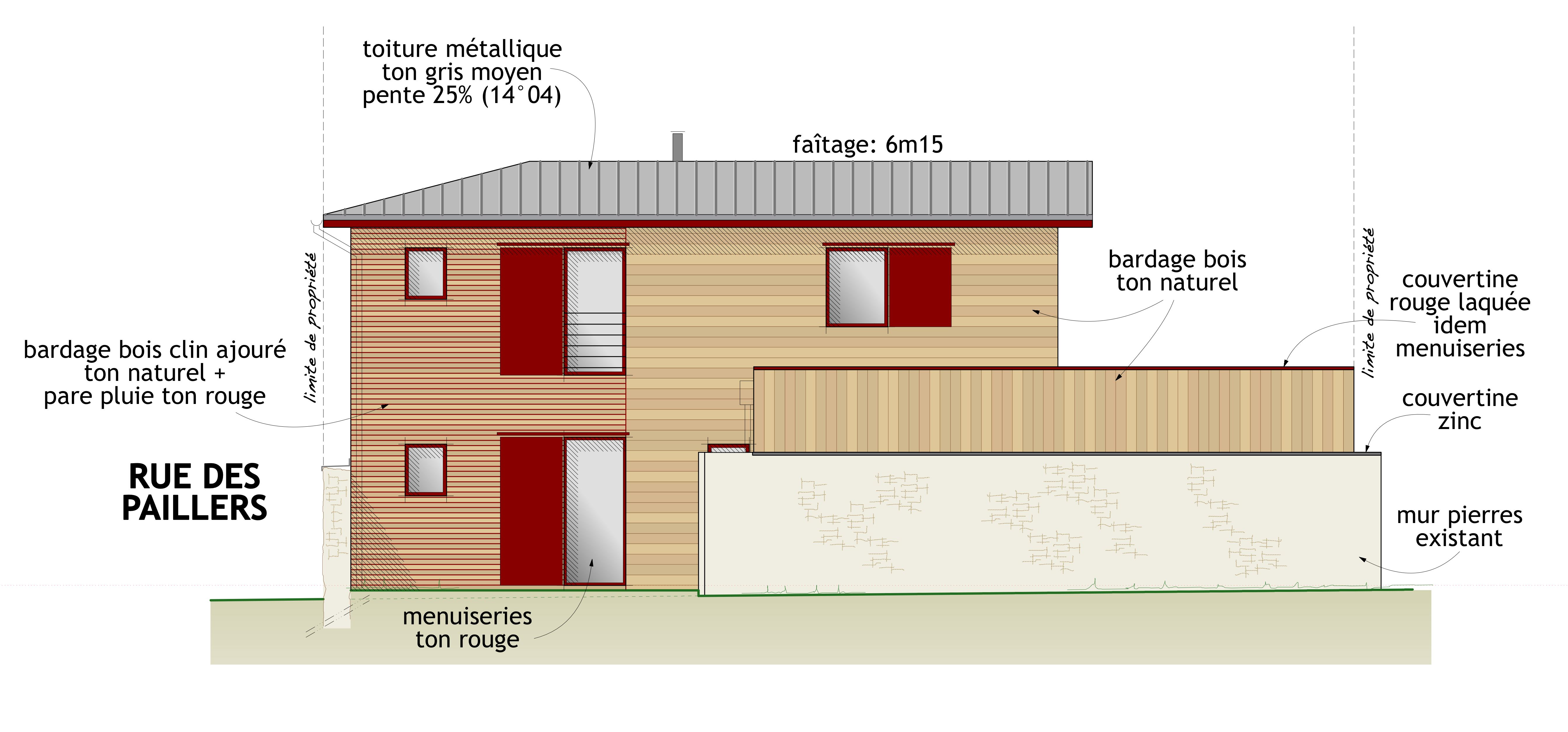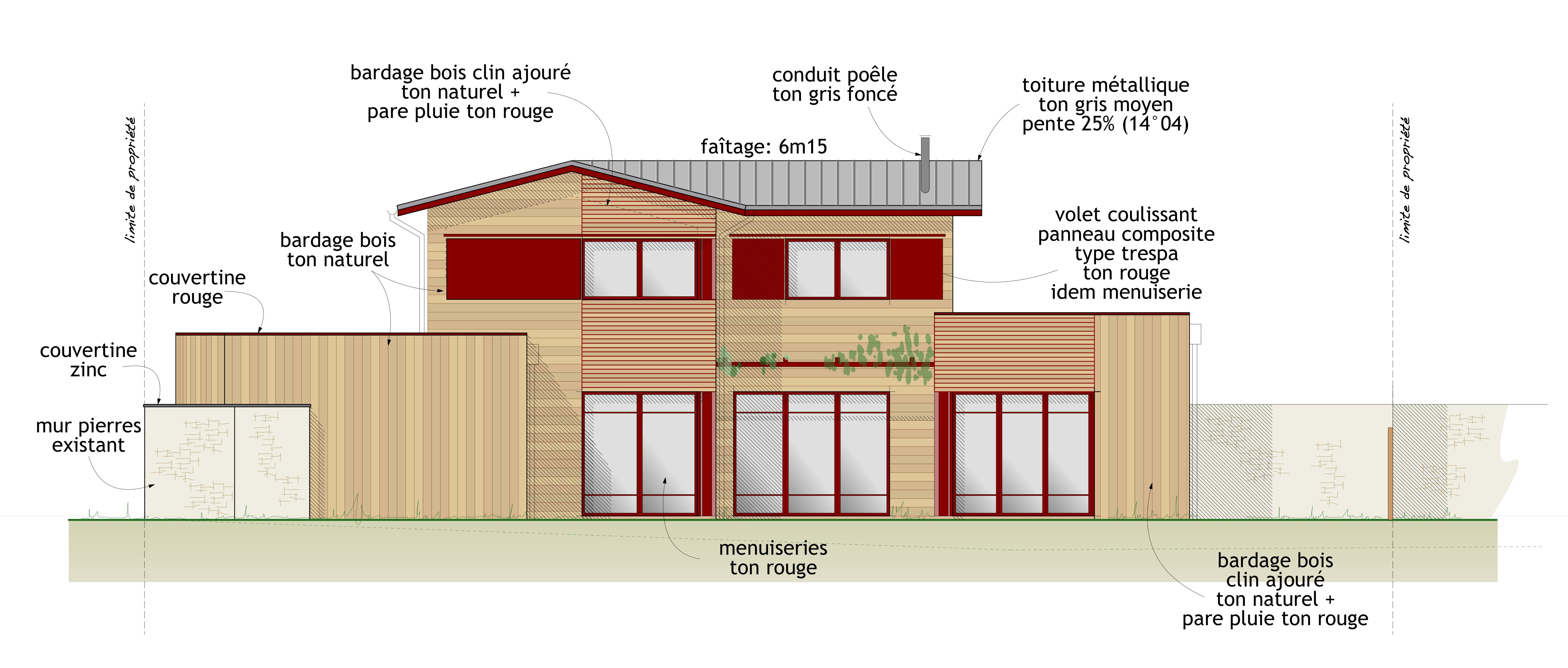 -Volumes rectangulaires sobres à étage partiel, couverture métallique à faible pente. Simplicité des volumes. -Implantation en limite de propriété Nord pour gagner de l'espace au Sud (jardin). -Bioclimatisme passif: larges ouvertures au sud , débord de toit . Inertie thermique par le fermacell. - Architecture contemporaine: menuiseries rouges, bardage bois en clins ajourés ton naturel avec pare-pluie rouge vif, toiture métallique, toit terrasse. - Conservation du mur pierre existant au Nord et à l'Ouest. - Accès parcelle en angle en grave compactée, ton sable (langage piétonnier).