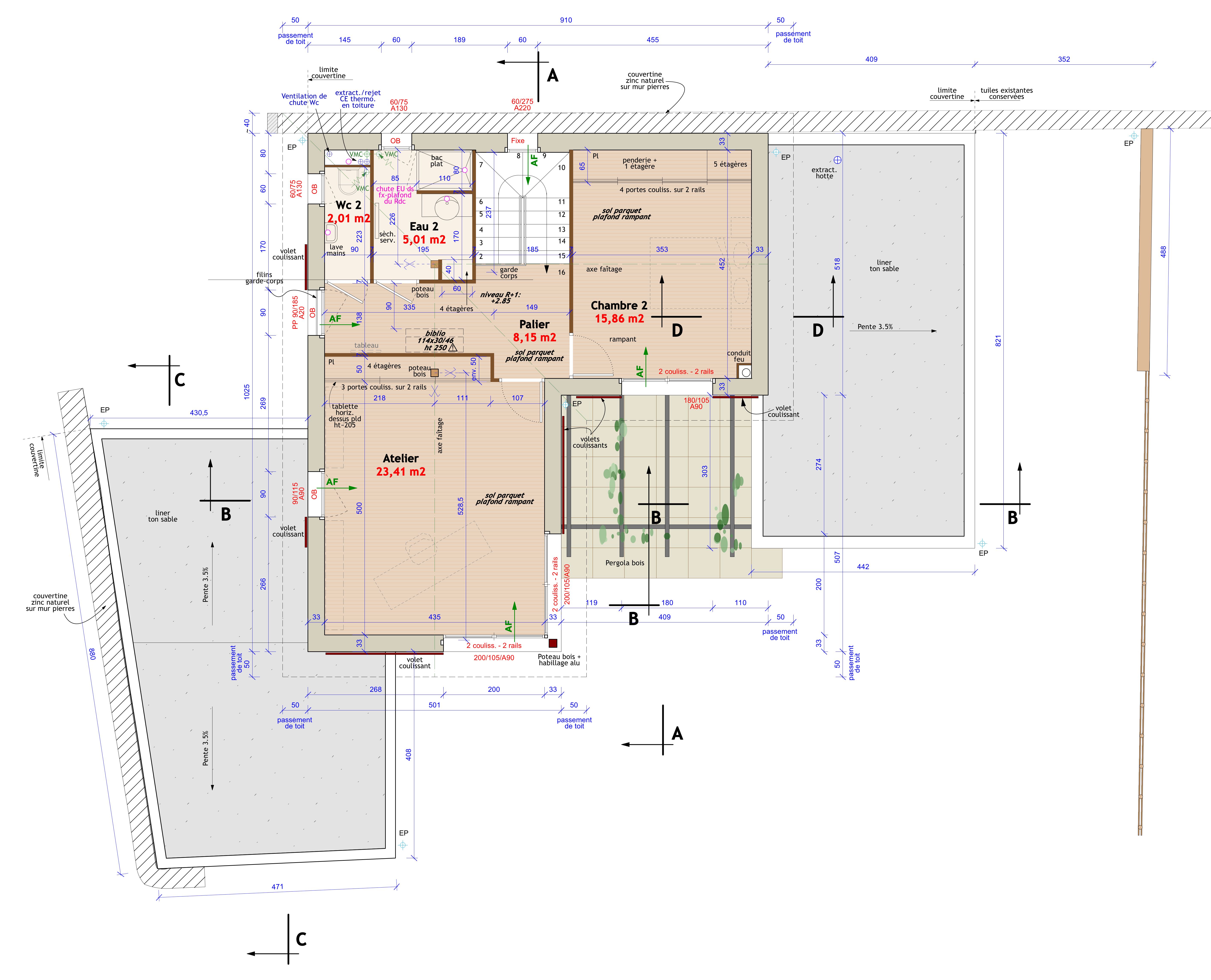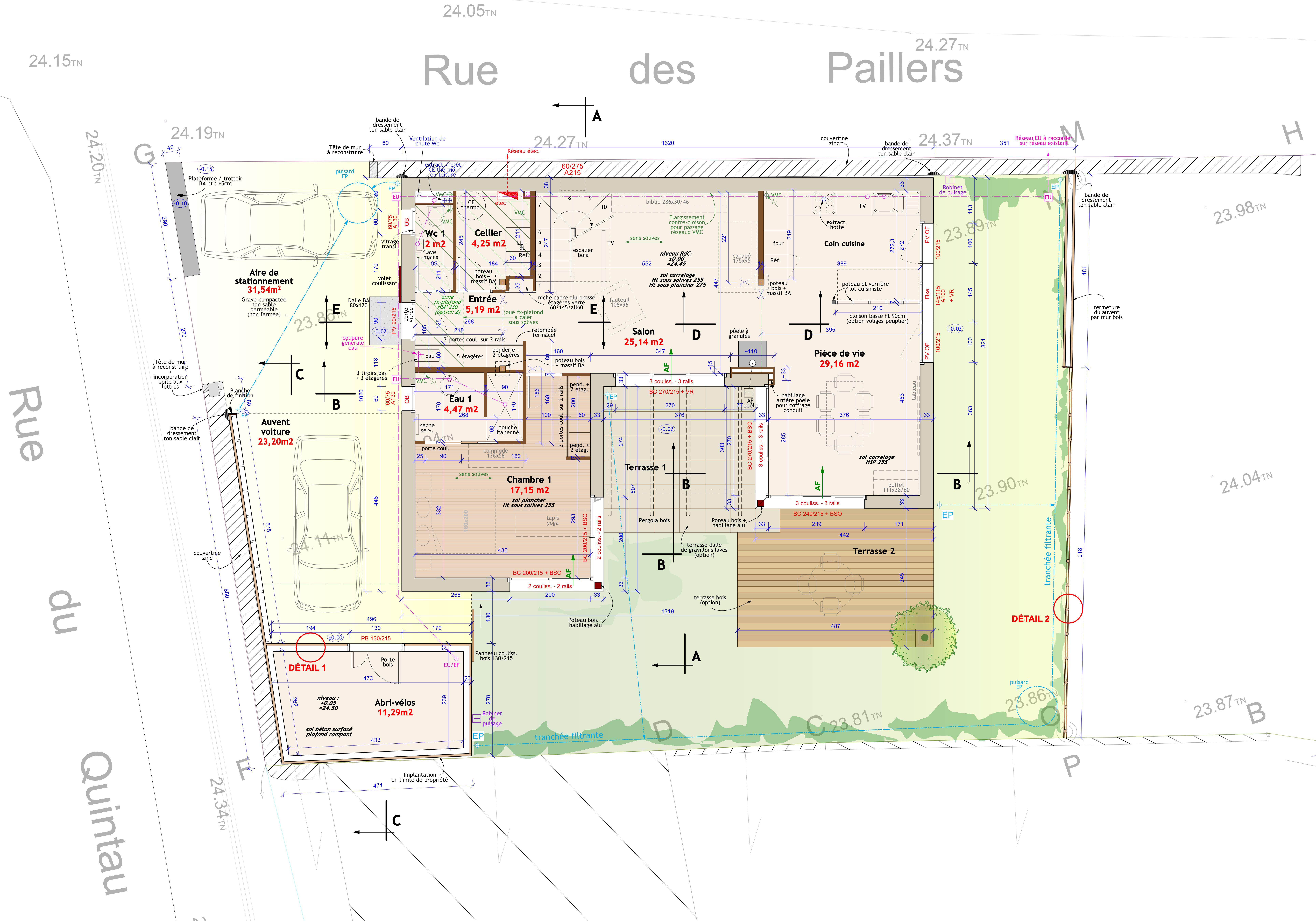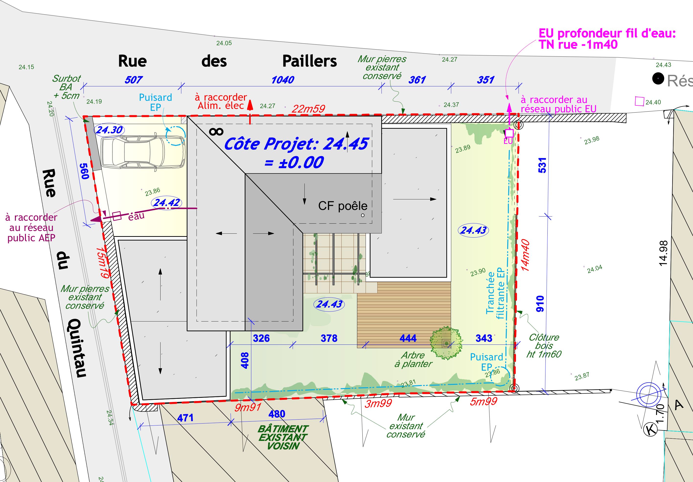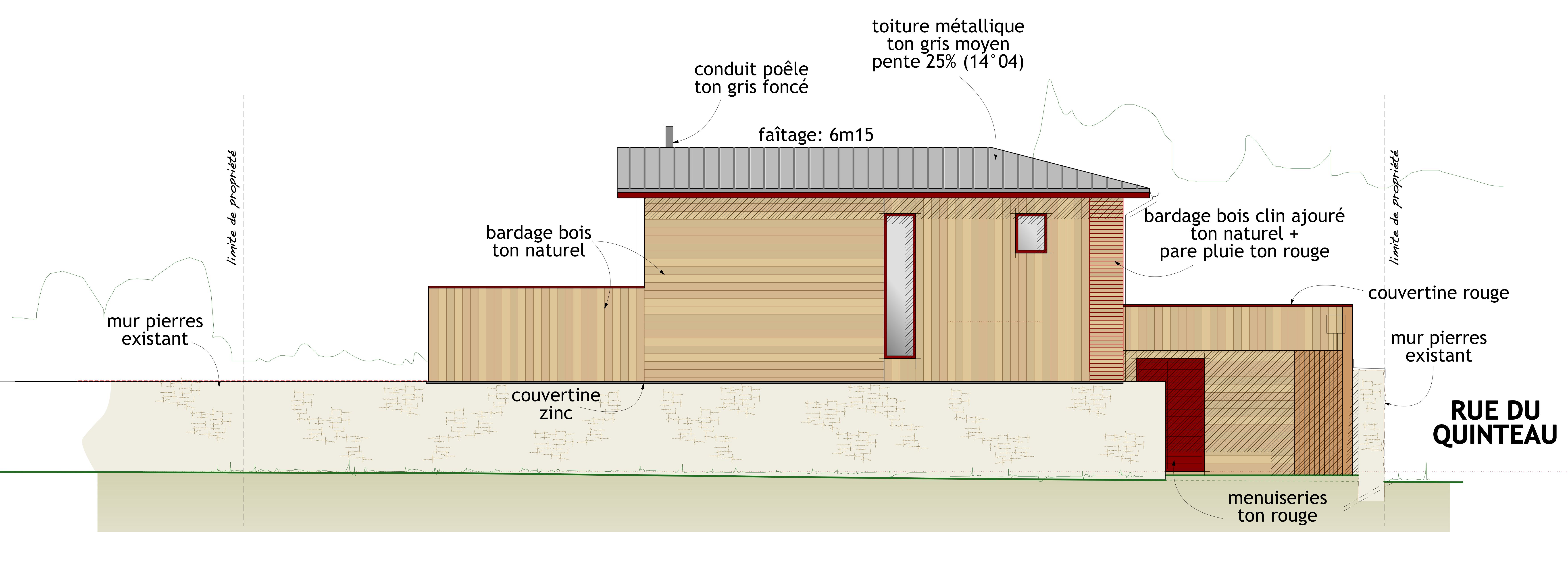 -Volumes rectangulaires sobres à étage partiel, couverture métallique à faible pente. Simplicité des volumes. -Implantation en limite de propriété Nord pour gagner de l'espace au Sud (jardin). -Bioclimatisme passif: larges ouvertures au sud , débord de toit . Inertie thermique par le fermacell. - Architecture contemporaine: menuiseries rouges, bardage bois en clins ajourés ton naturel avec pare-pluie rouge vif, toiture métallique, toit terrasse. - Conservation du mur pierre existant au Nord et à l'Ouest. - Accès parcelle en angle en grave compactée, ton sable (langage piétonnier).