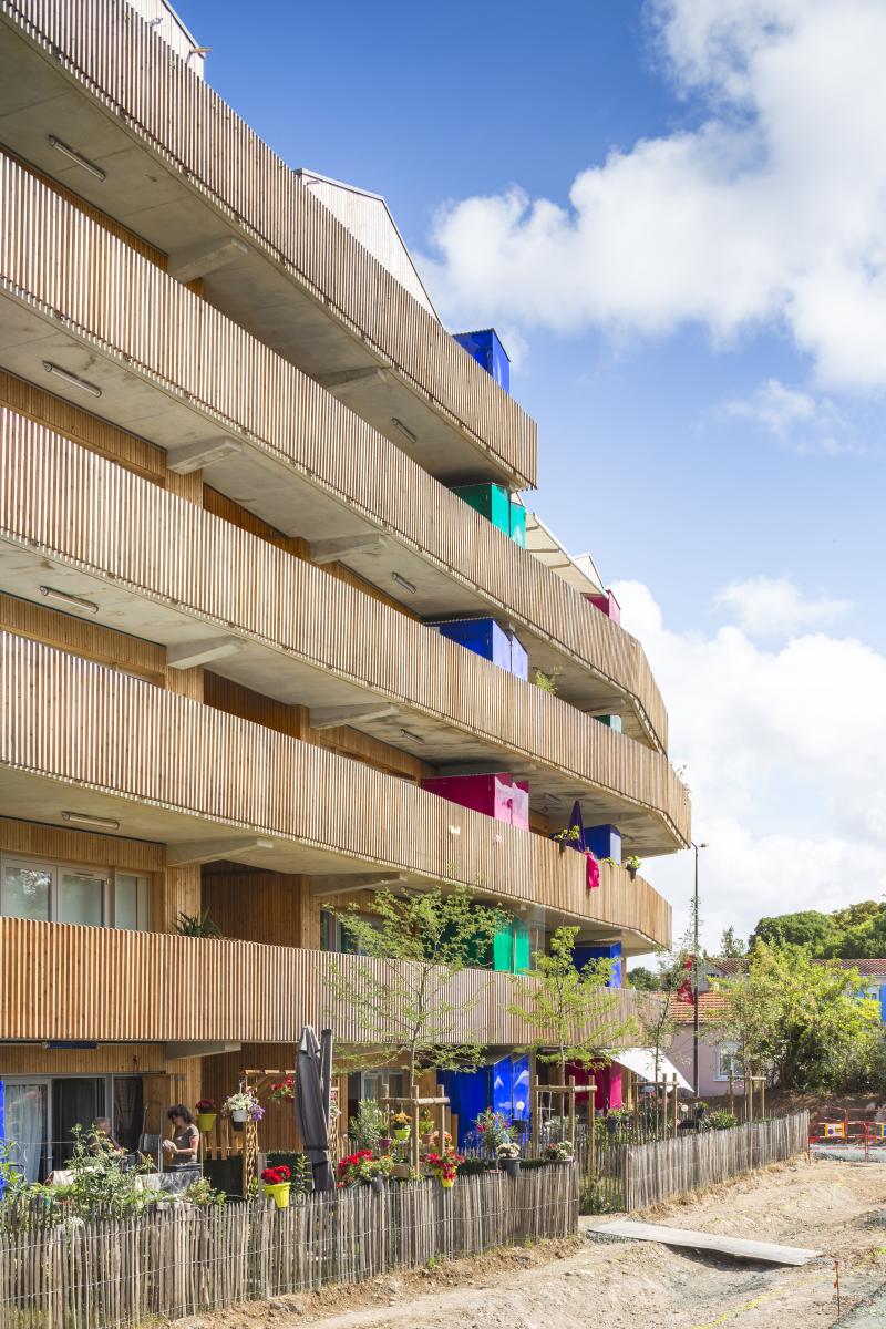 Descriptif technique : Les bâtiments sont construits en structure béton, l’isolation par l’extérieur est protégée par un bardage bois en mélèze naturel, purgé d’aubier. Le béton apporte l’inertie thermique nécessaire au confort d’été, les consoles ponctuelles et les poteaux qui supportent balcons et coursives permettent de limiter les traversées d’isolant, supprimant la quasi totalité des ponts thermiques. Deux fois plus performants que le niveau réglementaire exigible en termes d’étanchéité à l’air, les bâtiments atteignent un niveau RT2012 -20%, avec des gains de plus de 30% en Cep et de plus de 50% en Bbio. PEFC (Gestion forestière durable) Marquage CE Bâtiment Energie Environnemen