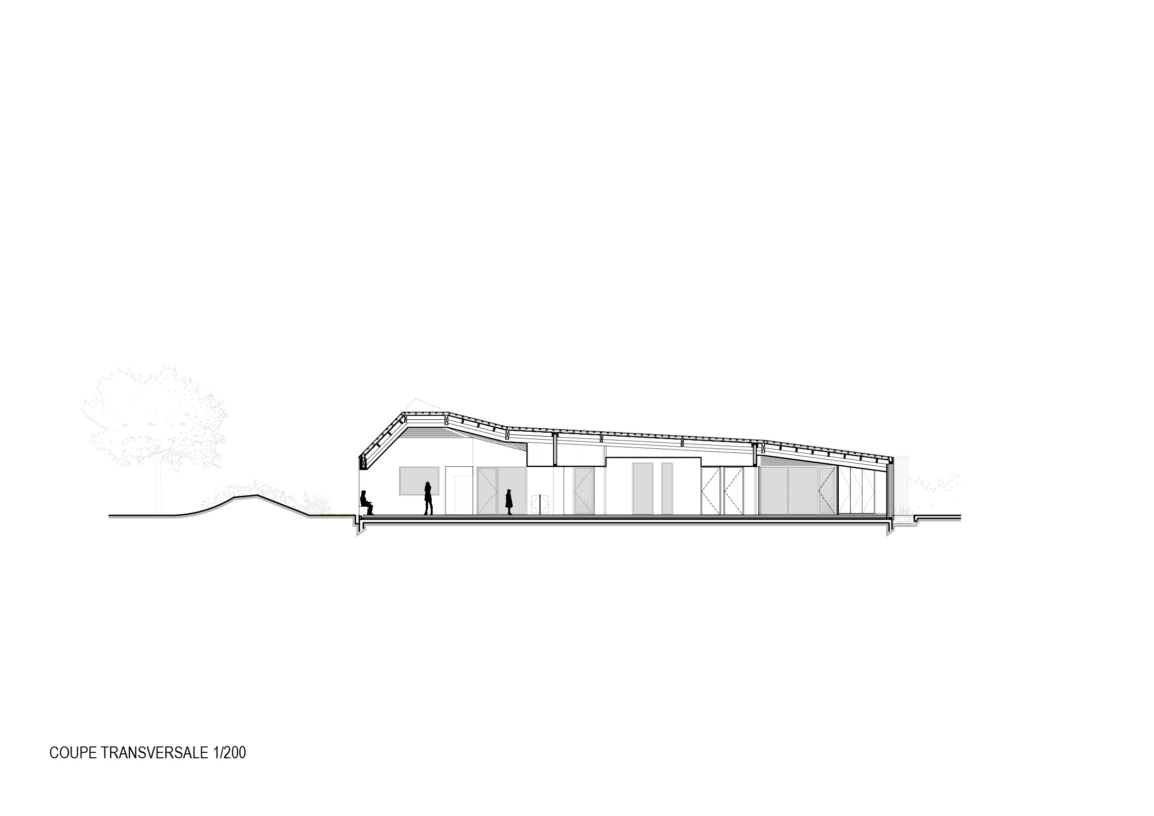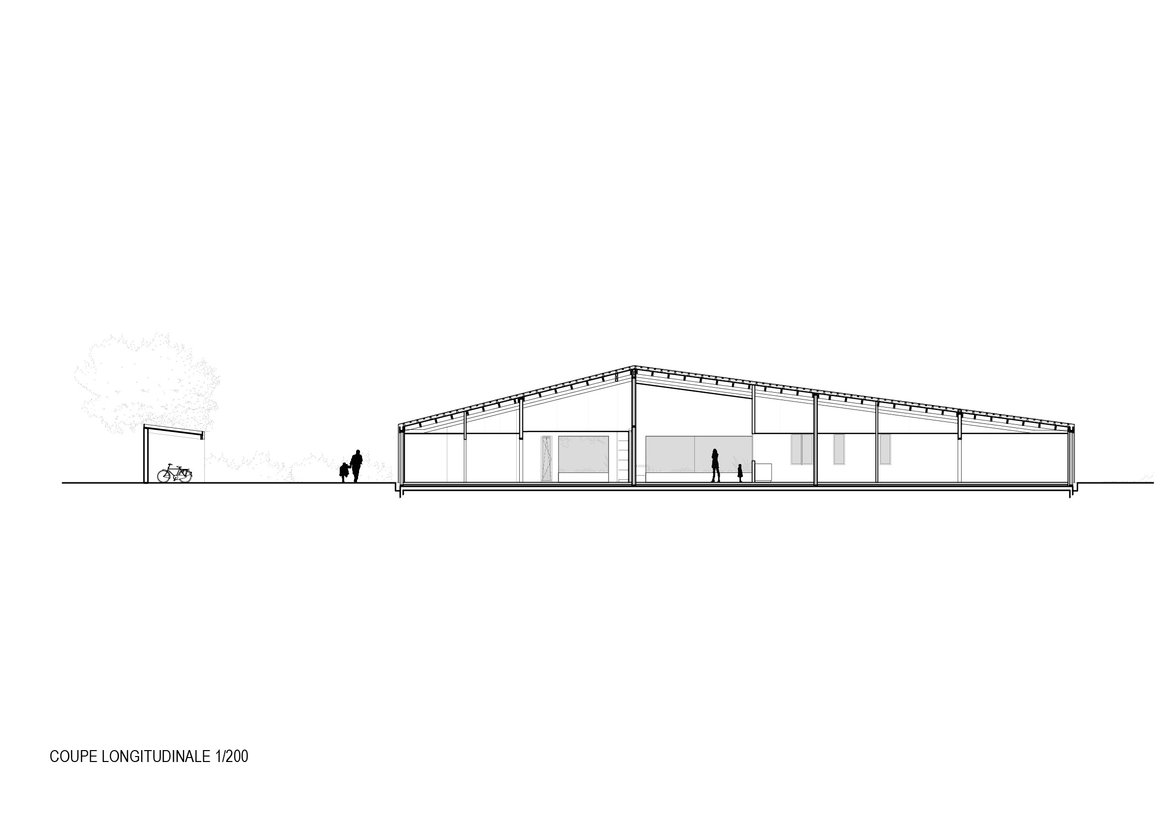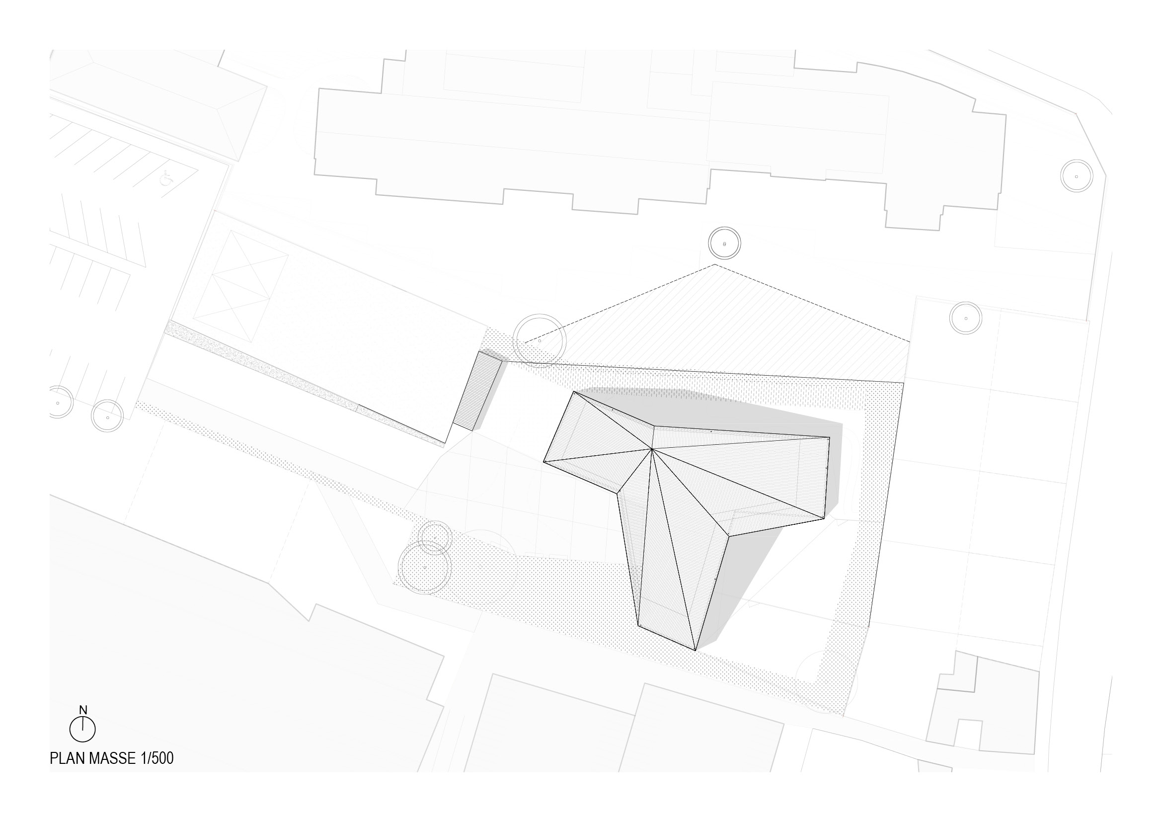 Ce projet est conçu comme un objet architectural sculpté par son contexte. Sa forme en étoile répond aux lignes de force des existants. Ce jeu d’avancées et de reculs génère à l’intérieur, un cœur de bâtiment qui rassemble et distribue dans les ailes les différents espaces ; et au-dehors, des espaces extérieurs enveloppant. L’image architecturale recherchée est celle d’un volume uni, où façades et couverture constituent une seule enveloppe, une seule matière. Il rappelle l’imaginaire de l’enfance autour de la « cabane en bois », tout en affirmant une écriture contemporaine.
