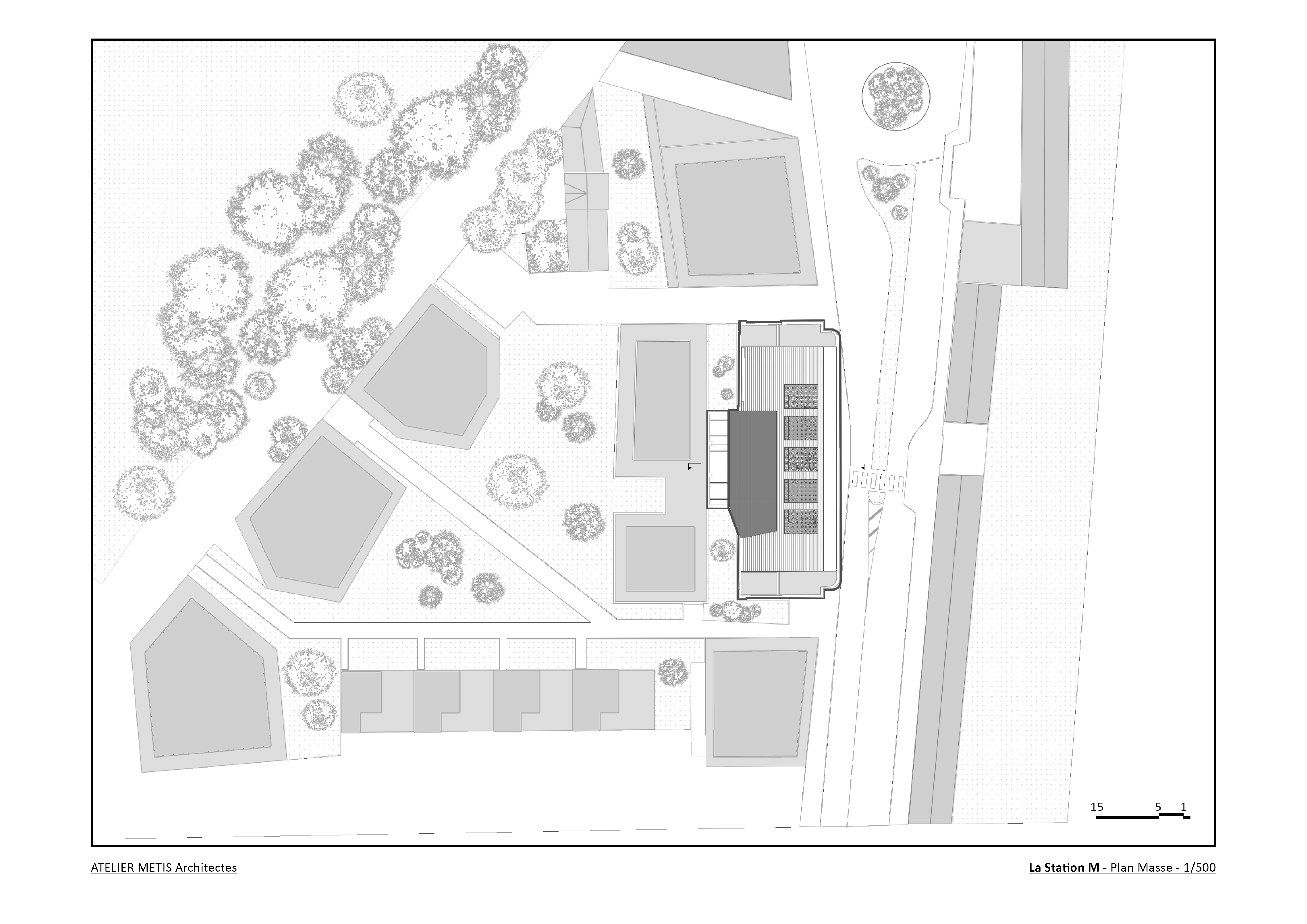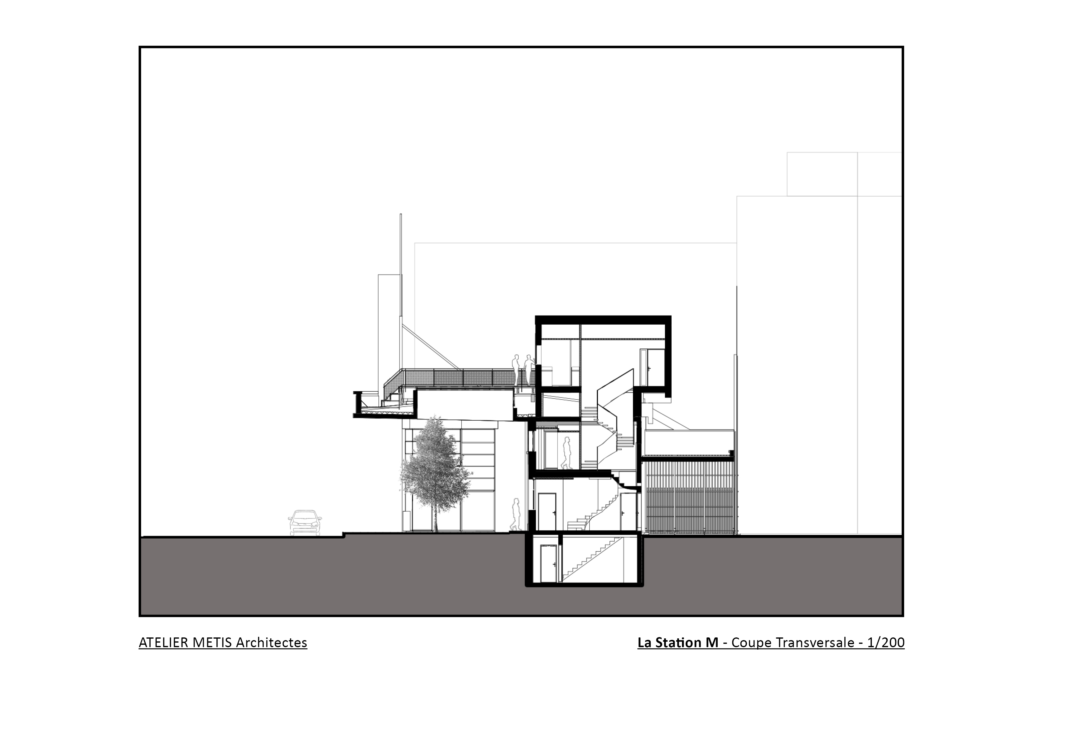 C’est un ancien garage des années 30, à l’abandon, Route de Lyon. Eventré, décharné, il n’en est pas moins remarquable avec son auvent de 8m en porte-à-faux qui le classe parmi les bâtiments patrimoniaux du XX ème siècle. Pour panser ses plaies, nous avons réalisé un travail chirurgicale de couture, grâce aux performances offertes par le matériau bois : plancher en pin massif, volumes suspendus habillés de résilles en fraqué, escalier en chêne, plafonds acoustiques en tasseaux et larges châssis vitrés, associés au « béton planchette » d’origine, donnent un second souffle à la STATION M.