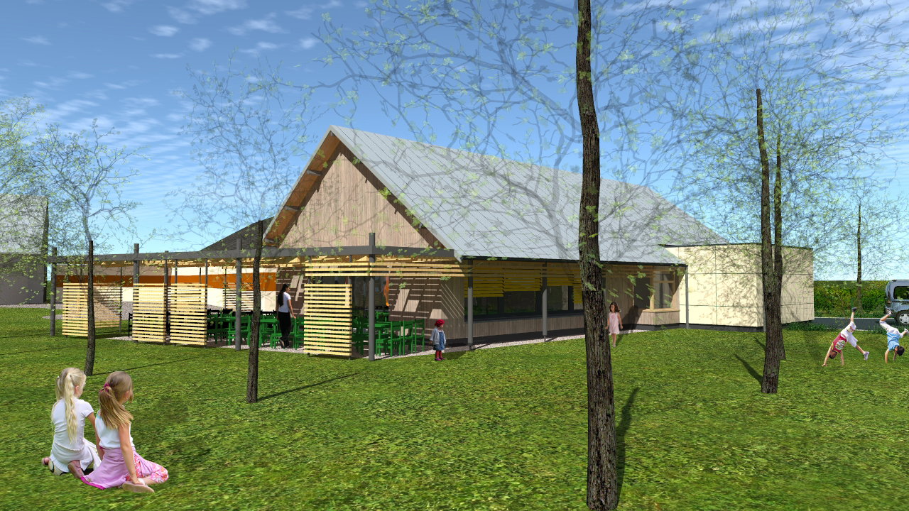 Descriptif technique : Le bâtiment repose sur une infrastructure en béton armé sur semelles filantes et dallage porté sur 240mm d'isolant R:5,80m²K/W. La structure des parois extérieures est en ossature bois 145mm R:4,53 m²K/W avec remplissage d'isolant en laine de verre avec panneau isolant en fibre de bois de 120mm R: 2,17m²K/W en face externe sous bardage bois. L'ensemble de la charpente bois est composée suivant les zones de fermette industrielles sous couvertures bac-acier double pente (zone restauration) et pannes bois monopente (entrée principale). Le chauffage est assuré par un système de géothermie alimentant l'école existante et le nouveau bâtiment de la cantine scolaire. Cette alimentation est ensuite distribuée au sol pour la partie cantine scolaire et radiateurs pour les locaux techniques.