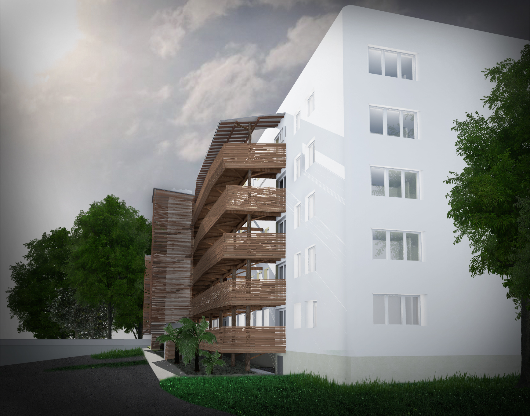 L'adaptation aux normes d'accessibilité aux personnes à mobilité réduite d'une barre de logements existante intégrant 5 cages d'escaliers était le fondement du programme initial. La création de 2 cages d’ascenseurs et d'escaliers ainsi que des coursives à chaque étage a permis de répondre à ce préalable. Le choix de la structure bois, avec coursives en porte-à-faux, à l'écriture architecturale plus fine qu'une structure béton, a conféré une chaleur aux espaces de déambulation en rupture avec l'esprit très normé de cette ville nouvelle qu'est Mourenx.