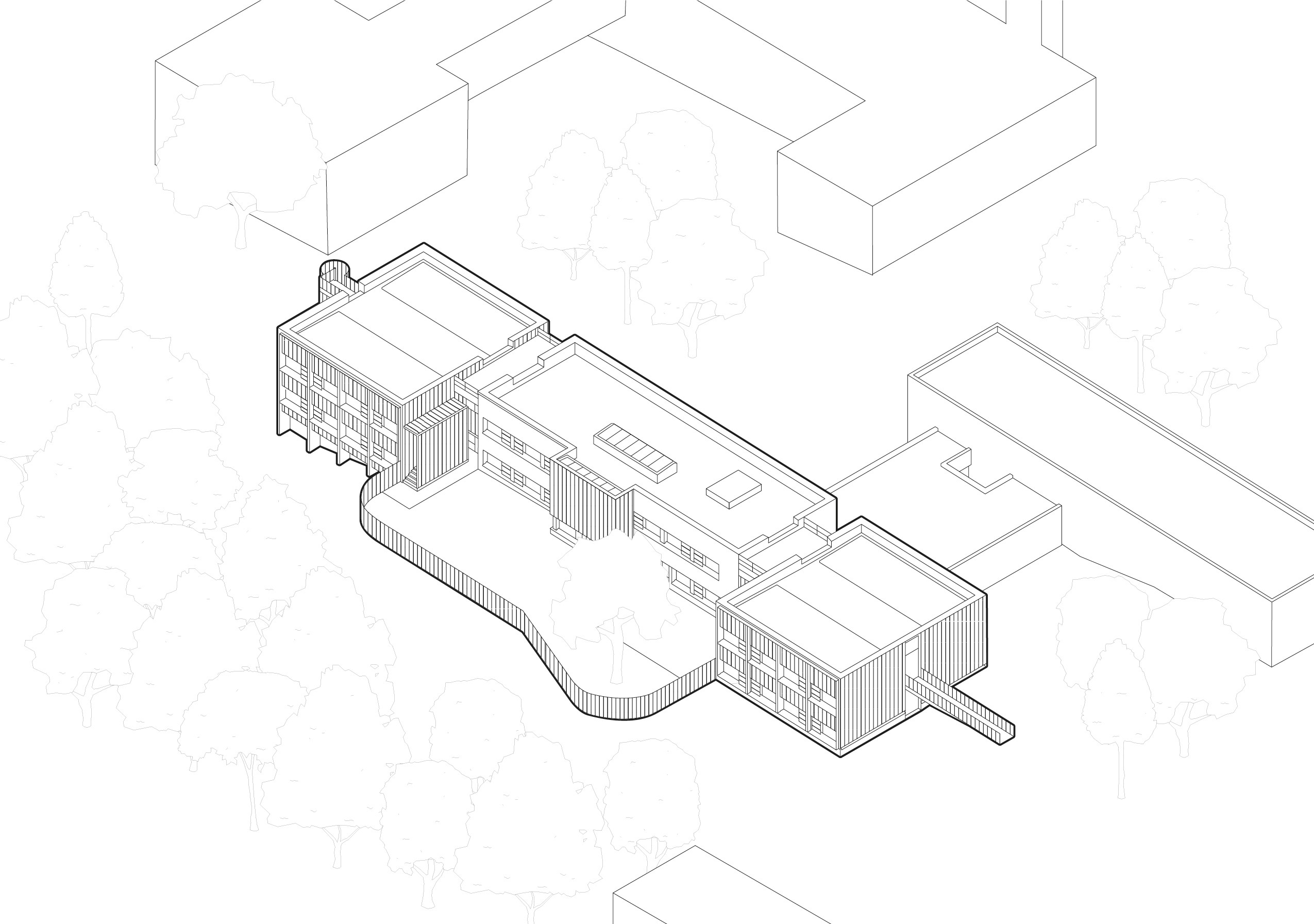 Approche environnementale : Le projet cherche l'intégration visuelle dans le contexte aussi à travers sa matérialité. La partie centrale du pavillon rappelle le caractère original du site avec ses façades en enduit blanc sur façades en ossature bois (FOB) et l'intégration des menuiseries en bois. Les ailes latérales, construites entièrement en murs et planchers en structure bois CLT, présentent des façades en ossature bois et bardage également en bois, afin de continuer l'harmonie de matériaux.
