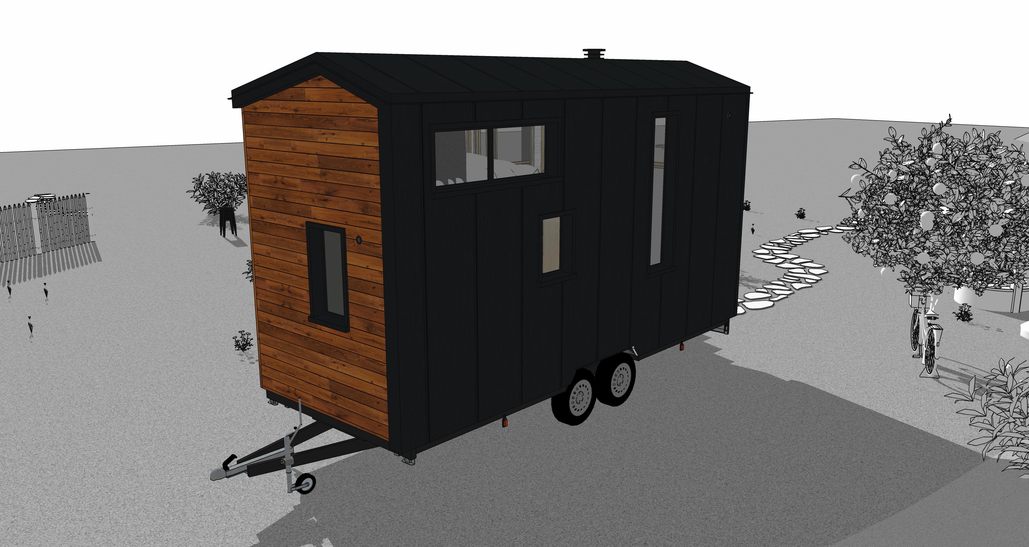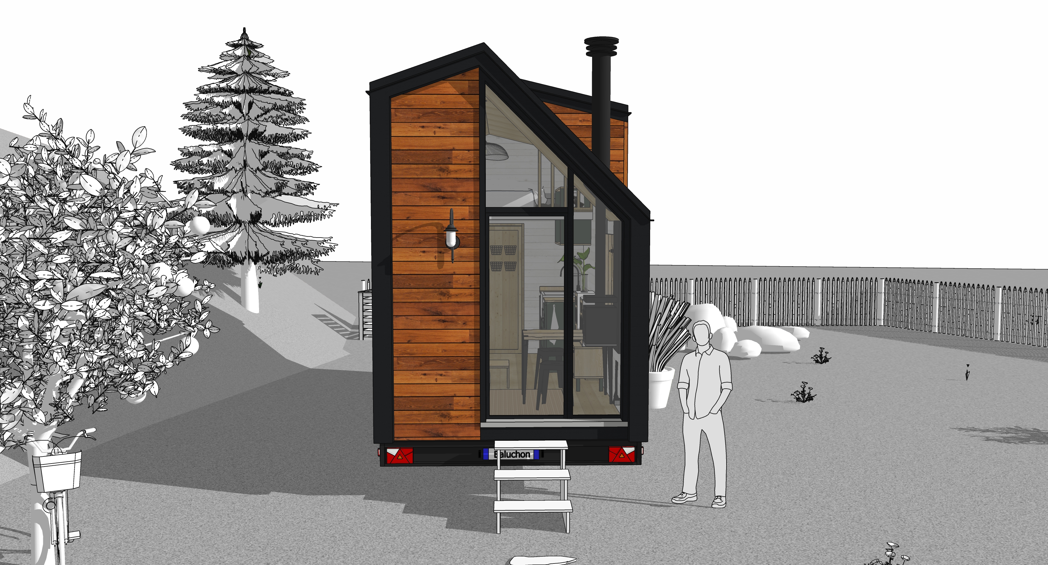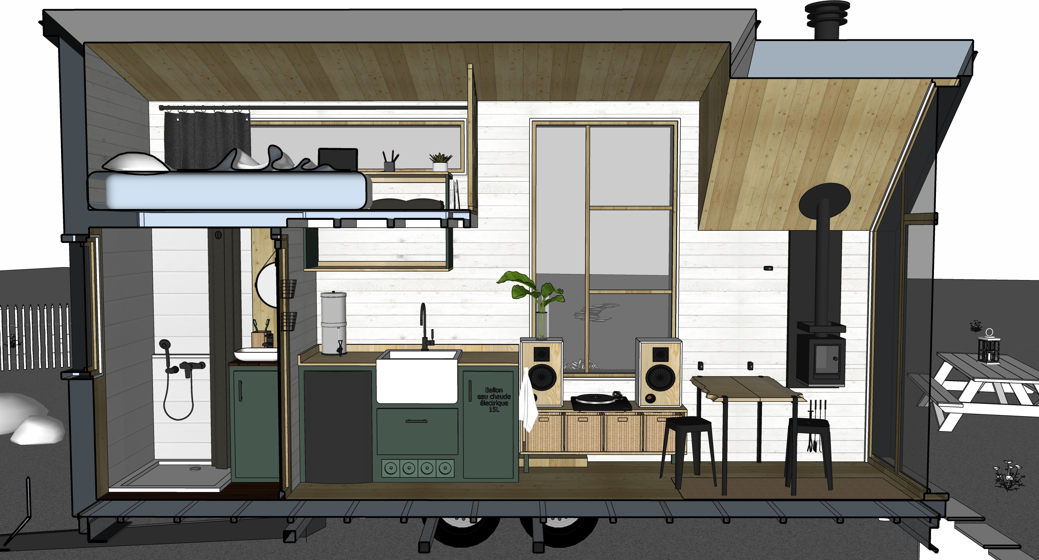 Descriptif technique : La Tiny house Sauvage est une construction ossature bois fabriquée sur une remorque routière. Elle respecte donc les règles en vigueur pour le transport (respect du poids global maximum autorisé, de l'équilibre sur le châssis, des dimensions du gabarit routier). La remorque est fabriquée à 7km de notre atelier et les menuiseries mixtes bois/aluminium à 13km. Le reste de la maison est fabriquée dans nos locaux, avec des charpentier·ères et menuisier·ères d'expérience et de manière artisanale.