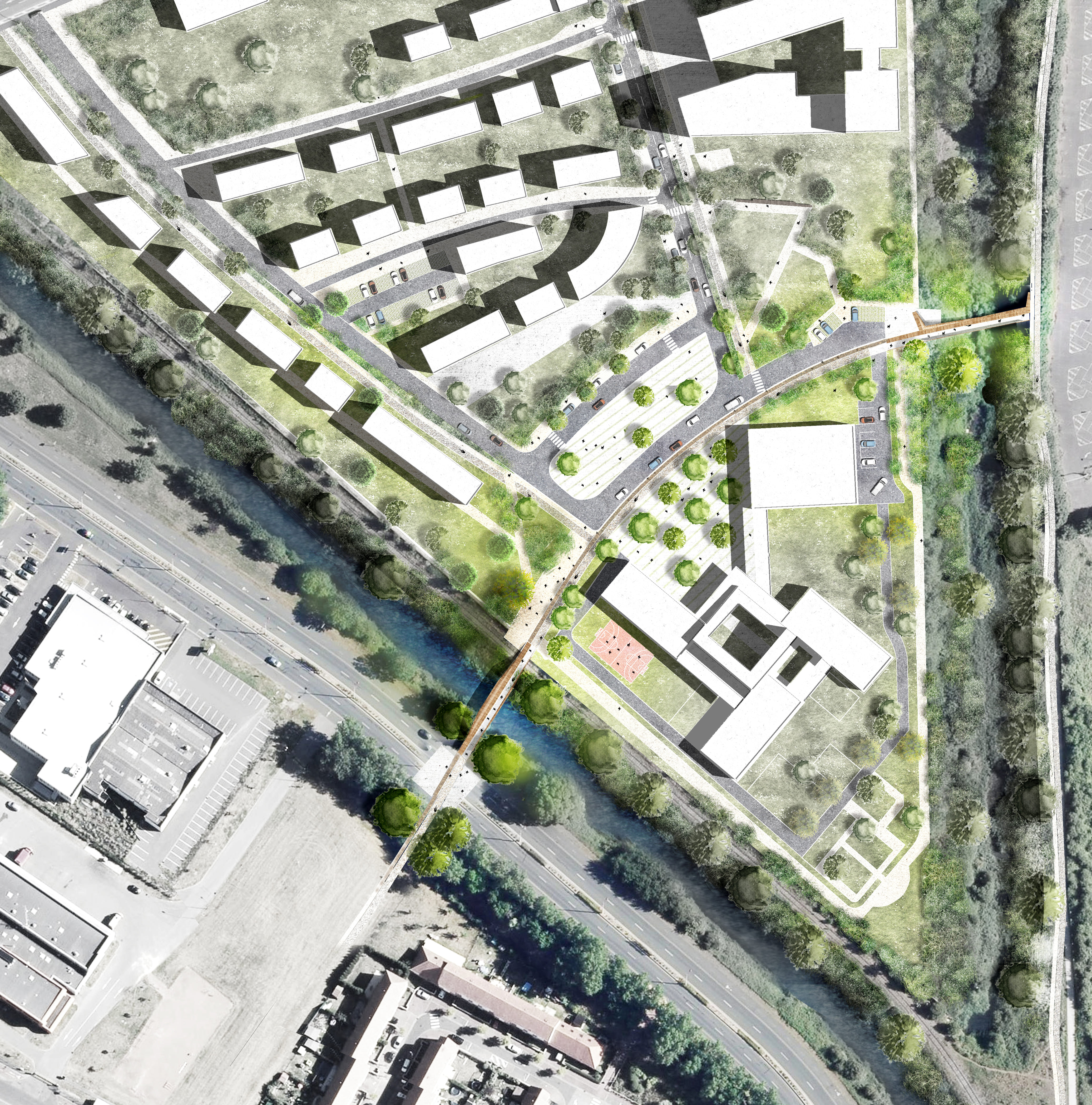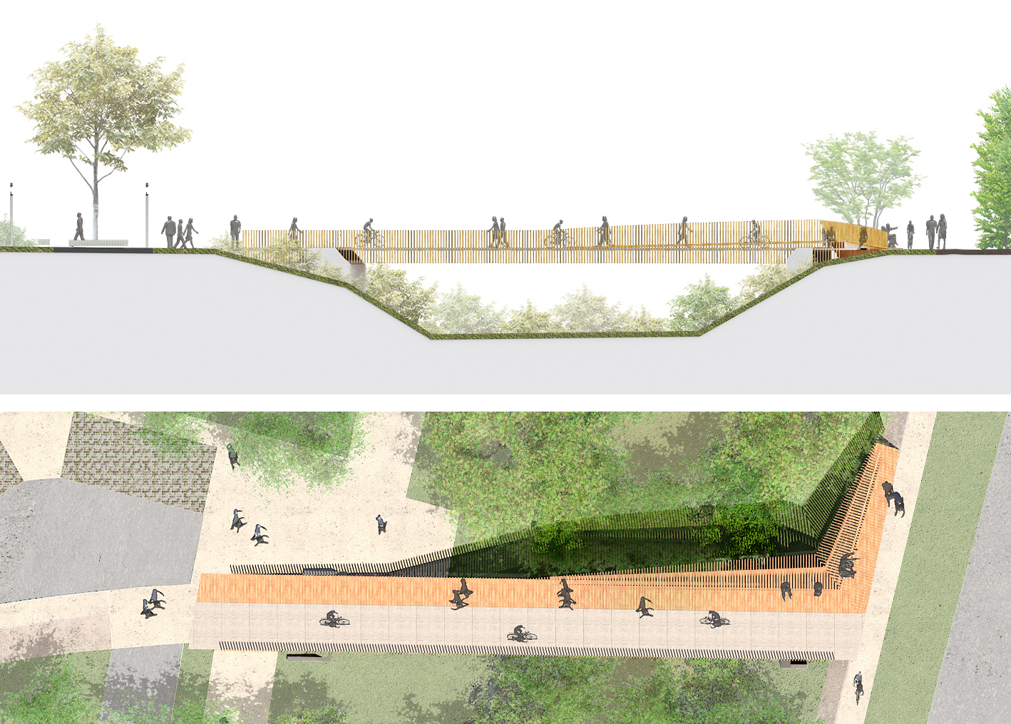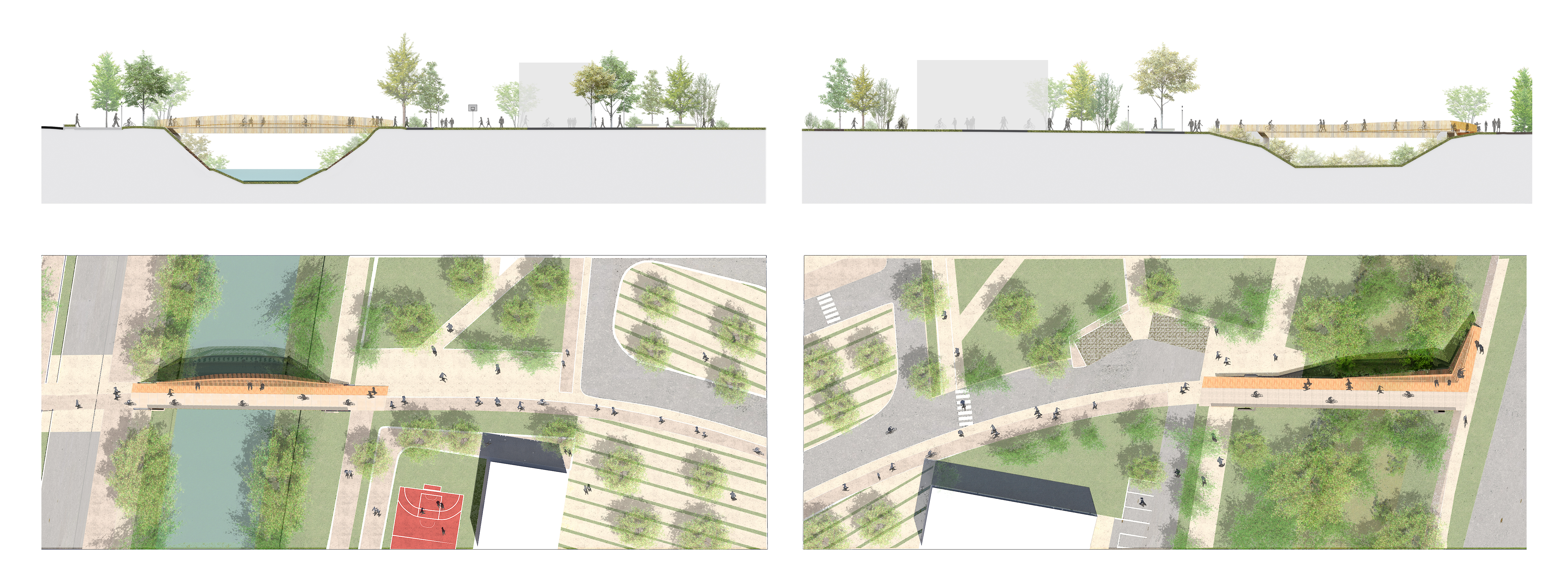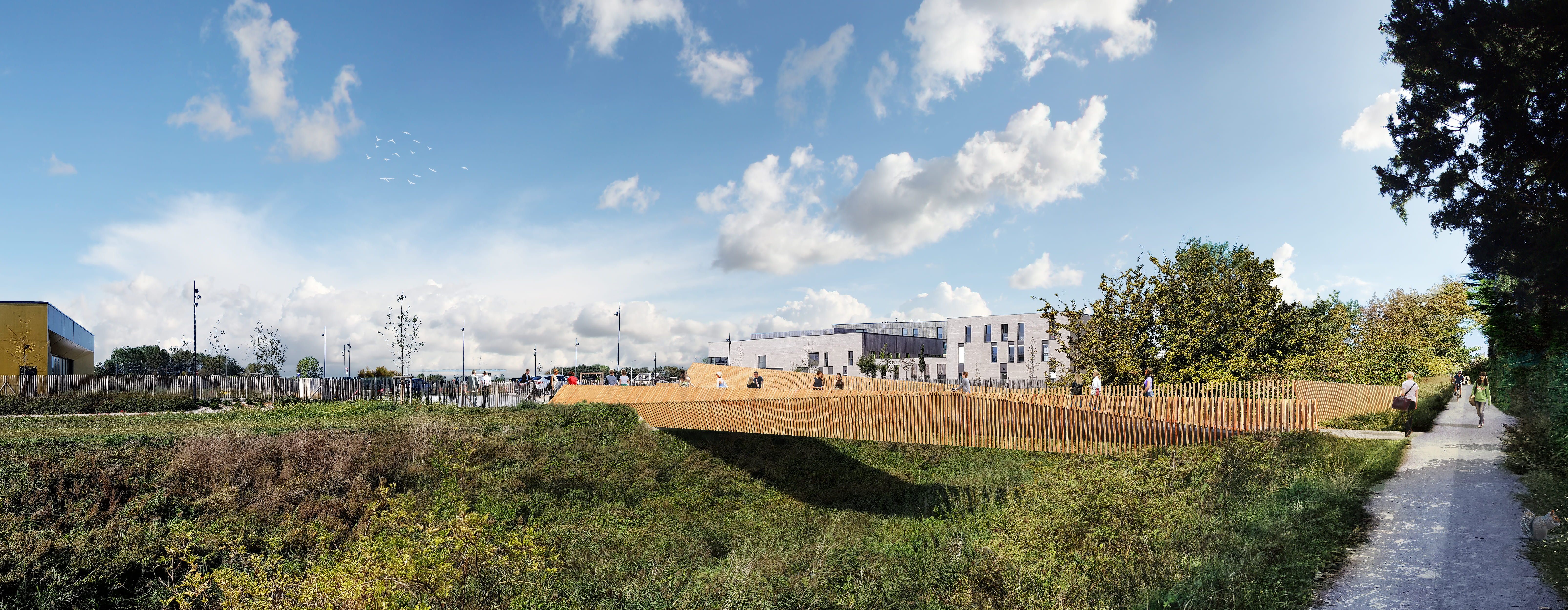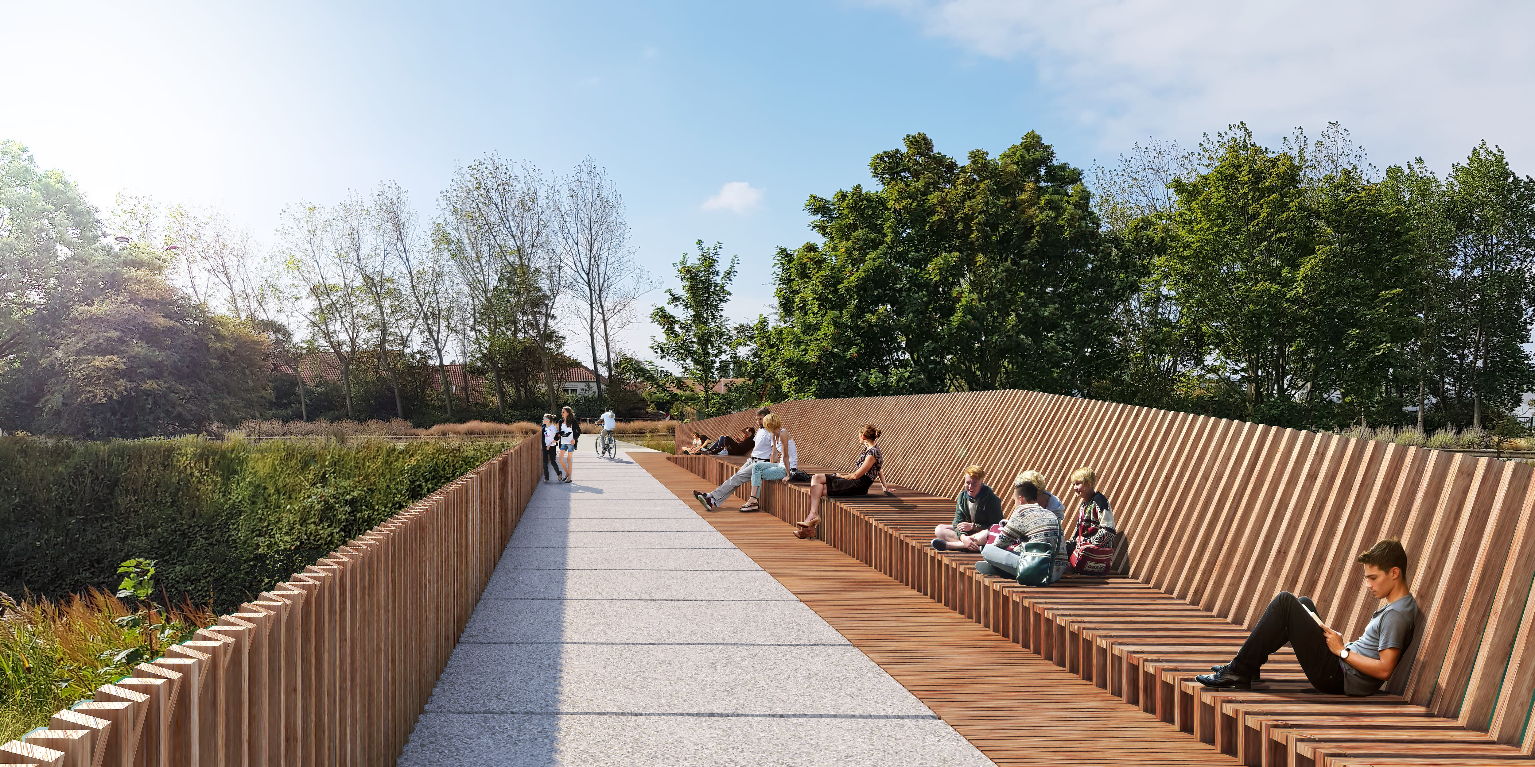 Les passerelles viennent relier le nouveau quartier de la ZAC Coubertin à la Ville de Calais par une liaison douce traversante. Nous n'avons pas souhaité de rupture formelle entre les deux ouvrages, mais plutôt leur associer un langage commun, afin d'accentuer la continuité du cheminement doux au sein du quartier. Les lames bois du platelage se retournent en assises et garde-corps, créant ainsi un langage formel unique. Au-delà du simple franchissement, les passerelles deviennent un véritable espace public, offrant de nouvelles vues sur les canaux, et un lieu de rencontres ou de flânerie.