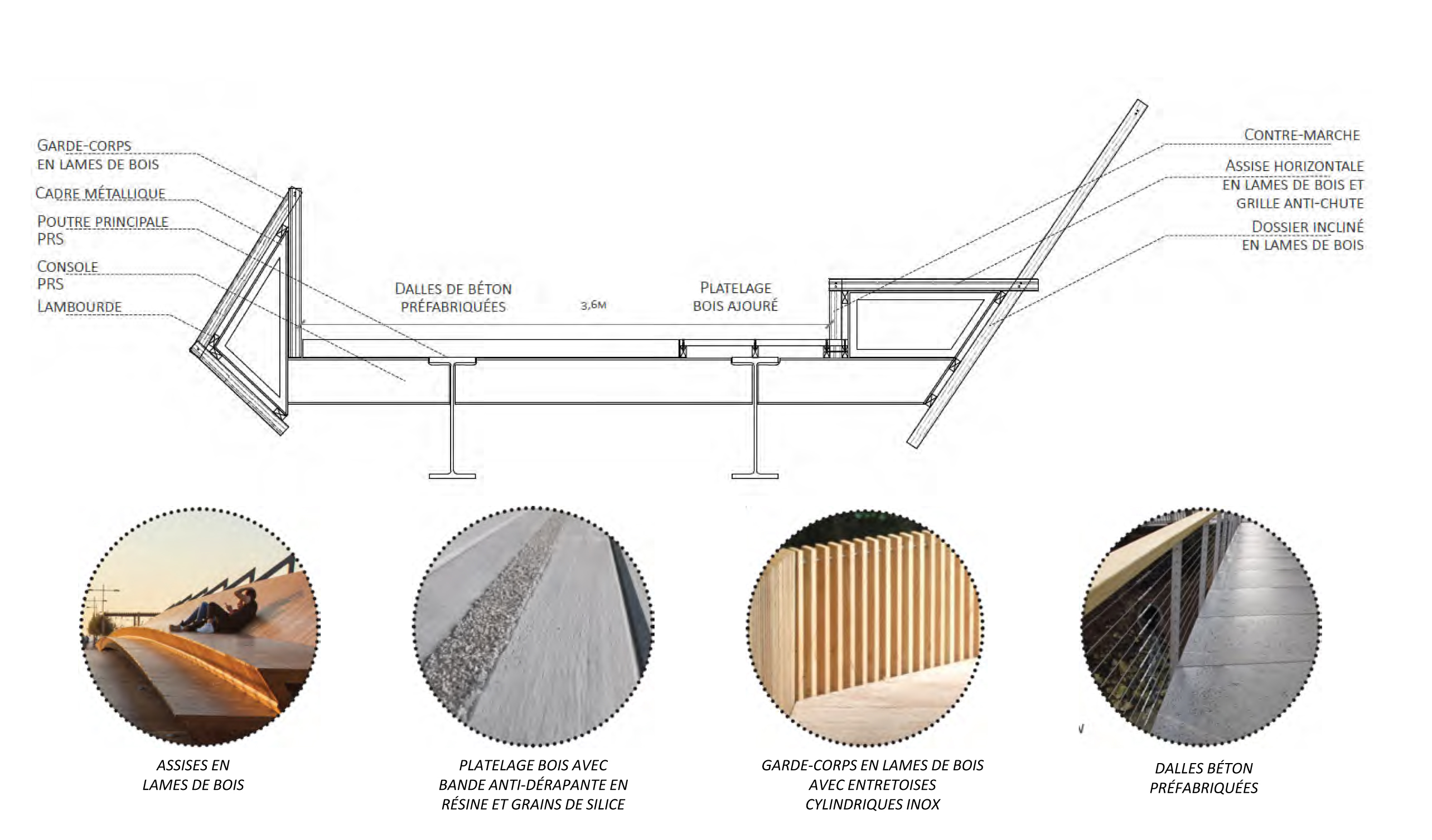 La structure de la passerelle est composée de deux poutres latérales en acier, complétées par des traverses. Le platelage côté cycles est composé de dalles béton préfabriquées, et côté piétons par un platelage bois. Celui-ci se retourne sur les flancs de l'ouvrage en lames bois, faisant office de garde-corps ou d'assises. L'éclairage est composé de barrettes leds. Celles-ci éclairent le cheminement piéton à travers les assises de manière homogène. Côté garde-corps, elles sont intégrées verticalement dans les lames bois, et viennent éclairer le cheminement cycles avec plus de contraste.
