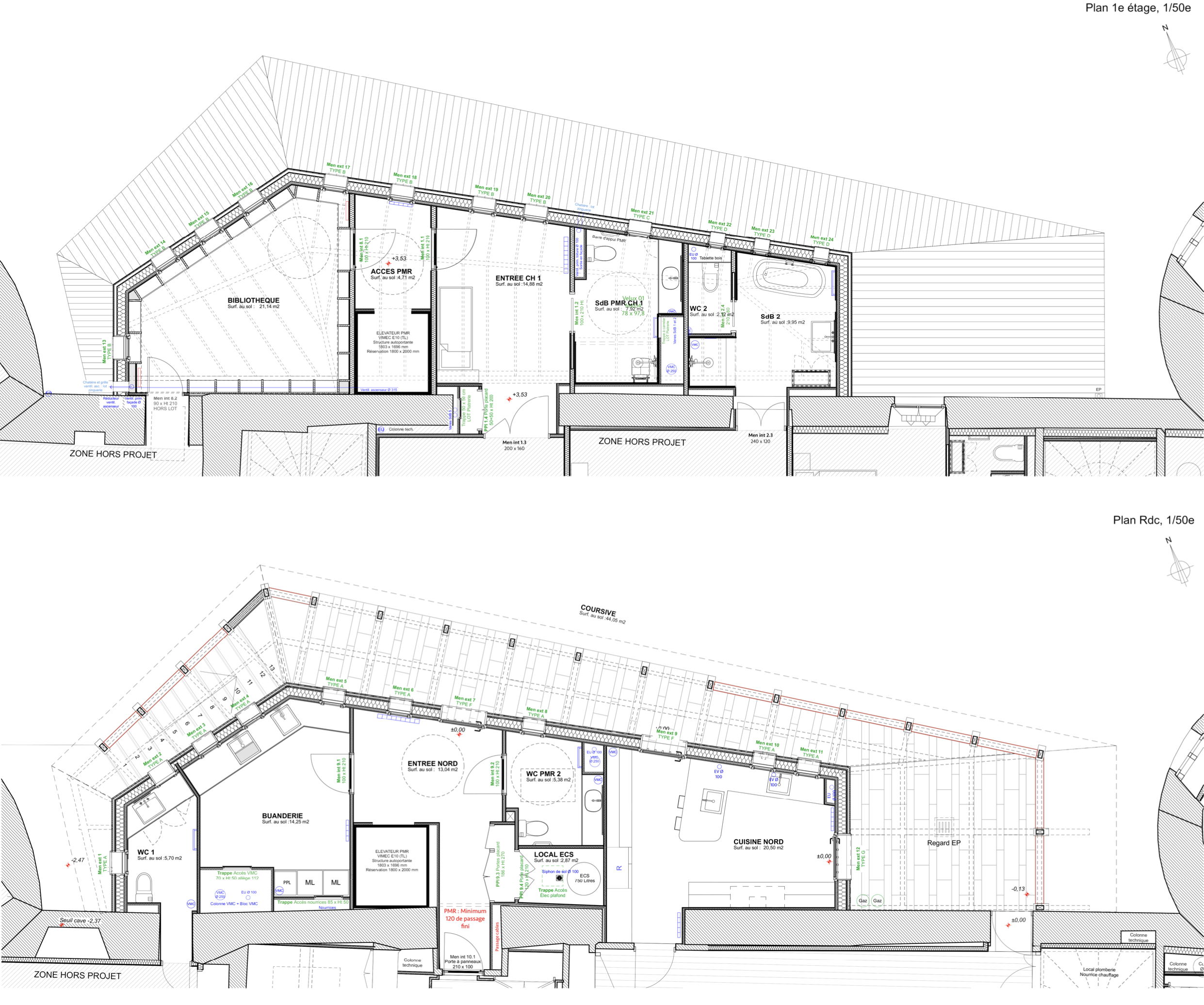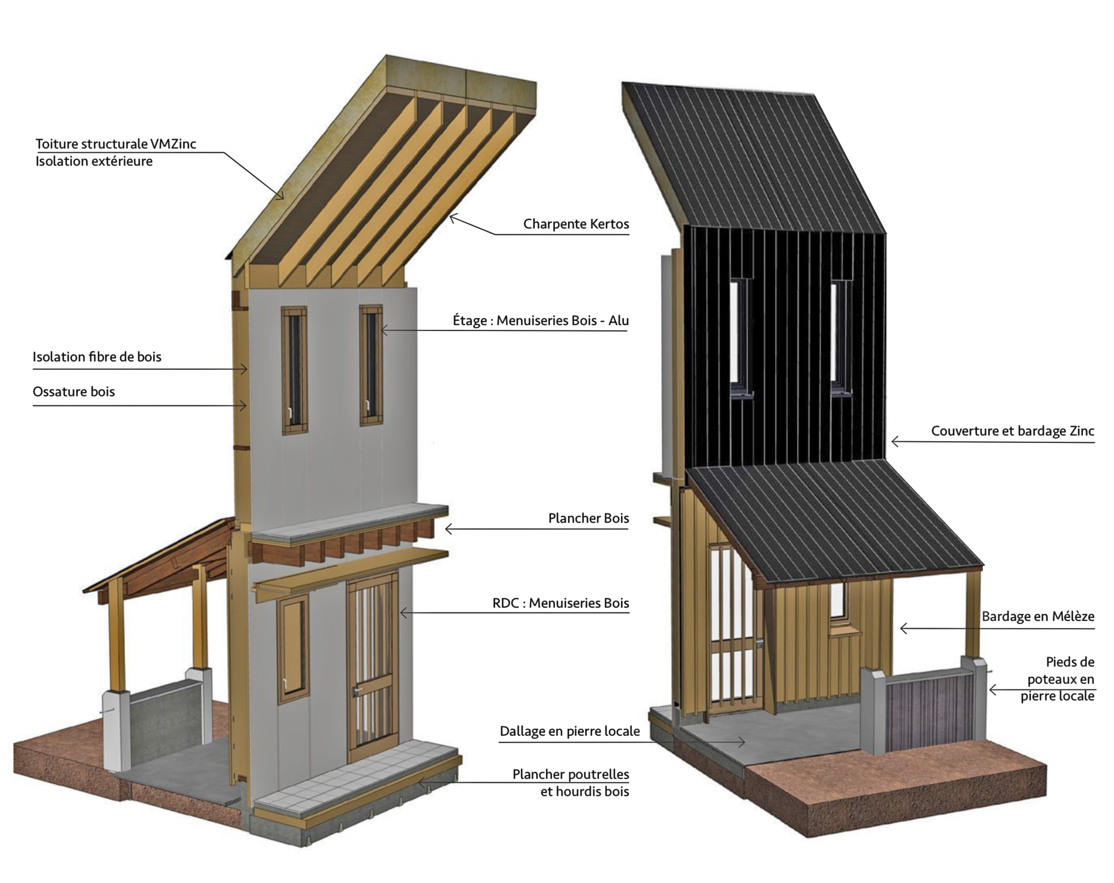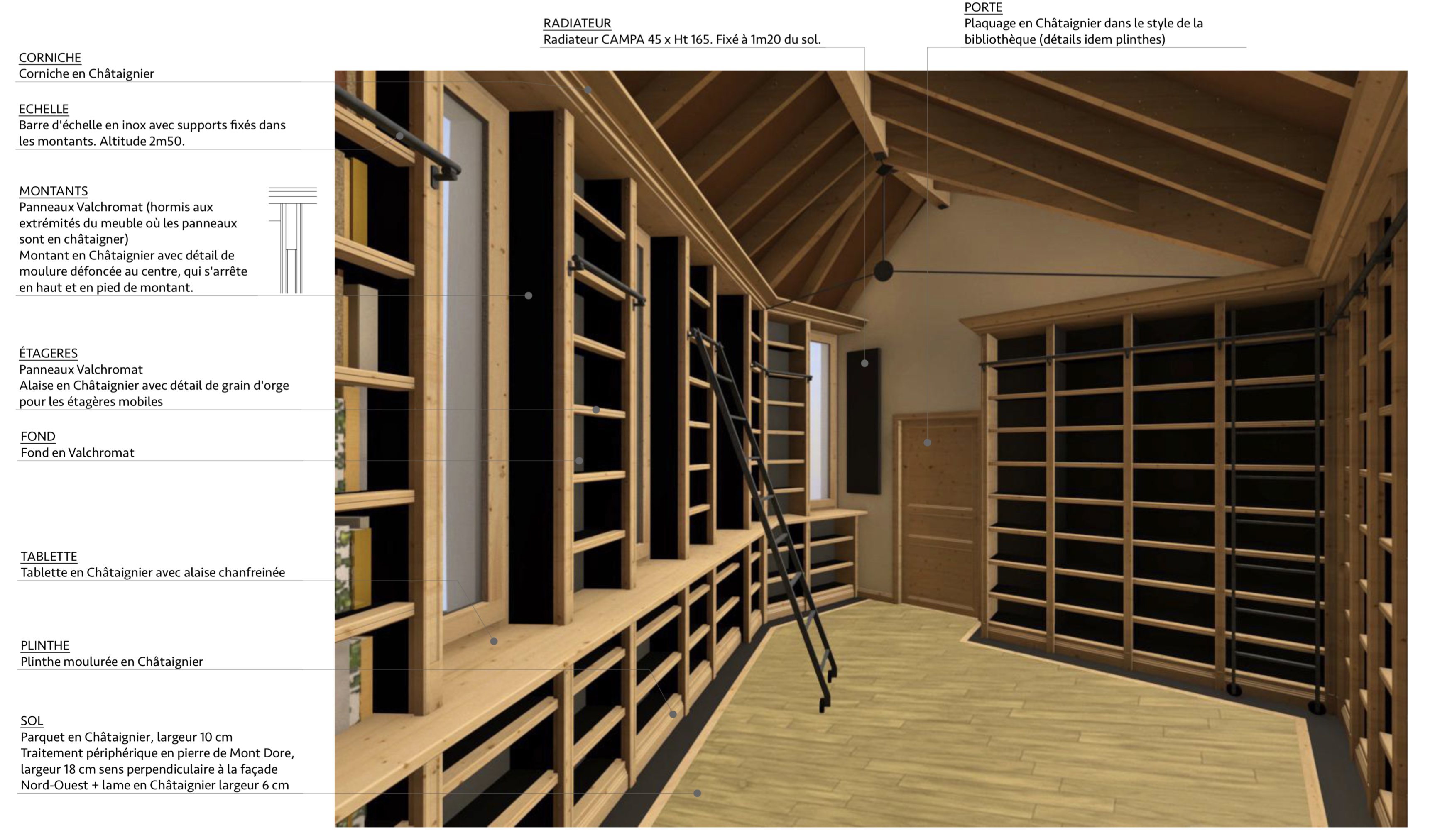 Descriptif technique : Cette extension de 140m2 a été réalisée avec un volume de bois estimé à 44 m3 au total, sous la forme de bois massif et de bois transformés. La charpente intérieure a été réalisé en chevron Lamibois et panneau de bois massif contrecollé avec des assemblages traditionnels, et une ferme sous-tendu avec des tirants métalliques. Les planchers intérieurs sont en pose traditionnelle et d’essence châtaignier et frêne. Les menuiseries intérieures ont été réalisé en frêne et sur mesure en reprenant des détails des ouvrages existants, les menuiseries extérieures ont été réalisé en mélèze en suivant la trame de la vêture zinc extérieure. Le mobilier intérieur des salles de bain et la bibliothèque ont été réalisé en panneau médium teinté et avec du frêne en pièce d’ornement aboutées.