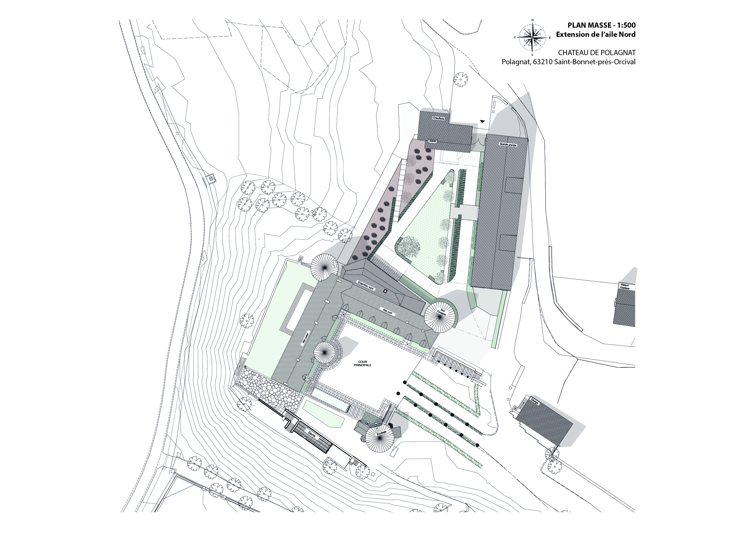 Le projet permet la réhabilitation de l'aile Nord du château de Polagnat en hébergement hôtelier de 15 couchages, grâce à une extension qui abrite les pièces techniques et permet l’accessibilité PMR. Le plan asymétrique permet de s'implanter en retrait des tours et dans l’ombre du bâti existant, pour une intégration discrète. L'objectif du projet est de s’inscrire dans son époque en utilisant des techniques constructives actuelles, tout en reprenant des éléments architecturaux traditionnels. Les matériaux présents sur le site lauze, mélèze grisé.. ont orientés le choix d’une teinte sombre.