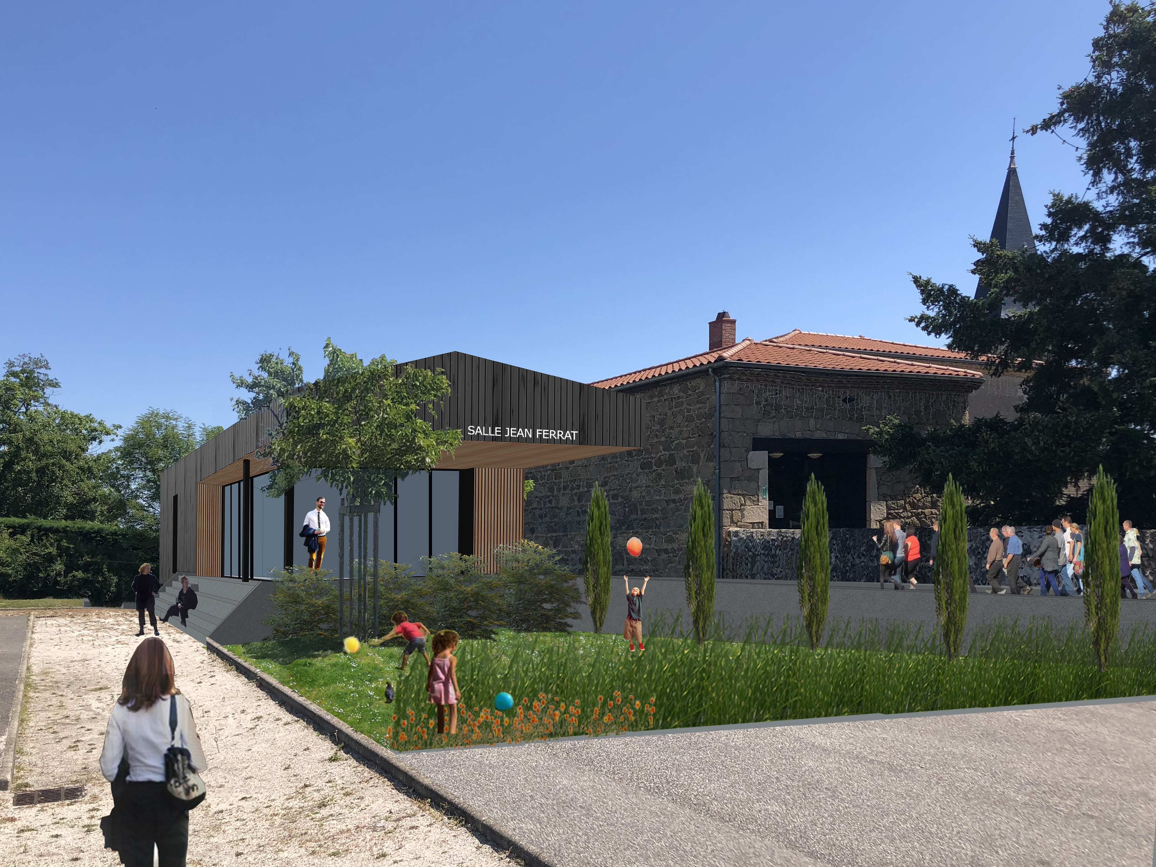 Le projet consiste en la rénovation et extension de la Salle des Fêtes de Lupé, lieu de centralité implanté en coeur de village ancien. Situé en secteur ABF, à proximité immédiate de l'église et du château de Lupé, la volumétrie du projet s'inspire de l'existant afin de pouvoir s'insérer harmonieusement dans le site et créer des liens privilégiées avec la mairie, le city-stade et le parc voisin. Une ossature mixte béton/bois a été privilégiée en relation avec la grange en pierre -RDC semi-enterré en béton armé -RDJ en ossature bois