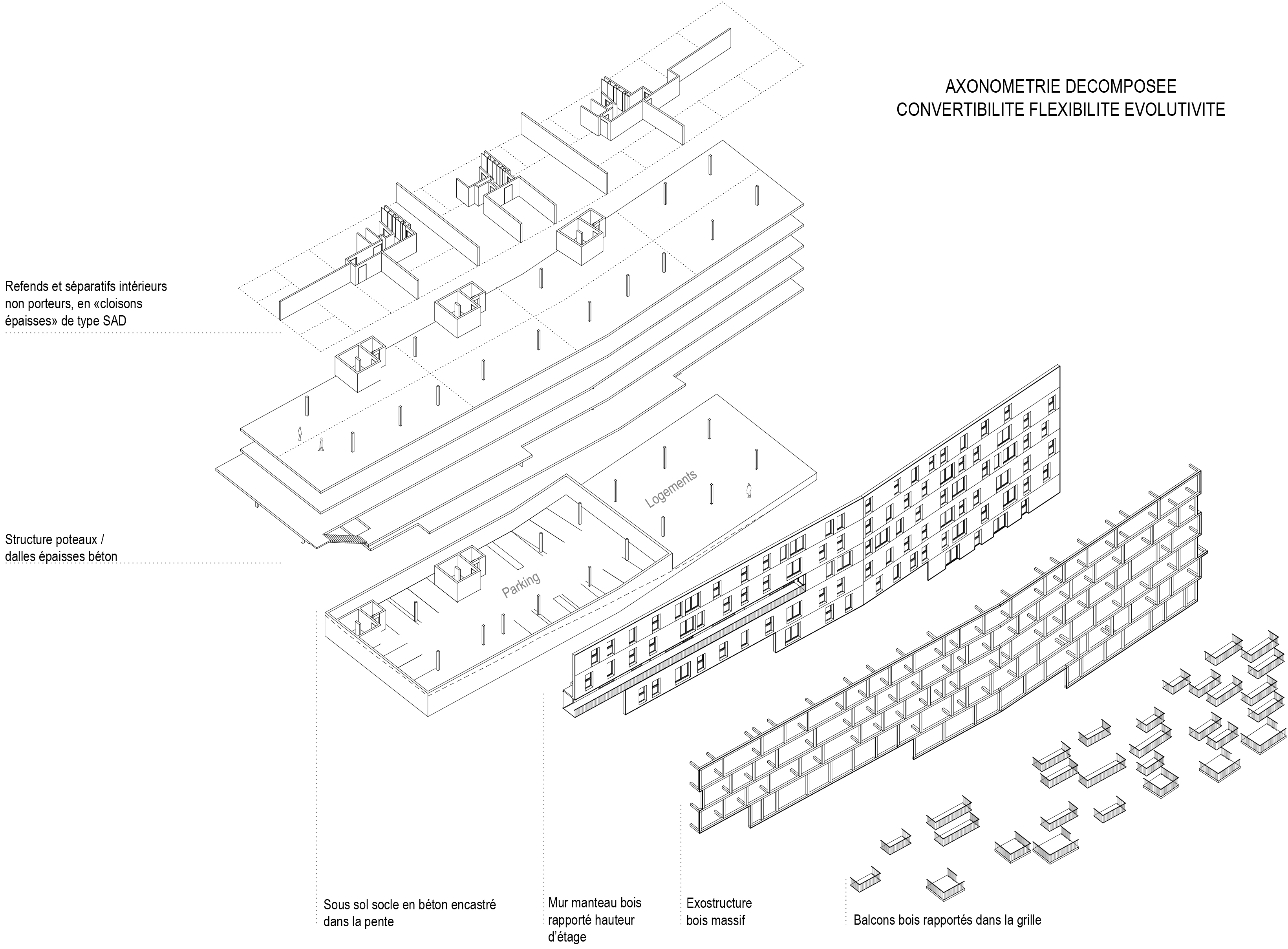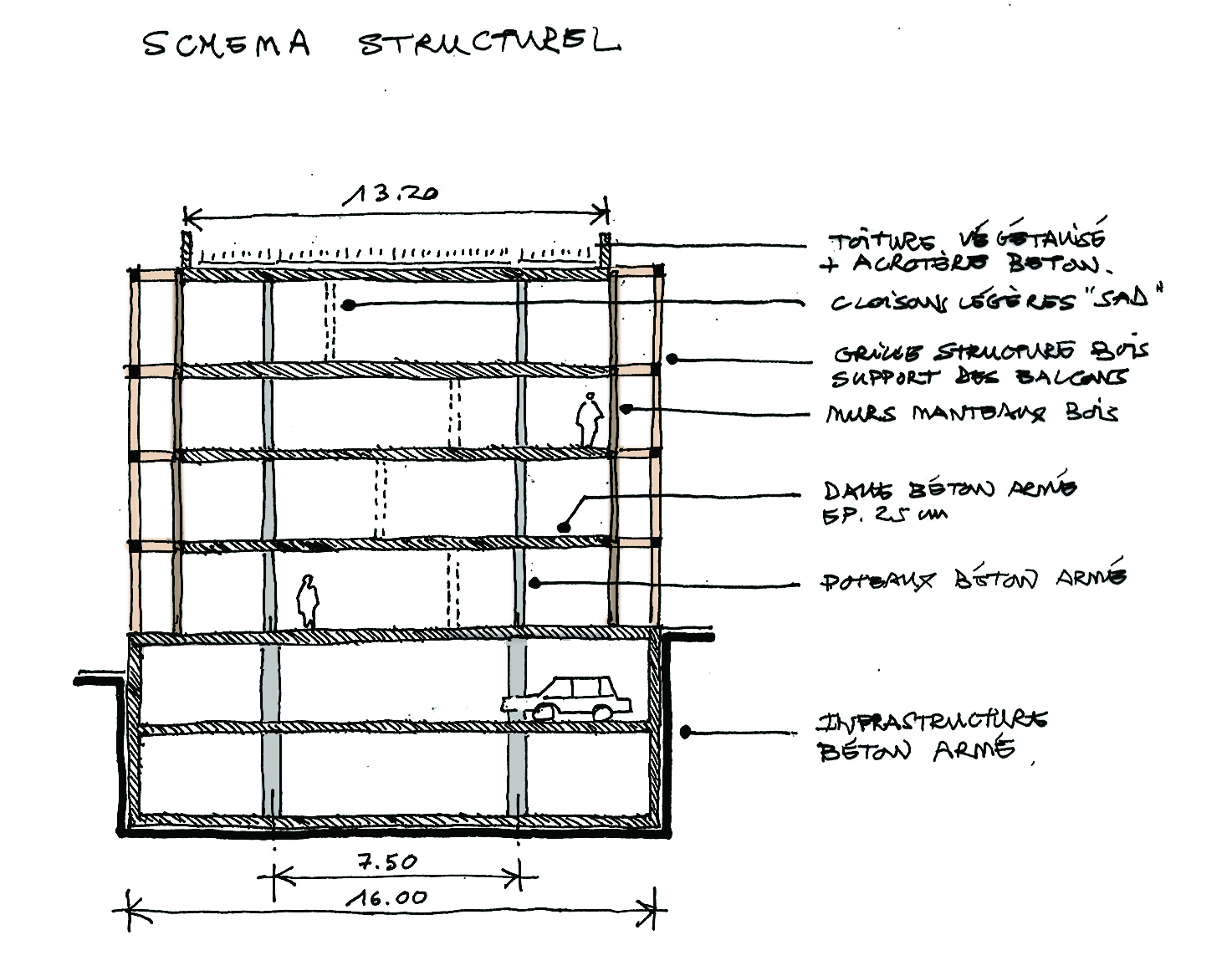 Descriptif technique : Système poteaux dalles béton sans poutres ni refends. L'ensemble dégage des plateaux libres en termes de gros œuvre flexibles et reconvertibles grâce à l'utilisation de SAD comme séparations. Les poteaux coïncident avec les parkings ; et sont mis en retrait pour optimiser la déformation des dalles et éviter les interfaces avec les façades. Les murs manteau bois, non porteur, sont rapportés en nez de dalle. Ainsi la configuration des ouvertures est libre, aussi bien en étude qu'en cas de reconfiguration. Les finitions sur les MOB, sont de type bardage douglas faux ajouré ventilé, ou enduit non ventilé. A cela s'ajoute enfin la mise en place d'une exo-structure douglas périphérique sur l’extérieur, trame accueillant des balcons ponctuels et claustra bois en quinconces.