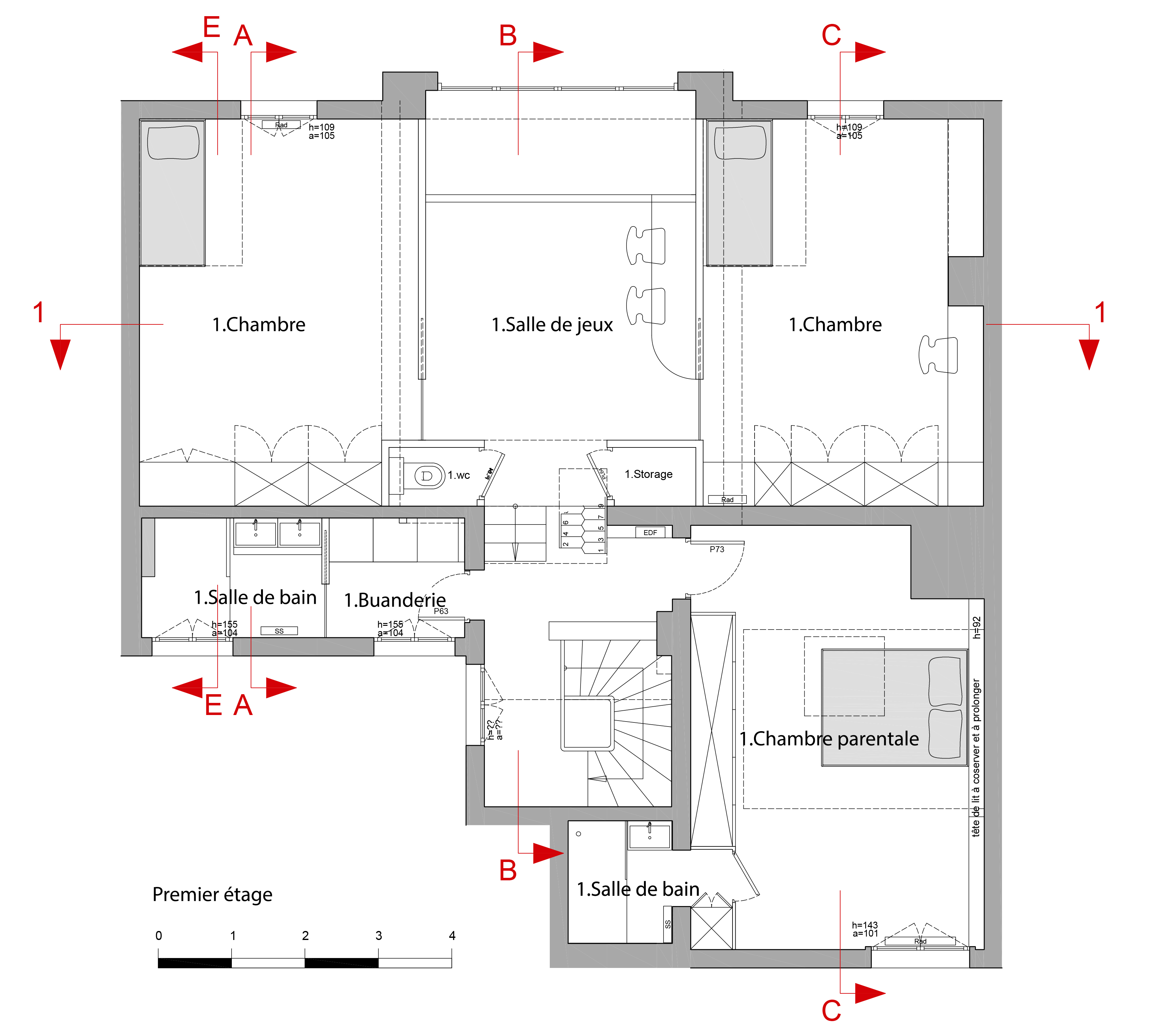 Approche environnementale : Une attention particulière a été portée afin d’adopter une démarche responsable : de l’organisation spatiale à la décoration d’intérieur, en passant par le choix de matériaux et du bois français. Le parti pris a été de conserver le maximum d’éléments anciens tels que la brique ou le parquet du rez de chaussée restaurés. De même, les radiateurs en fonte, et la cheminée ont pu être récupérés .Ces éléments au-delà de la démarche écologique de réemploi permettent de garder l’identité du logement tout en le transformant en une habitation chaleureuse et contemporaine.
