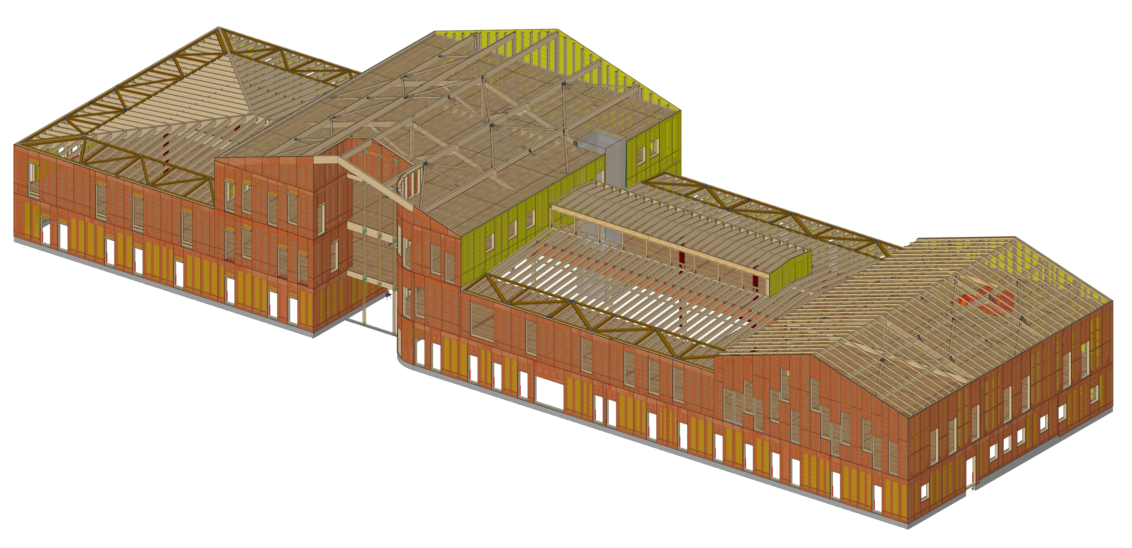 Descriptif technique : Un système constructif rationnel composé de portiques transversaux en trame régulière répond à la volumétrie affirmée mais compacte du projet architectural. La structure associe différentes techniques : poteaux poutres bois et poutres acier, murs ossatures bois en façades et charpente traditionnelle bois. Cette conception garantit la flexibilité d’usage du bâtiment : modifications de cloisonnements, changement de destination, déconstruction partielle ou totale en fin de vie, réemplois… Le système énergétique intègre le confort d'été assuré par le natural cooling du captage sur nappe phréatique. Le confort acoustique a également fait l’objet d’un traitement soigné : parois et vitrages adaptés, isolations murs et sols, correction acoustique (majoritairement en bois), pièges à son sur VMC…