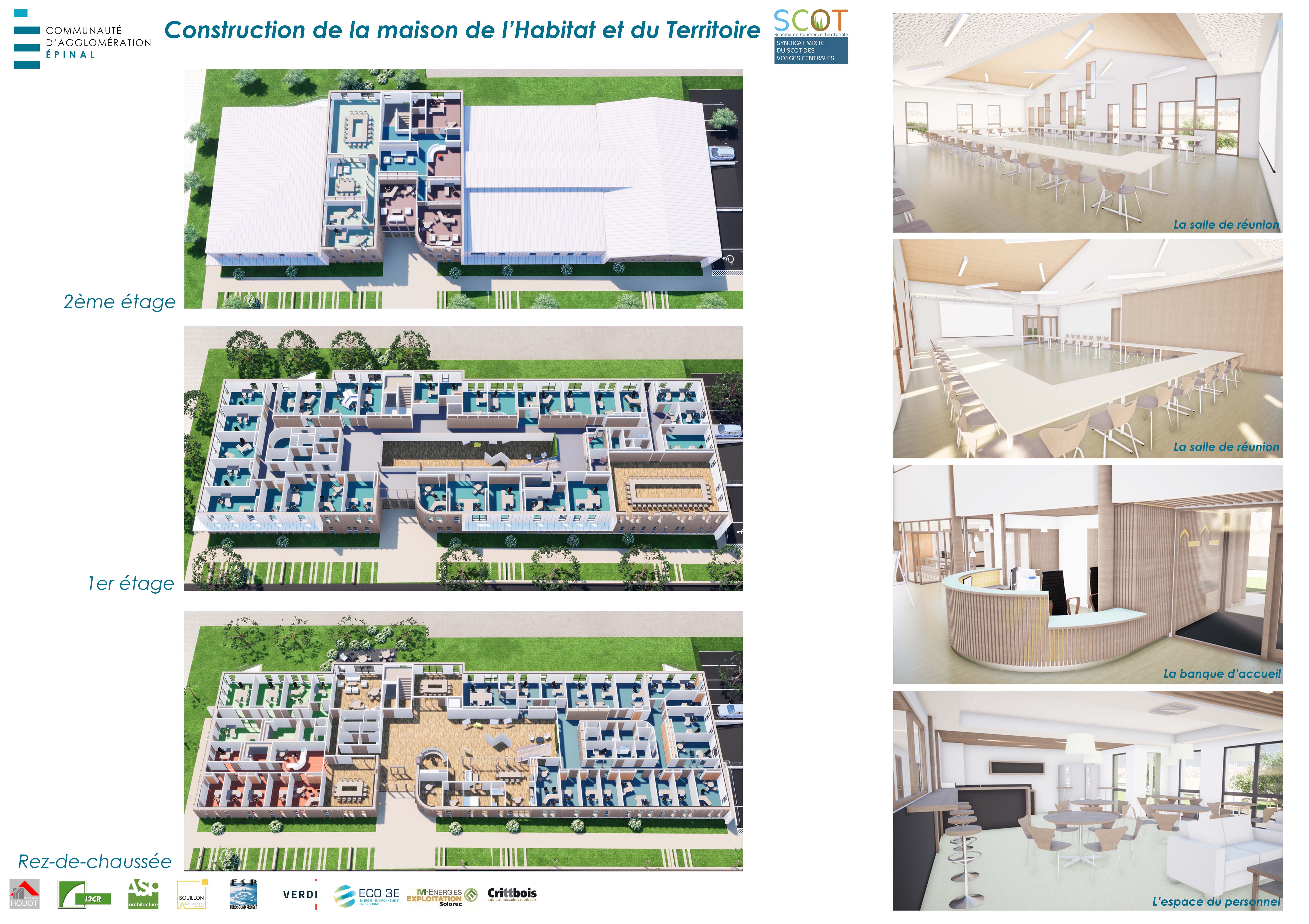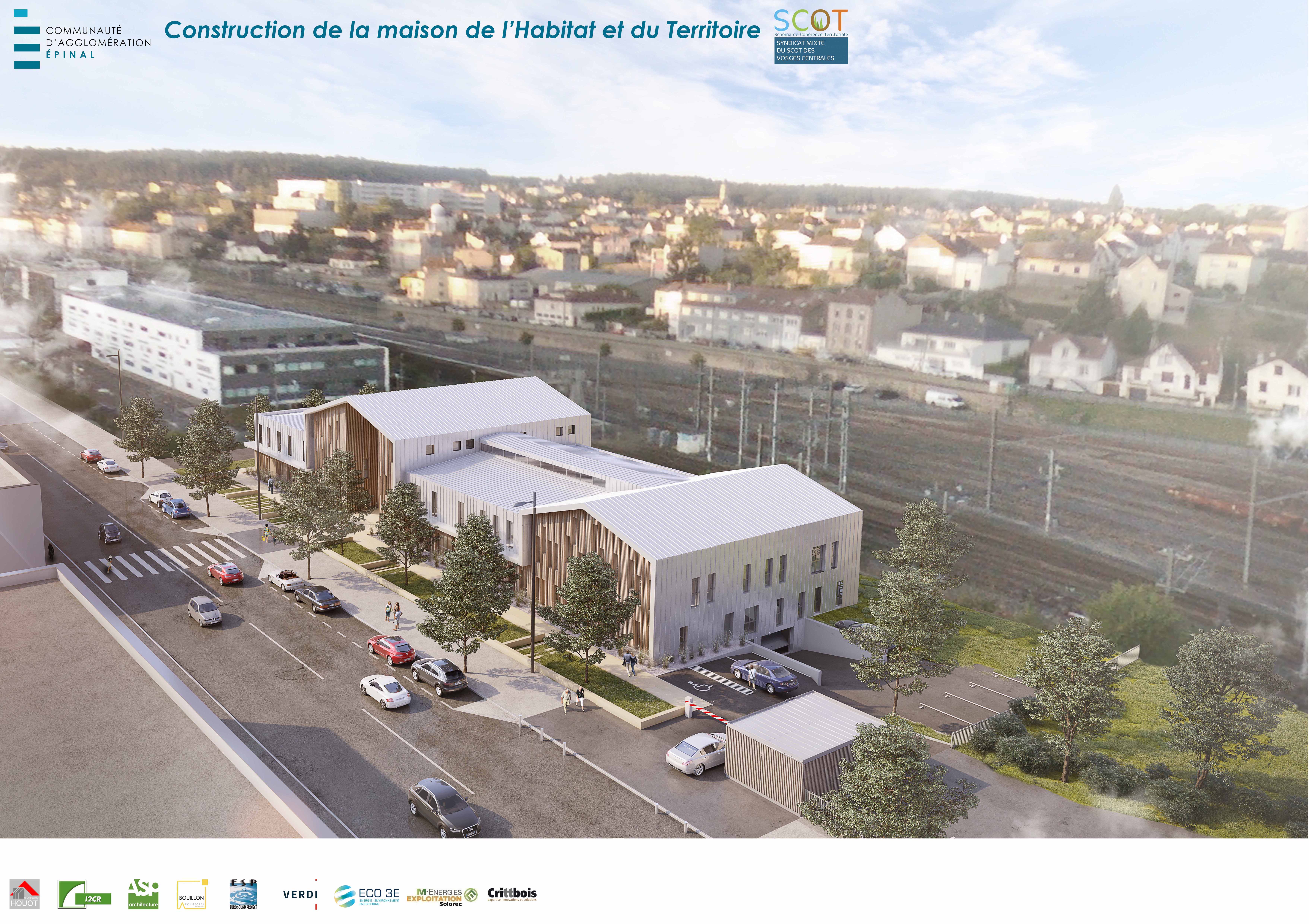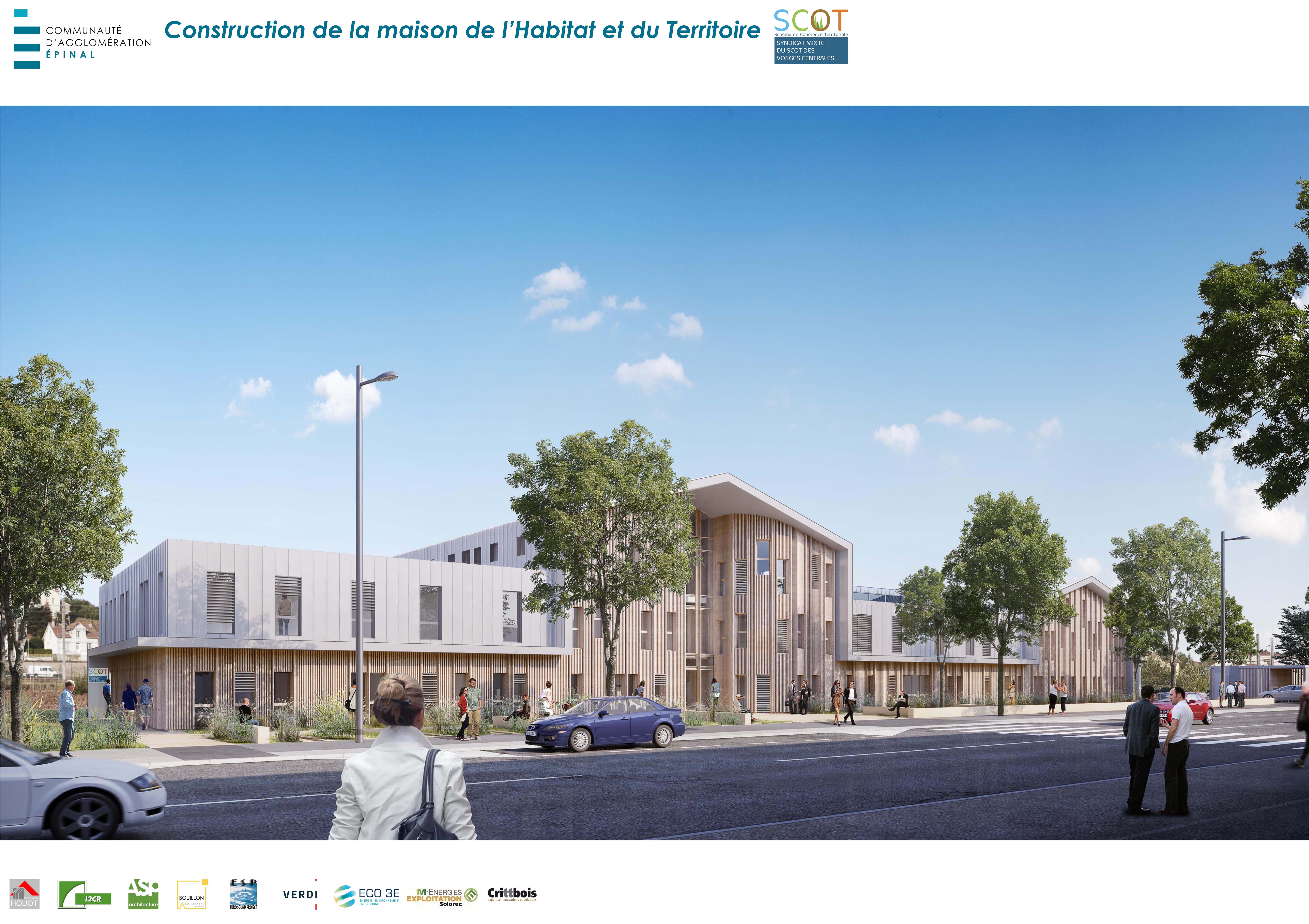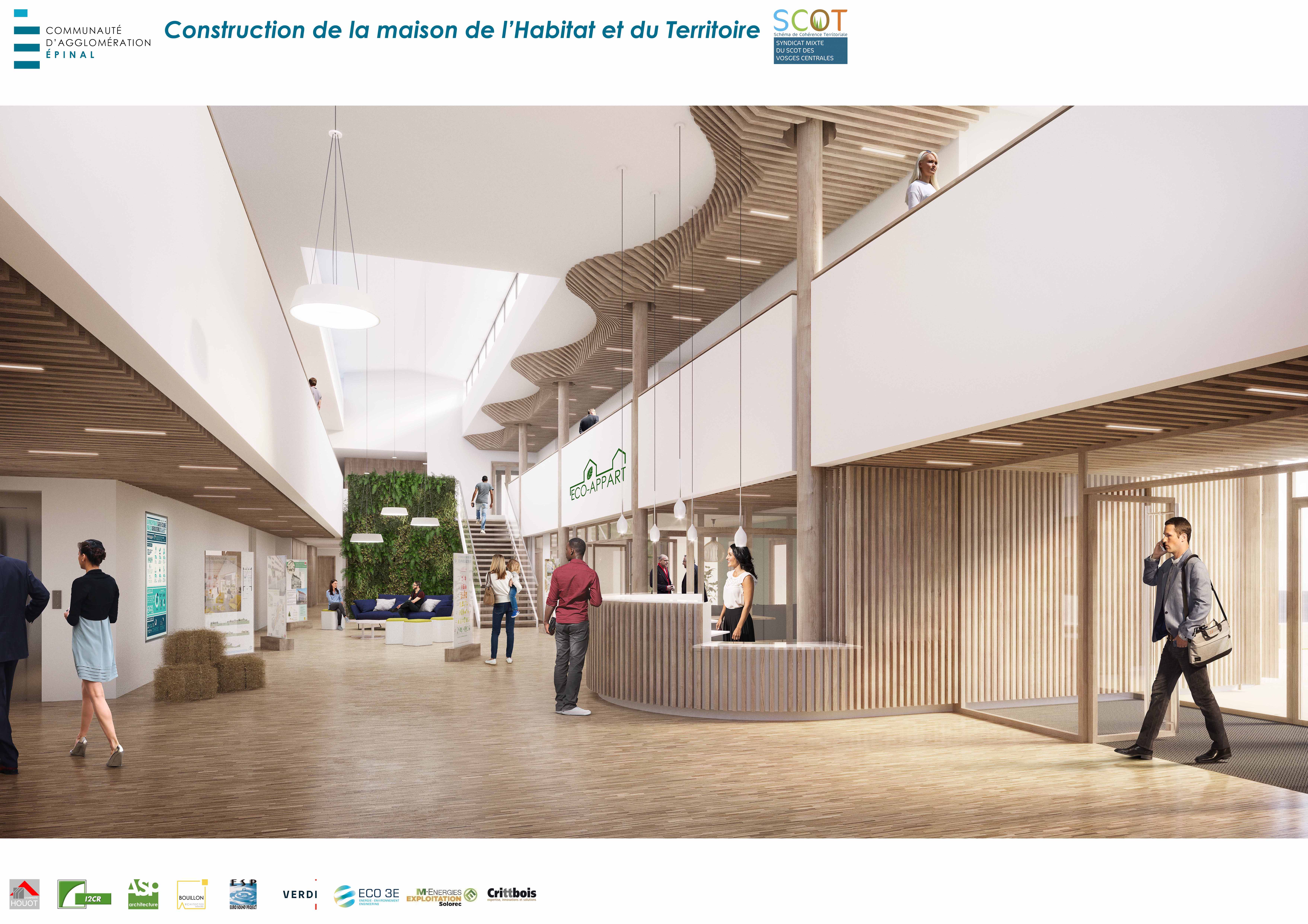 La Maison de l'Habitat et du Territoire prend place sur un axe majeur à proximité de la gare. Elle propose une image affirmée et valorisante immédiatement identifiable. Évoquant librement les toits protecteurs familiers, la skyline du bâtiment matérialise une ligne continue et dynamique tel un électrocardiogramme urbain. Ce bâtiment ouvert au public sur 3 niveaux, convivial, lumineux et sain, est un véritable démonstrateur de la construction locale et écologique. À l’intérieur, structures et menuiseries bois sont associées pour dessiner les volumes et caractériser les espaces et les ambiances.