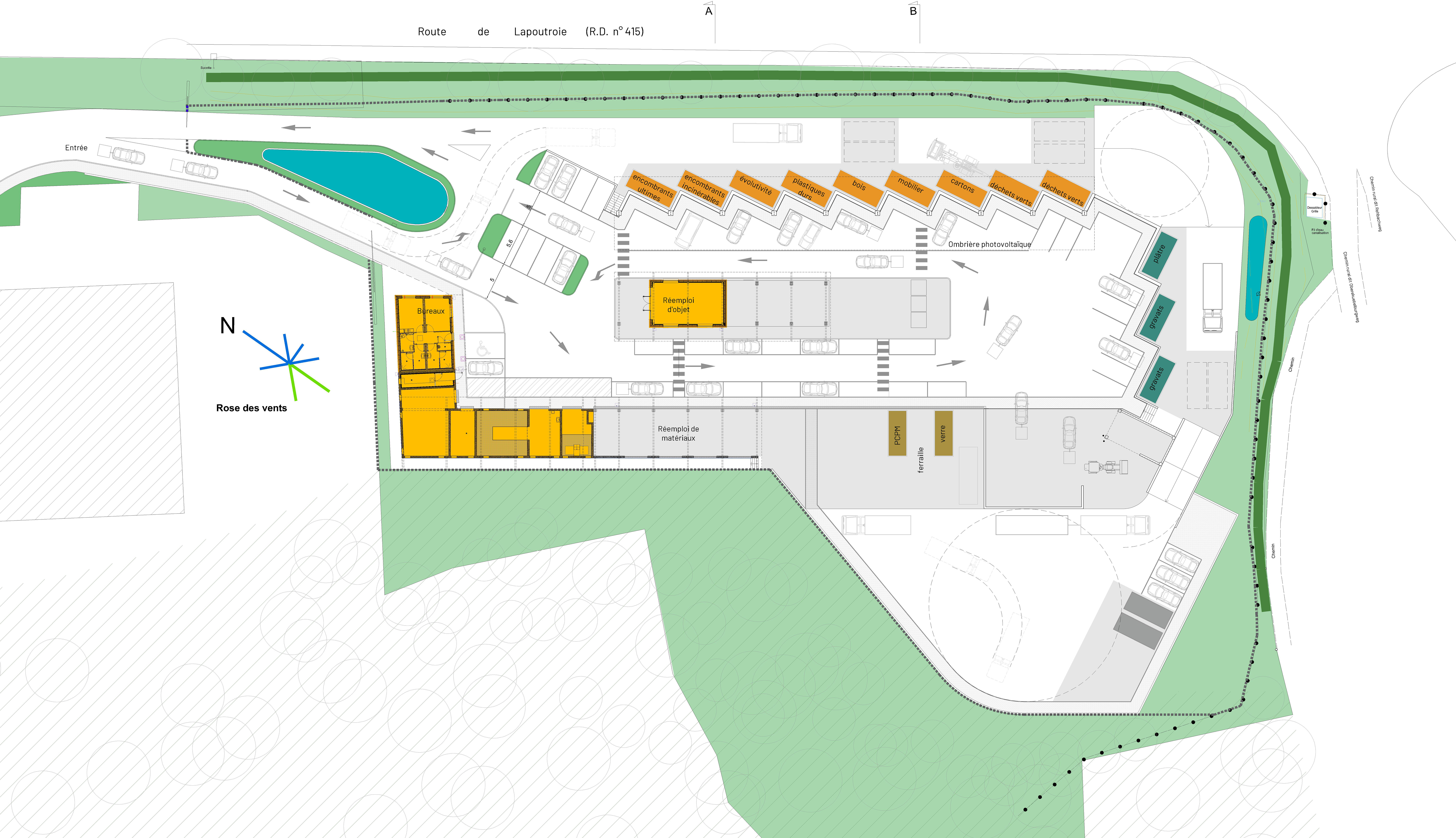 Le terrain se situe dans la vallée de Kaysersberg le long de la RD 415 à proximité du cœur de ville. La déchèterie existante s’adosse contre un versant très pentu exposé Nord-Est. La déchèterie, construite en 1998, ne répondait plus à la règlementation en vigueur et a souhaité réaliser une réhabilitation complète avec reconstruction de 12 quais, 2 alvéoles, bâtiments DEEE et DMS et l'ajout d'un pôle recyclerie. Ce dernier comprend un bâtiment pour proposer du réemploi d’objets et une plateforme abritée dédiée au réemploi de matériaux.