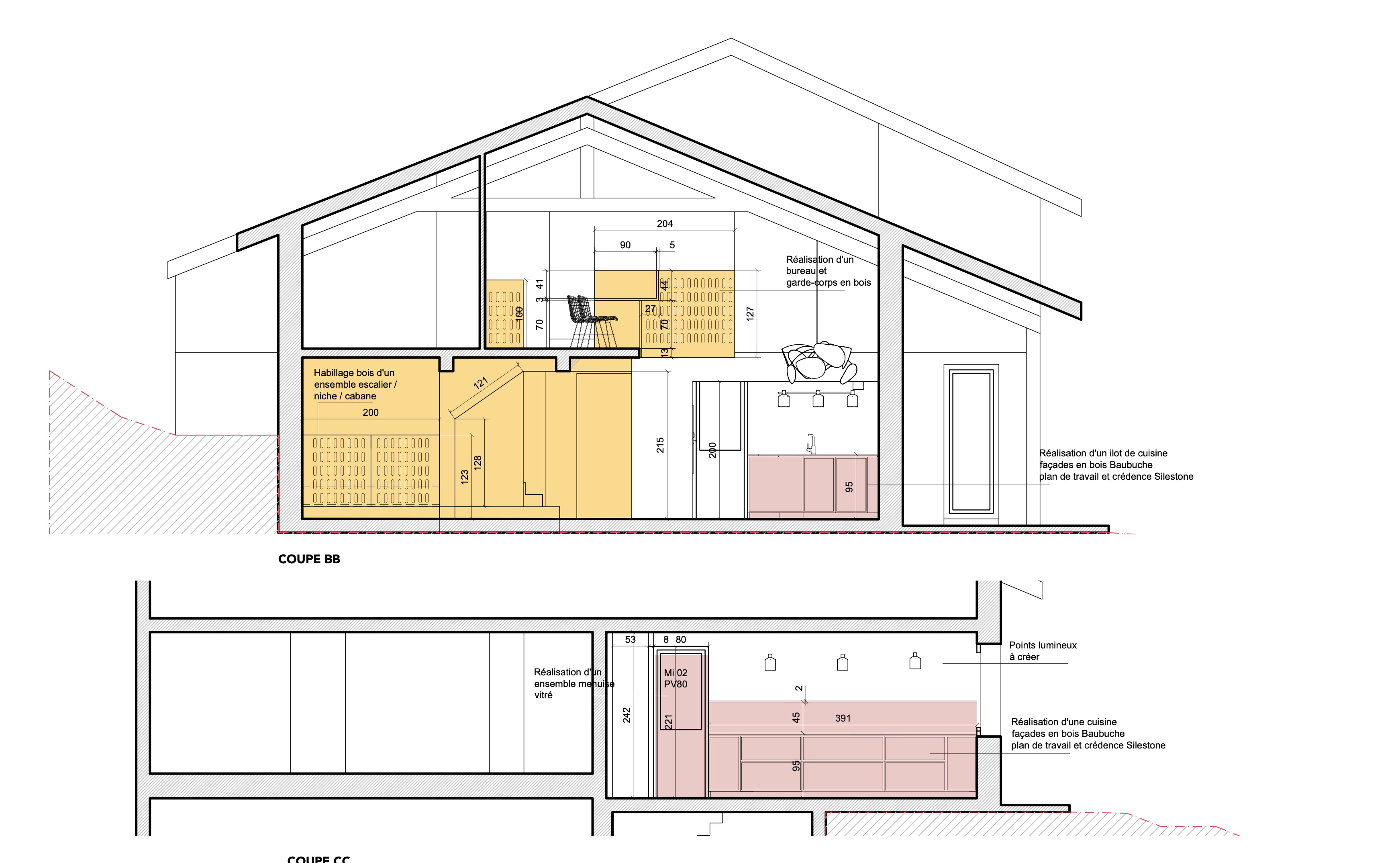 Descriptif technique de l'aménagement : Mise en oeuvre originale des panneaux BauBuche pour les façades de la cuisine + cadre hêtre pour manipulation des portes Déclinaison des panneaux contreplaqué de Bouleau pour habiller l'escalier existant et créer un bureau en porte-à-faux sur le vide sur salon