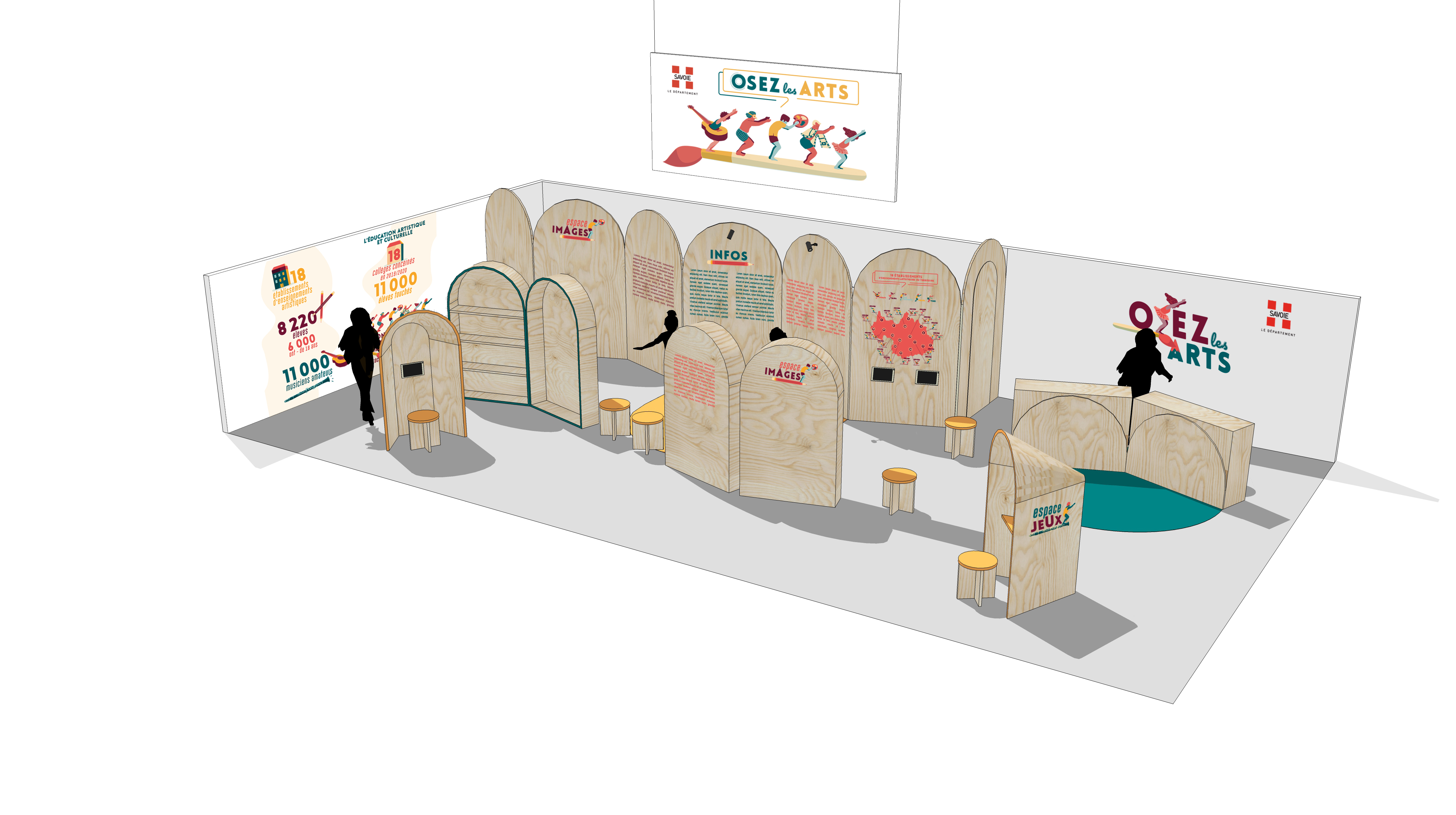 Spécialement conçu pour la Foire de Savoie 2021, ce stand est pensé tel un décor de théâtre à l’italienne. Il est composé d’éléments en bois en panneaux de contreplaqué de Pin, de différentes hauteurs se succédant dans l’espace et créant un effet de perspective. Tantôt paravent, tantôt coffre ou encore cabine, les meubles proposés participent, par leurs dispositions dans l’espace, à l’accueil visuel du public et aux circulations dans le stand. Ses formes rondes font référence aux arcades des grandes places des villes européennes, lieux de manifestations culturelles et festives.