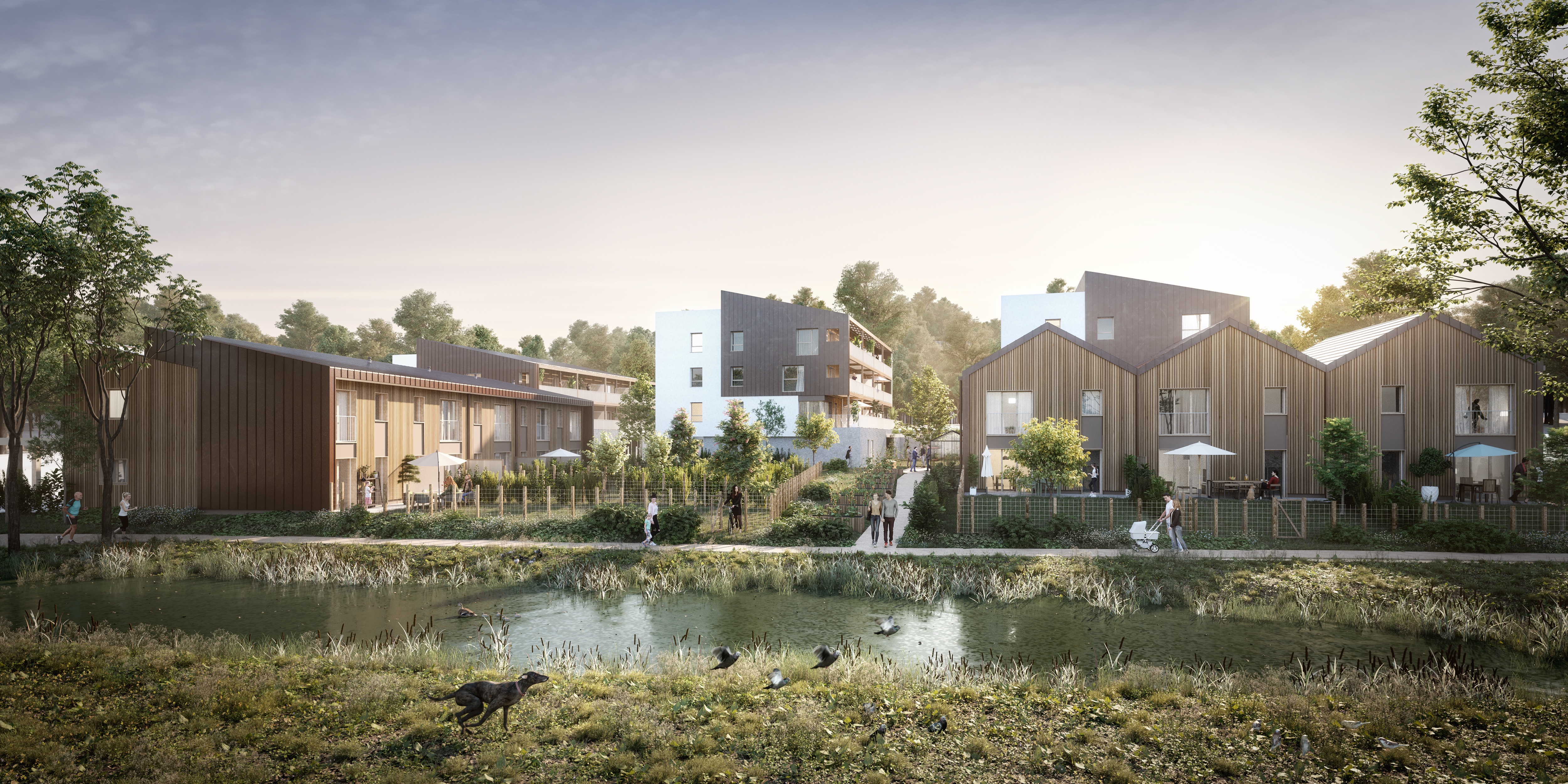Approche environnementale : Conception dans la visée d'un E2C2 et labelisation Passivhaus. Construction mixte bois/béton avec mise en oeuvre de façades ossature bois préfabriquées. Energies : 3 Chaufferies collectives pour les collectifs et ventilation double flux, Pour les maisons individuelles : poêle granulé + chauffage électrique + ballon thermodynamique et VMC simple flux. Démarche paysagère avec protection de la zone humide, continuité du corridor écologique et création coeur d'ilot partagé avec potagers, serres et jardins privatifs.