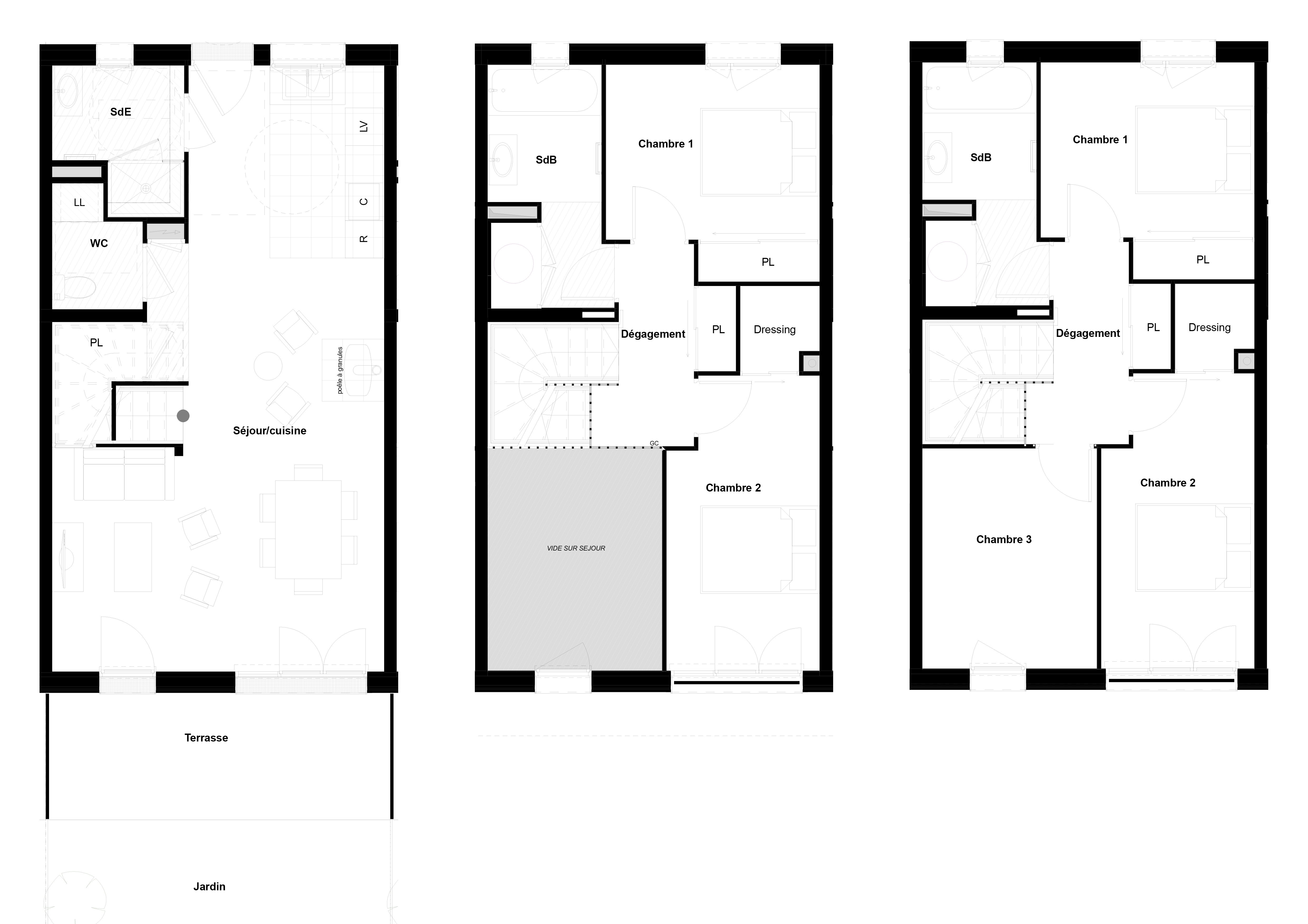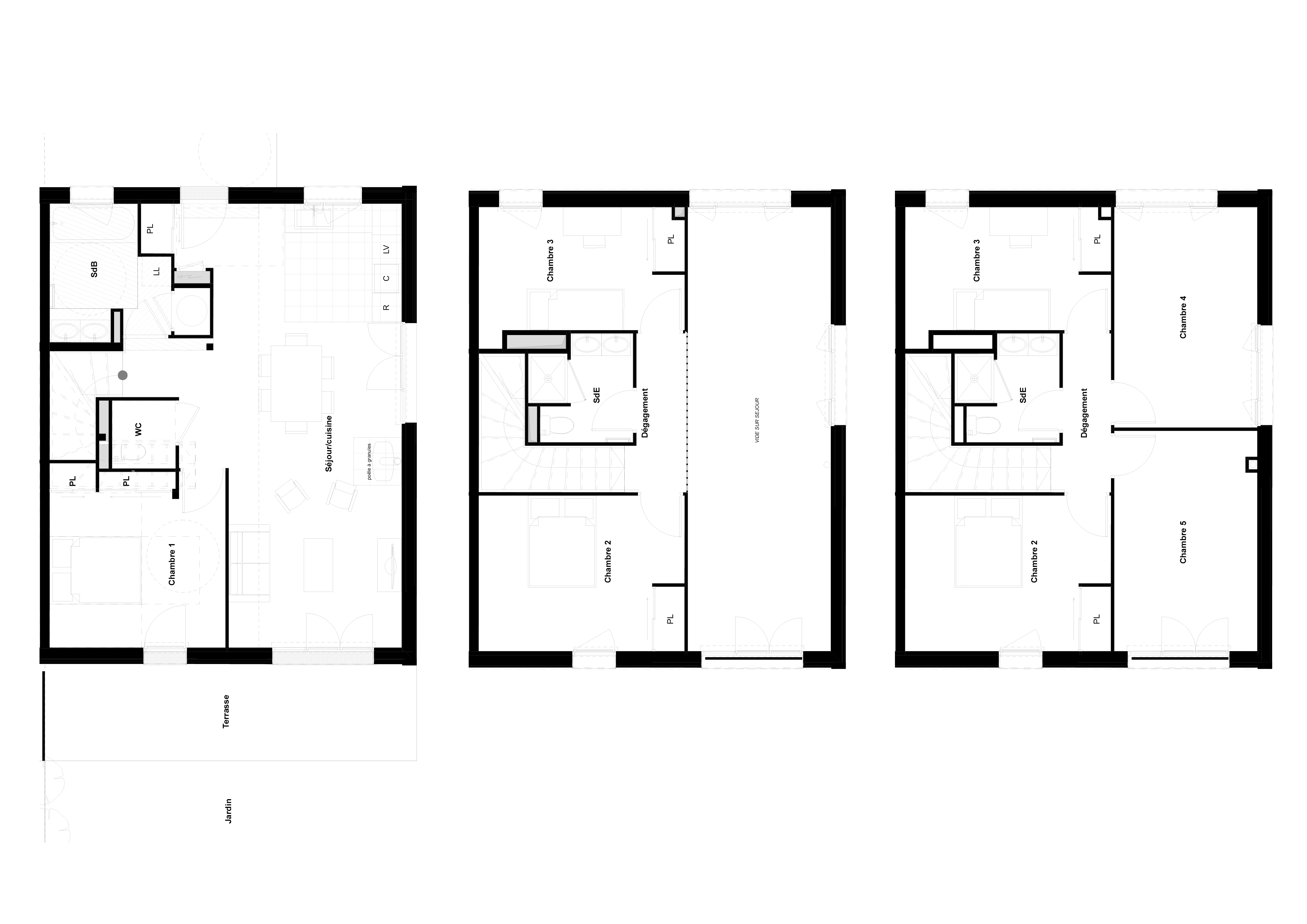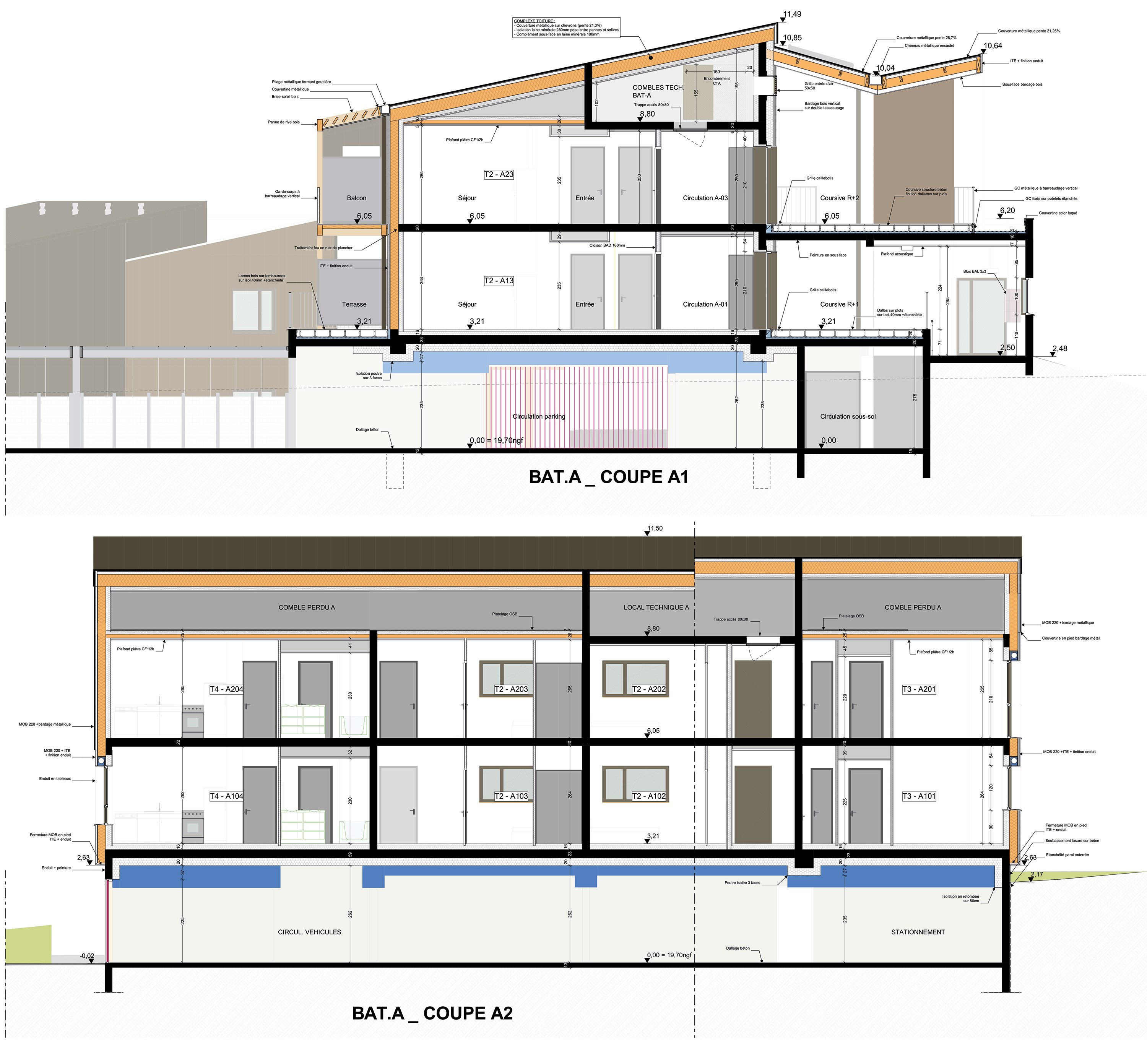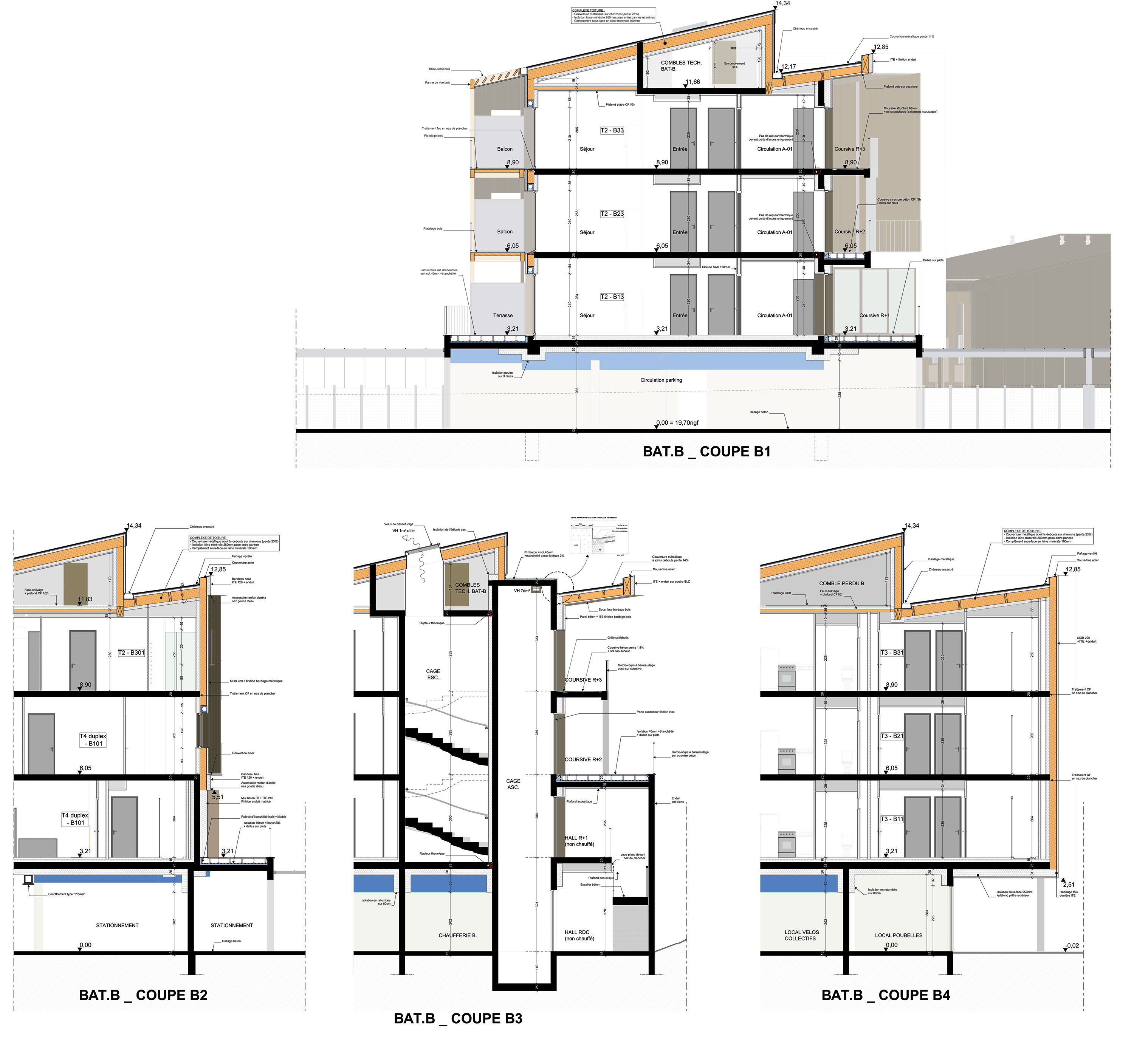 Descriptif technique : - Composition mur manteau > MOB Pour les maisons individuelles : Ossature bois massif 145mm + 145 mm laine de verre incorporé 80 mm laine de verre + plaque de plâtre en intérieur Revêtement bardage bois ORLO Pour les logements collectifs : Ossature bois massif 220mm + 220mm laine de verre incorporé 120 mm laine de verre + plaque de plâtre intérieur 40 mm de laine de bois + RPE ou Revêtement bardage bois ORLO - Balcons : lame bois, platelages bois sur lambourdes sur plots ou directement sur ossature des balcons en bois - Plancher intermédiaire maisons individuelles et combles perdus logements collectifs : solivage bois OSB + résilient phaltex + OSB 18mm + Chape et rvt (pour les maisons) ou en béton pour les collectifs - Menuiseries intérieures : menuiseries intérieures bois