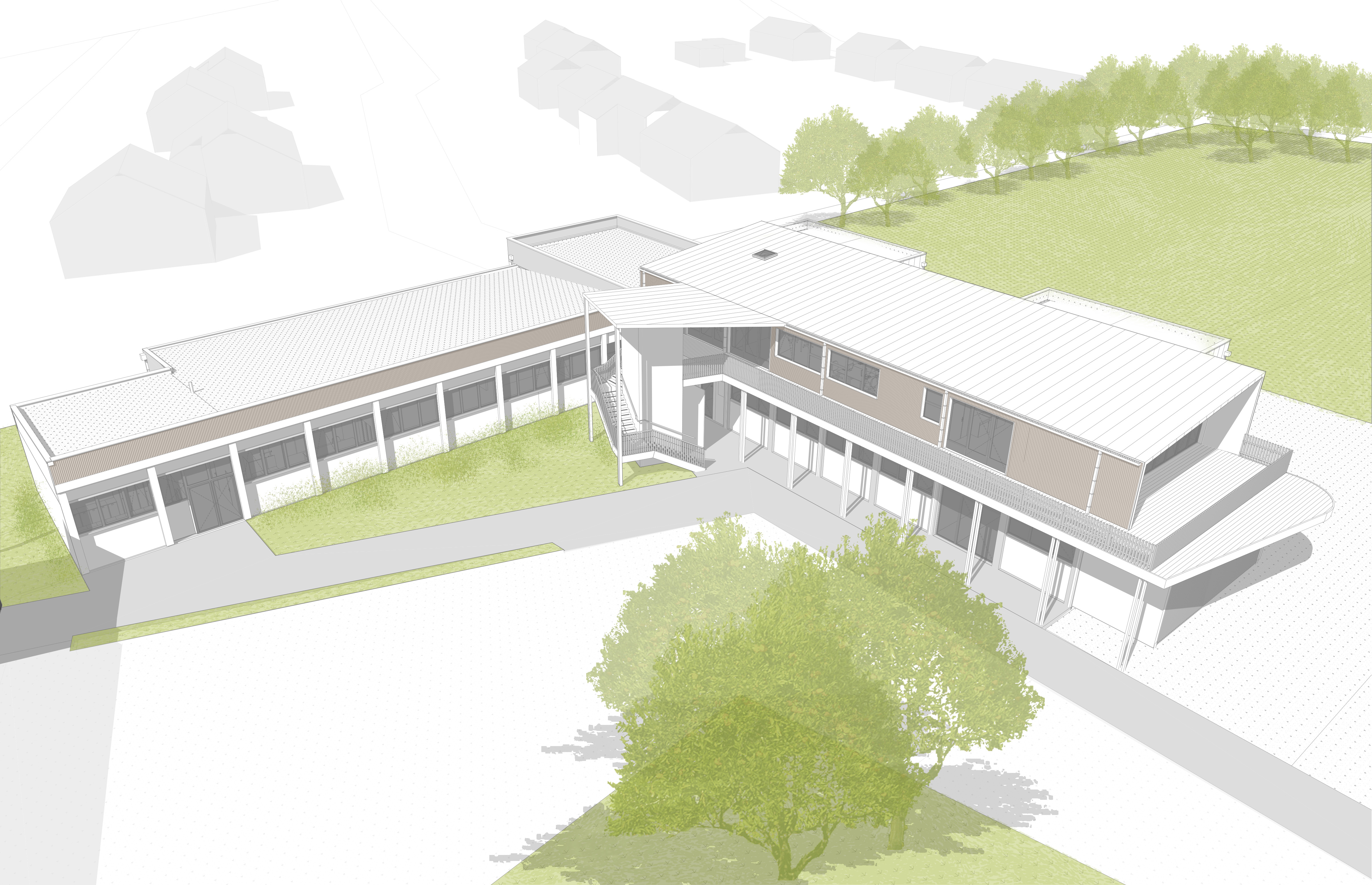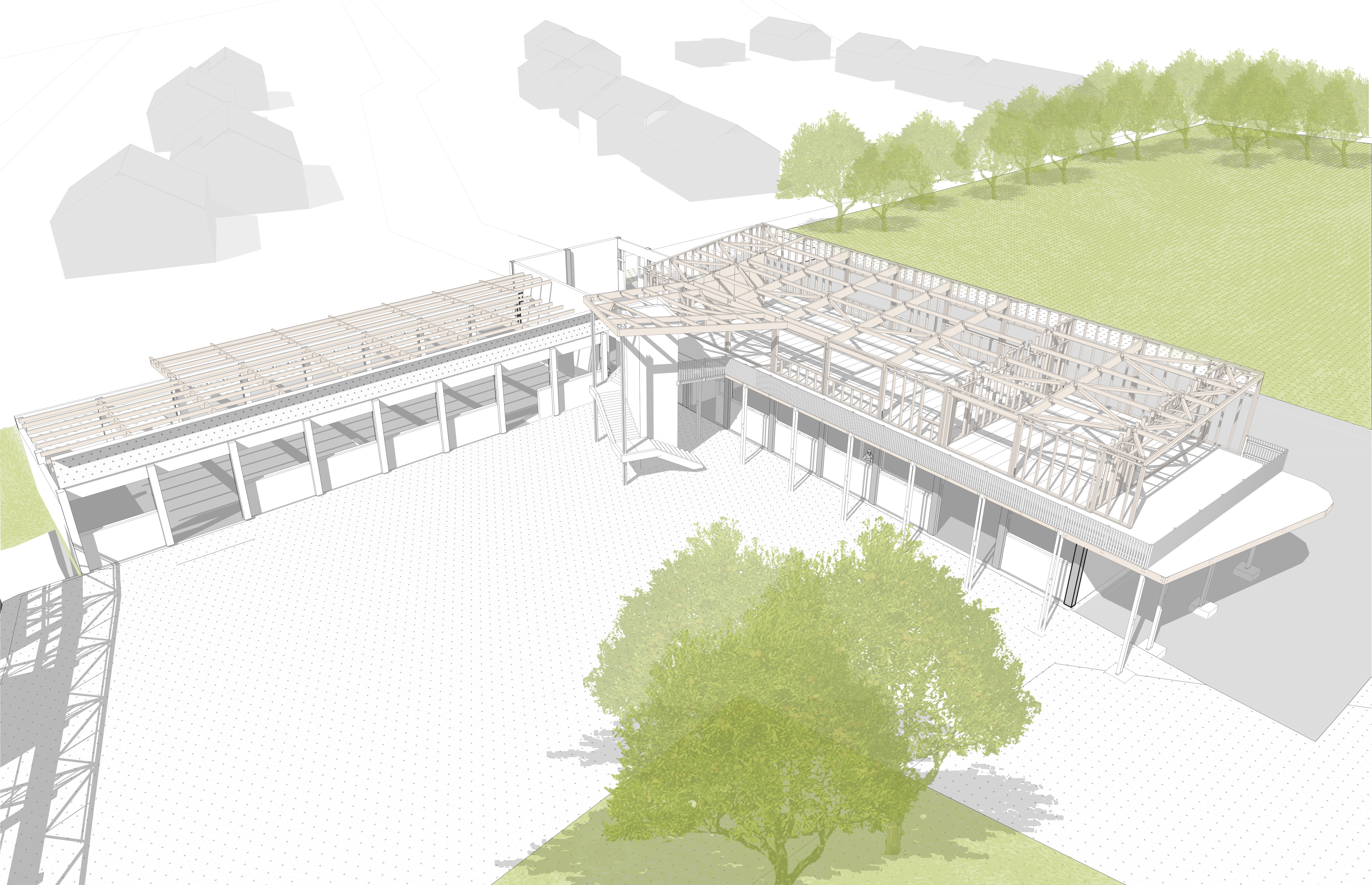 La réhabilitation de L'ESAT Etape Tournière à Carquefou s'est organisée en plusieurs phases. La blanchisserie, le CST et ensuite le SAESAT. C'est le CST qui a été surélevé pour accueillir des espaces de travail à l'étage, accessibles par l'intérieur ou par l'escalier extérieur et la coursive abritée en bois. Au rez-de-chaussée, des volumes de stockage en ossature bois ont été ajoutés au corps de bâtiment existant. Les espaces de travail sont devenus chaleureux, inclusifs, et surtout plus confortables. L'utilisation du bois a permis un chantier plus propre et une structure plus légère.