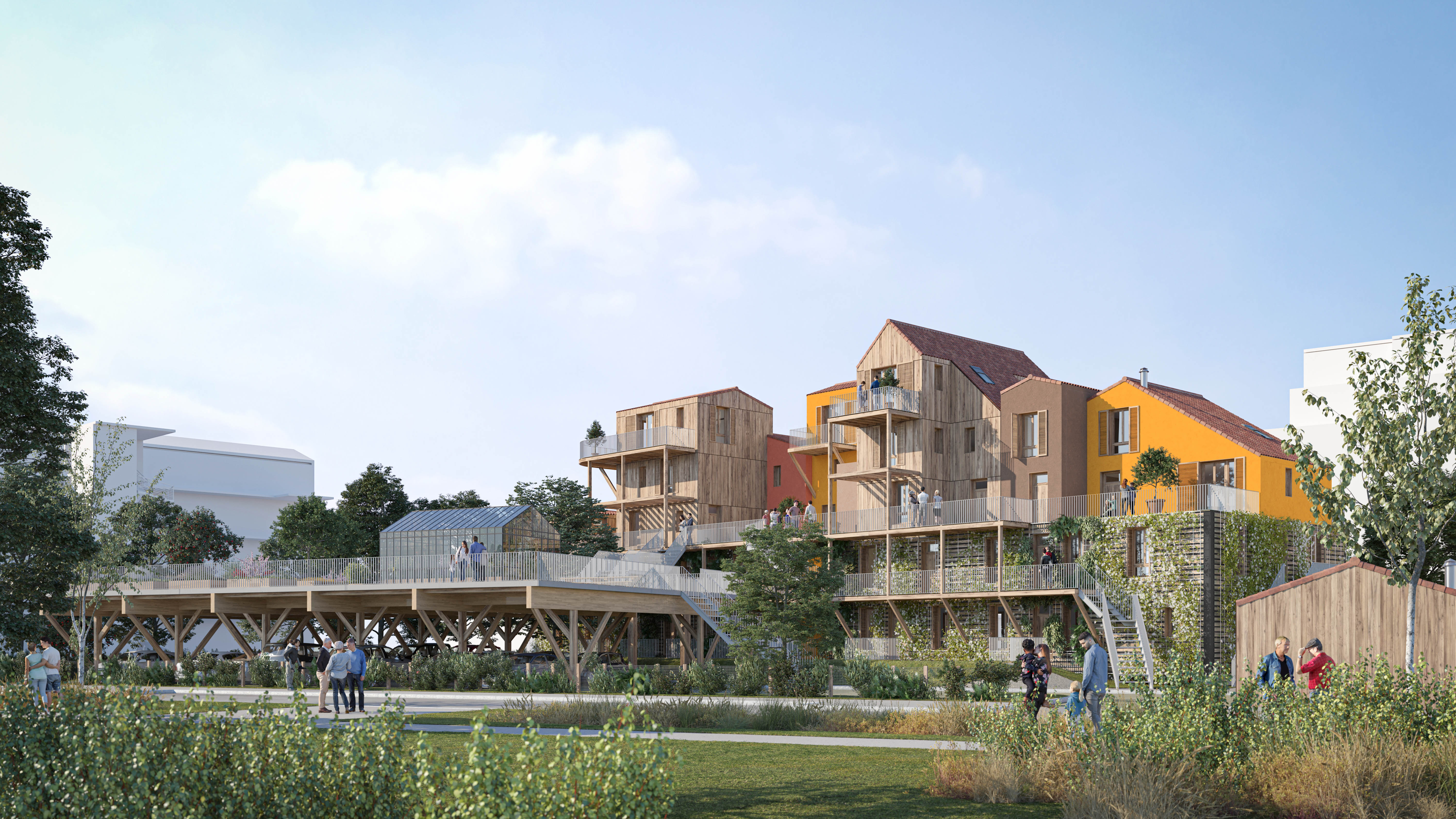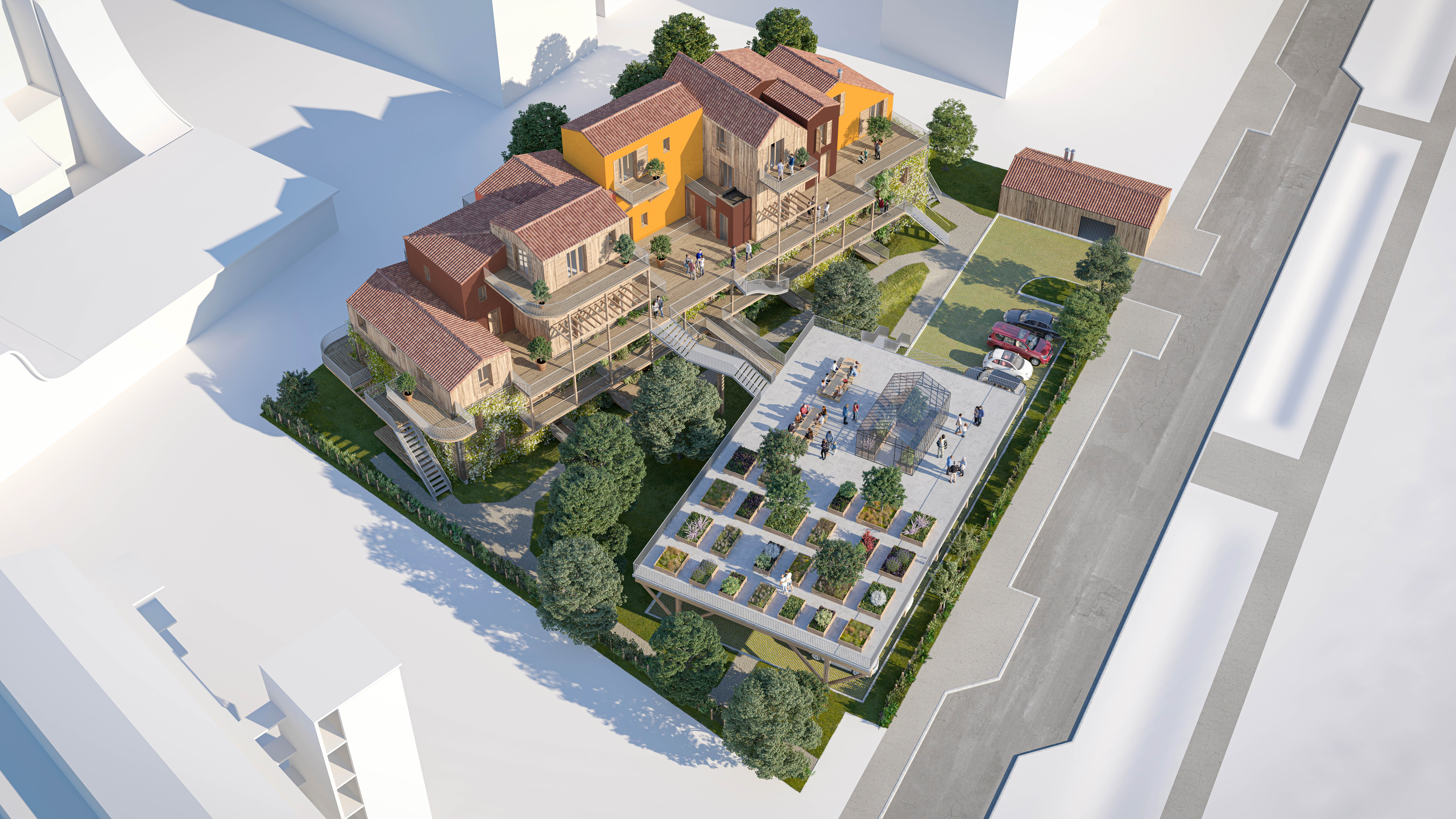 Bâtiment socle structure et bardage bois de 15 logements collectifs traversants desservis par coursives en surlargeur accueillant des jardinières avec plantations "nourricières", balcons et terrasses privatifs généreux. "Maisons sur toit -esprit village": 8 logements bi-orientés du simplex au triplex, seuils d'entrée adressés sur une "placette commune". Enduits extérieurs aux couleurs chaudes pour l'identification des maisons Parking couvert : ossature bois + plancher béton collaborant accueillant un projet co-conçu en participatif avec les habitants. Espaces extérieurs plantés "nourriciers"