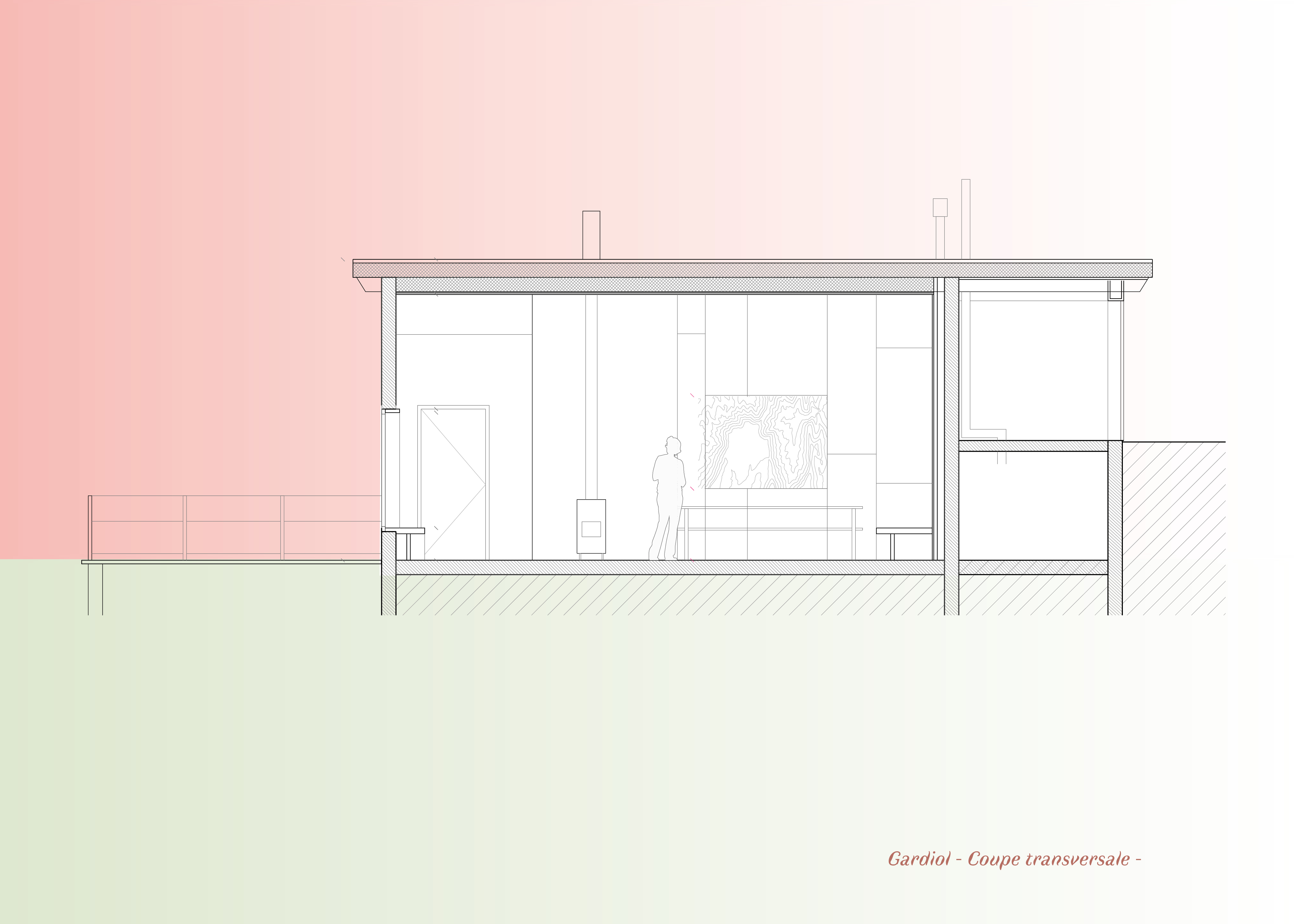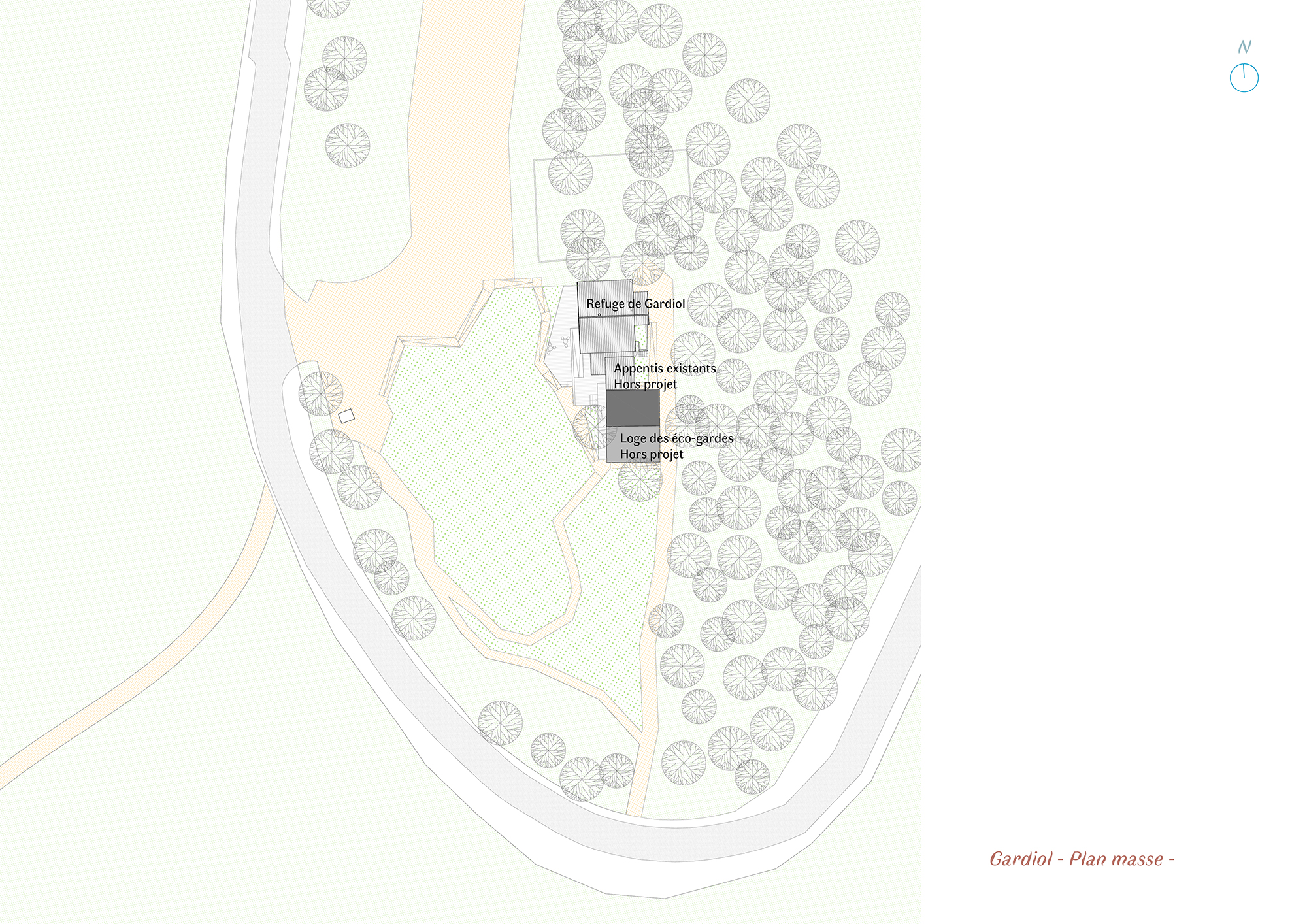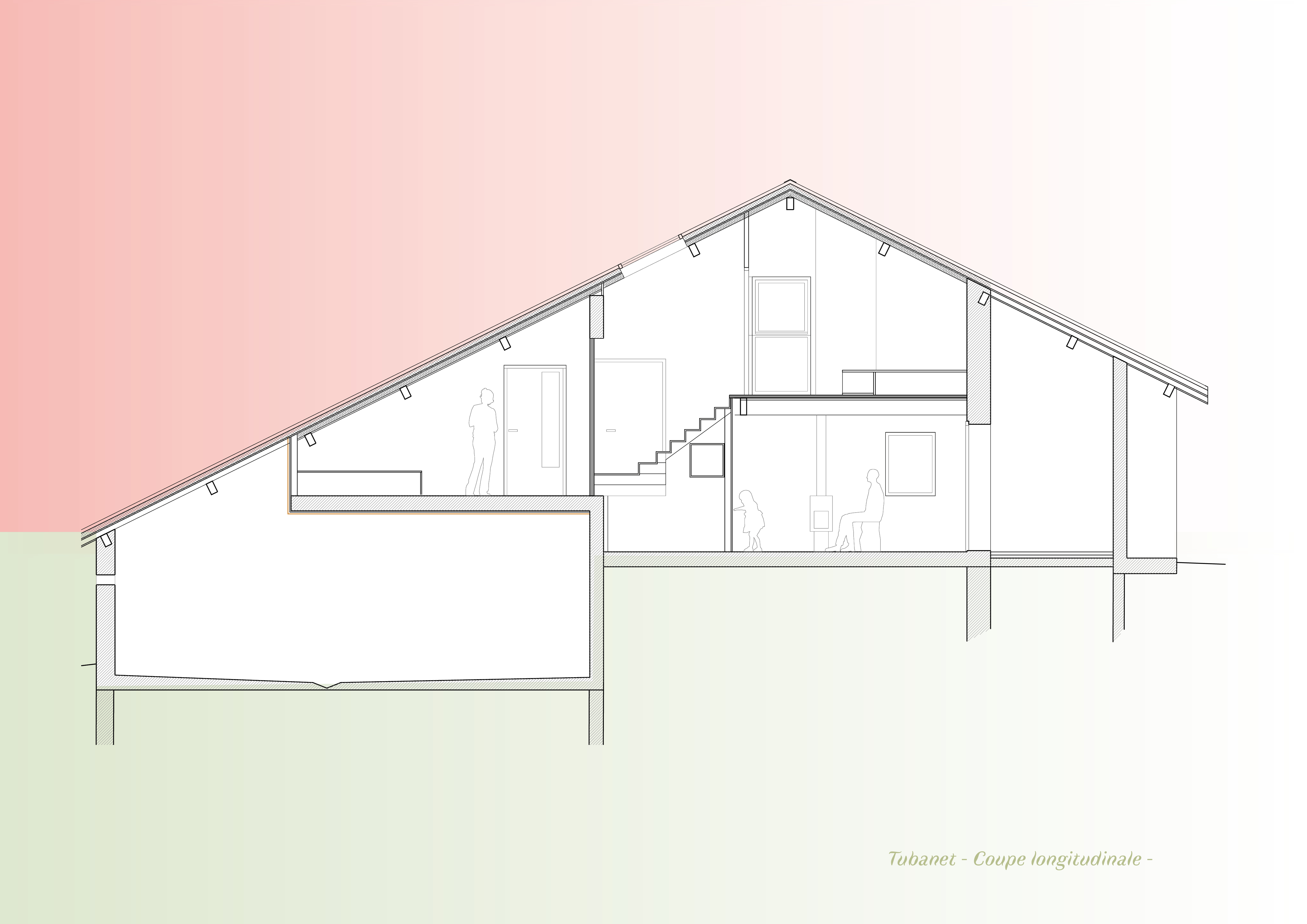 Descriptif technique de l'aménagement : Les tables et bancs sont dessiné sur mesure par l’architecte et réalisée par l’entreprise en bois local. L'eco-garde à participer au projet en fournissant des branches qui ont été utilisé pour faire des portes manteaux et patères. La cage d’escalier est habillée de planches non délignées qui donne une matérialité en lien avec les conifères qui entourent le refuge. L’escalier et les jeux d’estrades pour s’asseoir ou pour dormir intègrent des rangements astucieux. A Gardiol, une banquette bois s’accole le long d’une large ouverture et invite à la contemplation de la nature environnante.