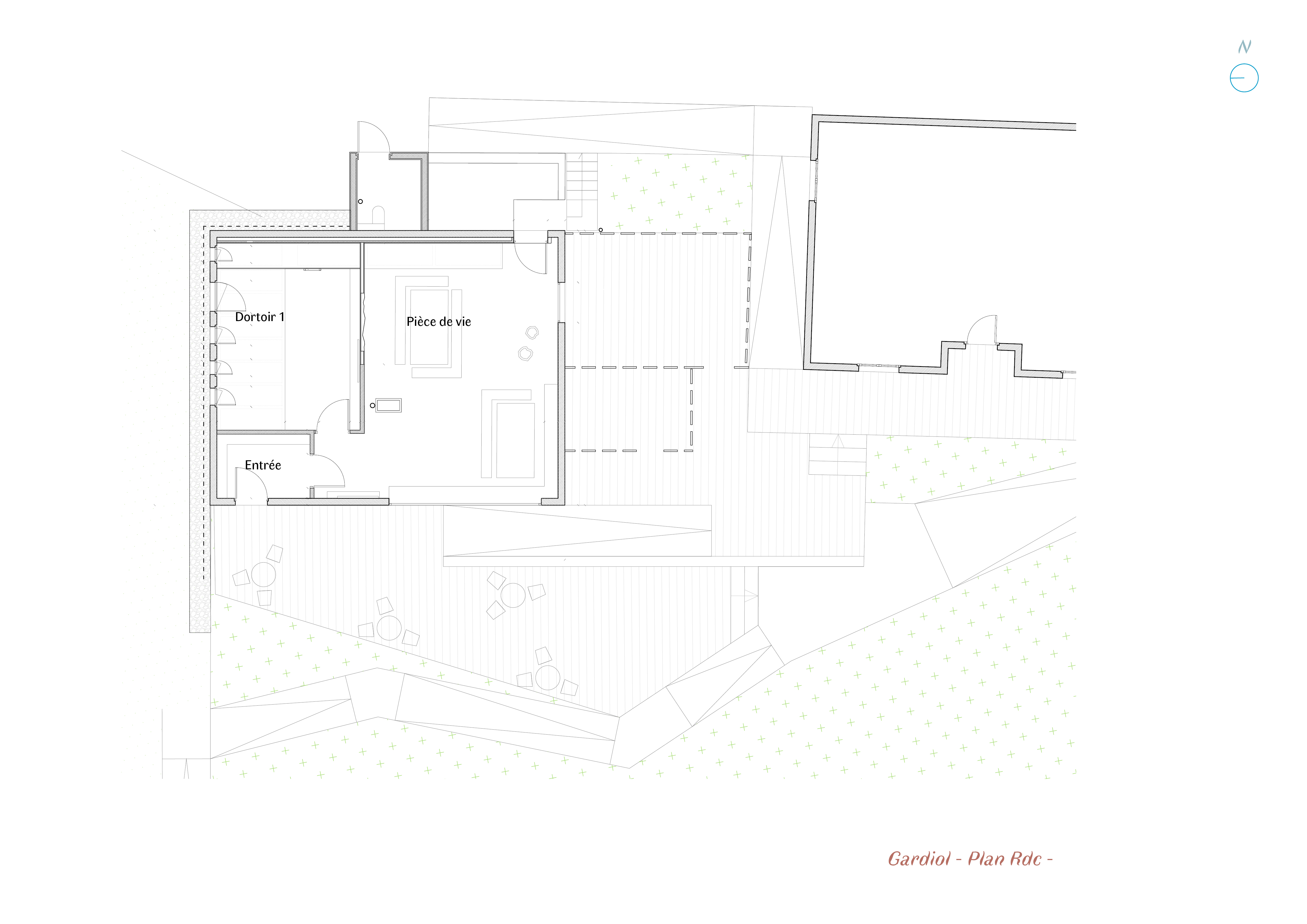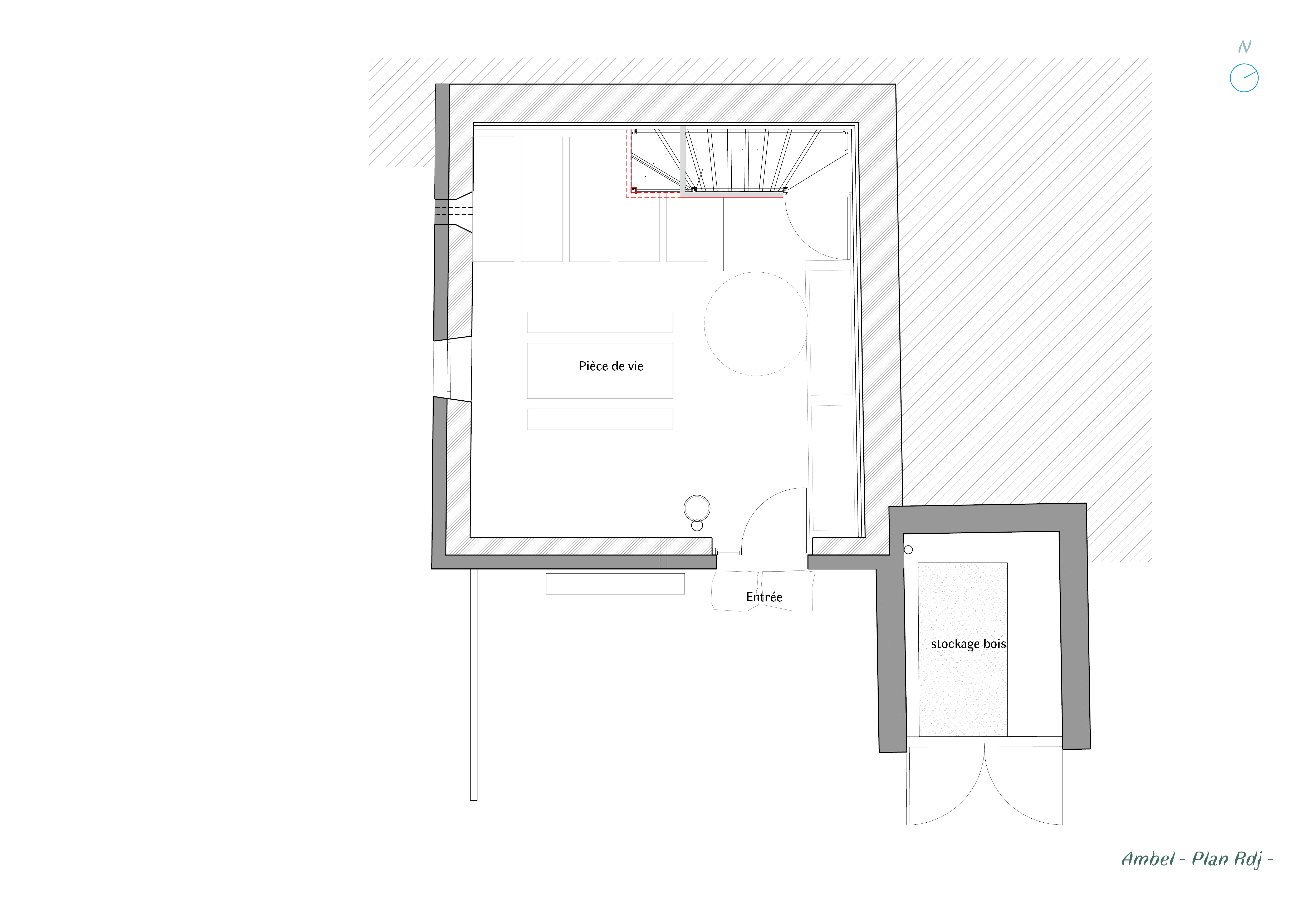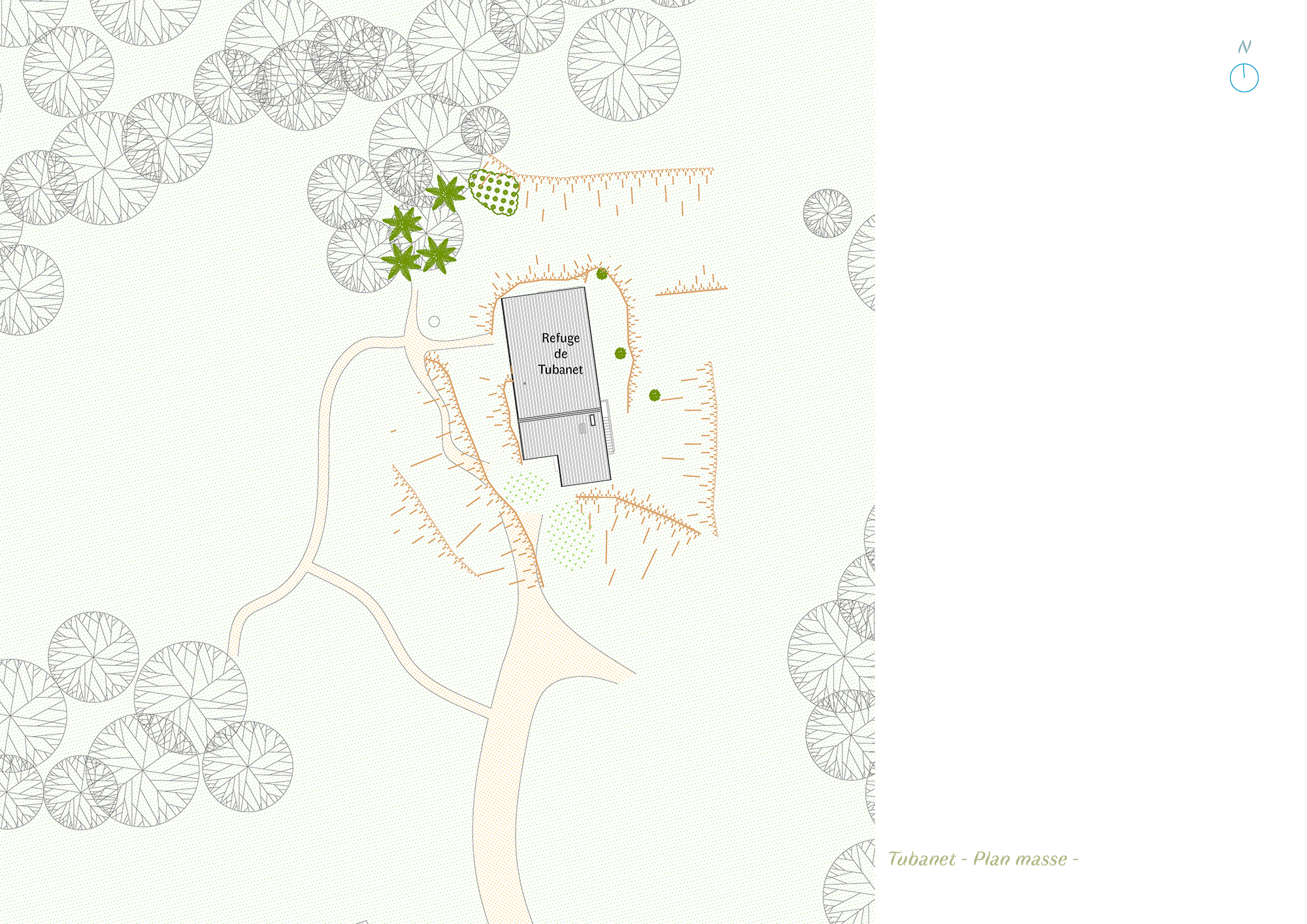 Descriptif technique de l'aménagement : Les tables et bancs sont dessiné sur mesure par l’architecte et réalisée par l’entreprise en bois local. L'eco-garde à participer au projet en fournissant des branches qui ont été utilisé pour faire des portes manteaux et patères. La cage d’escalier est habillée de planches non délignées qui donne une matérialité en lien avec les conifères qui entourent le refuge. L’escalier et les jeux d’estrades pour s’asseoir ou pour dormir intègrent des rangements astucieux. A Gardiol, une banquette bois s’accole le long d’une large ouverture et invite à la contemplation de la nature environnante.