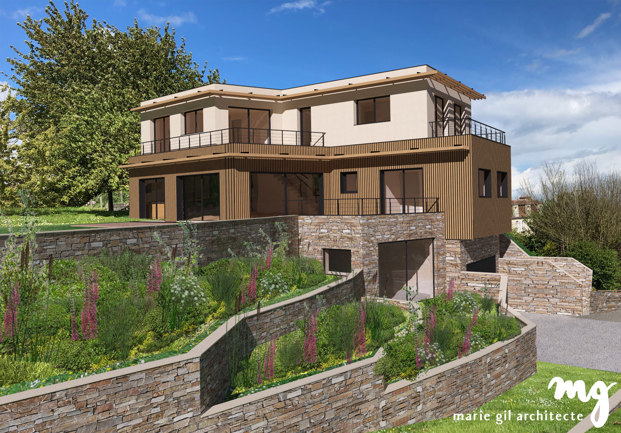 Le projet de construction s'implante sur une parcelle pentue, en grande partie non constructible, et située dans une zone de carrière - sa forme particulière découle des nombreuses contraintes du terrain. Le projet consiste à construire une maison passive contemporaine, peu énergivore, conçue avec de matériaux durables, avec des vues dégagées sur le terrain et sur la plaine de Caen.
