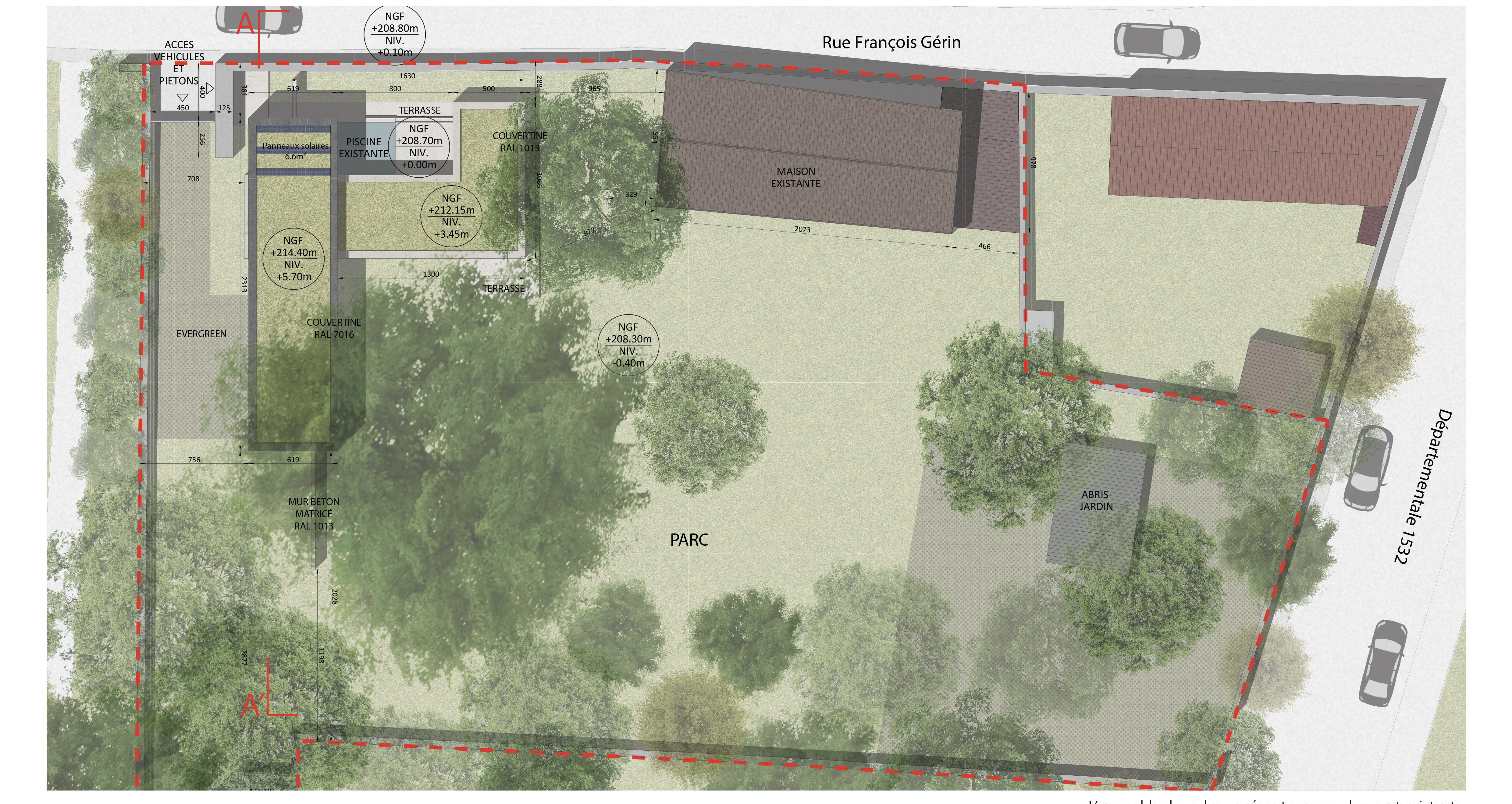 Approche environnementale : L'étude thermique et une fine approche des ombres portés de la masse végétale des arbres du parc a permis d'imaginer des espaces traversant, de démultiplier les surfaces vitrées du rdc sans nécessité de protections solaires et de créer ainsi une architecture bioclimatique dans sons sens primitif: lumière et ventilation naturelle omniprésente pour chaque espace, fraicheur des sols en béton quartzé et planchers chauffant, eau chaude sanitaire solaire et poêle à granule assurent un confort optimal.Un jeu sur des volumes très simples permettent au parc de se glisser en douceur sous la construction.