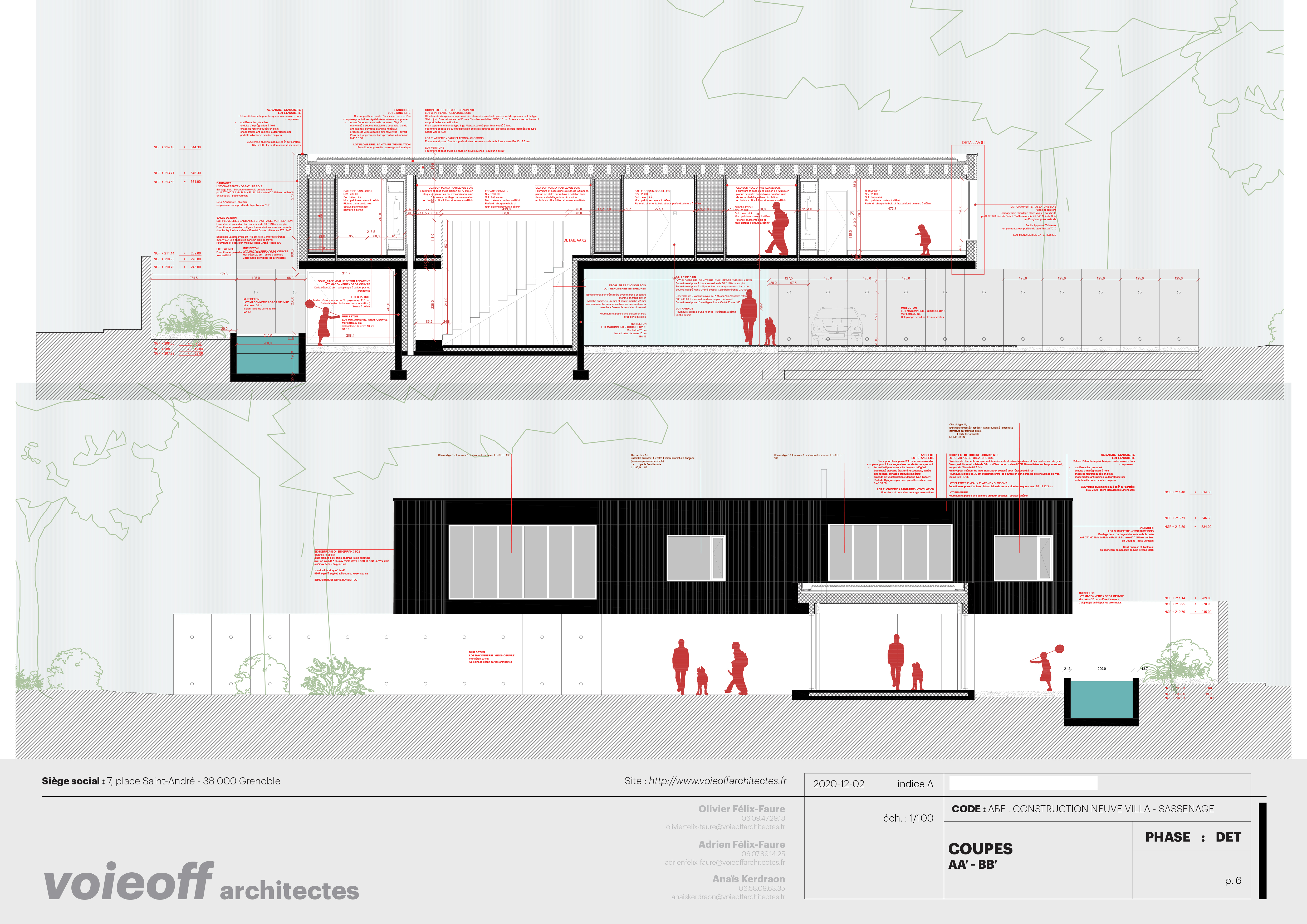 Les clients habitent une magnifique propriété, havre de verdure et de fraicheur au pied du Vercors dans une belle bâtisse en pierres. Ils souhaitent construisent une villa très contemporaine dans le parc, sans en bouleverser l'harmonie. Le plan est pensée en "L" autour du merveilleux cèdre du japon bicentenaire instaurant un dialogue en 3 dimension avec celui-ci. Espaces de vies de plein-pied et béton brut à rdc sur lequel pivote en formant pont habritant les stationnements et entrées à couvert, le volume des chambres sobre, tout de bois brulé vétu et se fondant dans l'ombre des branchages