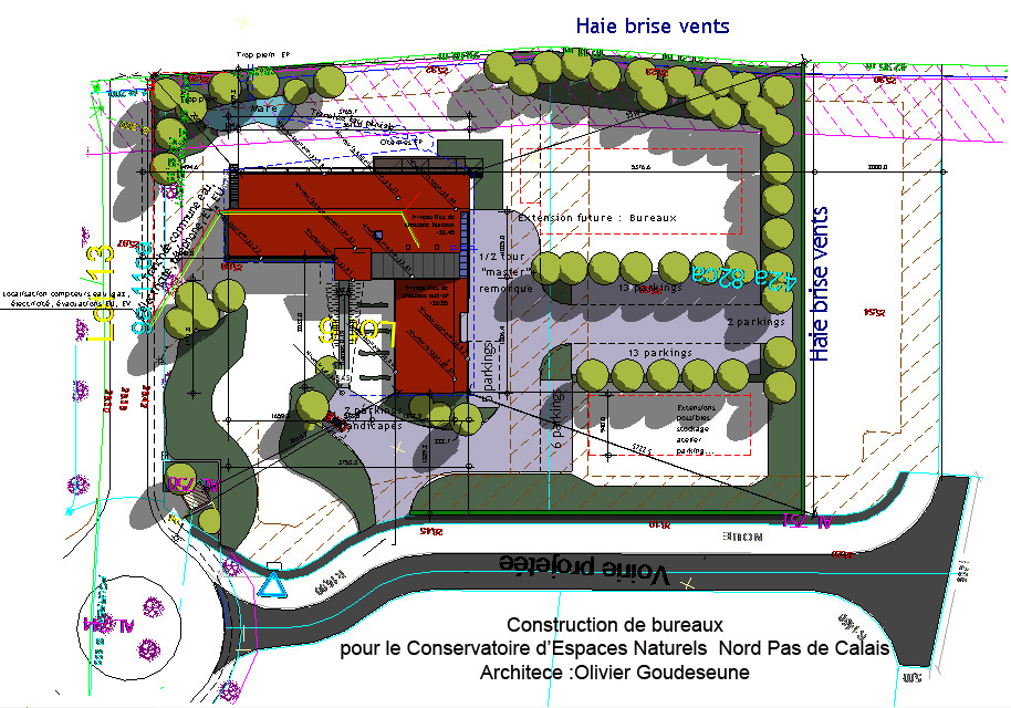 Approche environnementale : A la demande du maitre d'ouvrage, spécialisé dans la protection de l'environnement, les essences de bois ont été choisies parmi les espèces feuillues indigènes. La simulation thermique dynamique a validé les besoins d' inertie complémentaires (en briques de terre crue noyées dans les cloisons), les longueurs de débord de toits, la pergola au sud,la qualité des vitrages suivant l'orientation et enfin les screens sur les façades Ouest et Nord ouest pour éviter les surchauffes estivales. Une citerne d'eau pluviale de 20 000 litres(lavage des véhicules et les sanitaires) est implantée dans le jardin. Le parking est cerné par une butte brise vent.