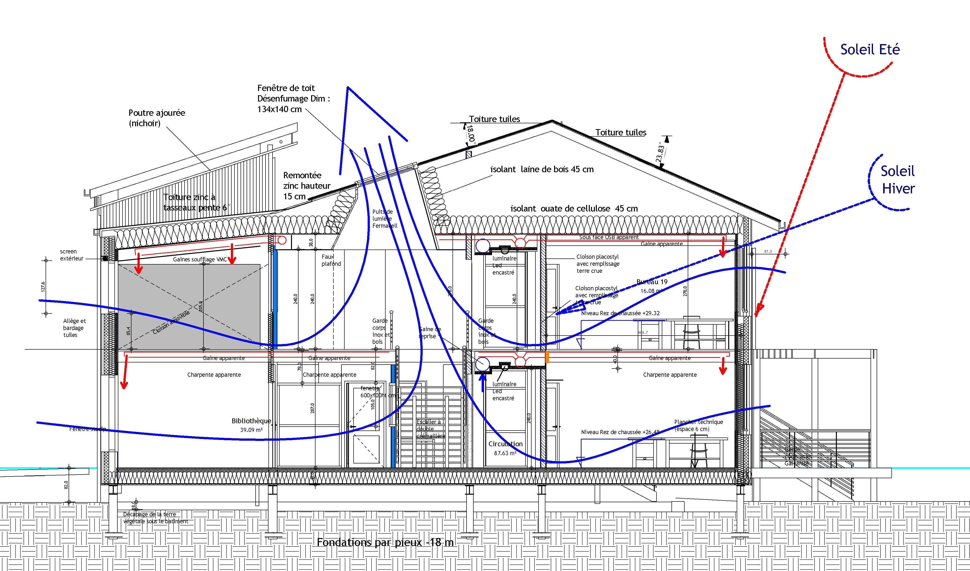 Descriptif technique : La structure principale en poteaux poutres est composée d'éléments en lamellé collé de chêne.Elle permet la transformation ultérieure des bureaux. Des essais au FCBA pour la caratérisation du lamellé collé chêne ont été réalisés pour obtenir les garanties nécessaires . Les matériaux d'isolation sont bio sourcés; le sol du rez de chaussée en liège (35 cm), les murs en laine de bois (30 cm), les combles en ouate de cellulose (45 cm). Les murs intérieurs sont revêtus de plaques de platre qui absorbent les COV. Les ECS sont produites par un ballon thermodynamique sur air extrait. la VMC double flux est performante.